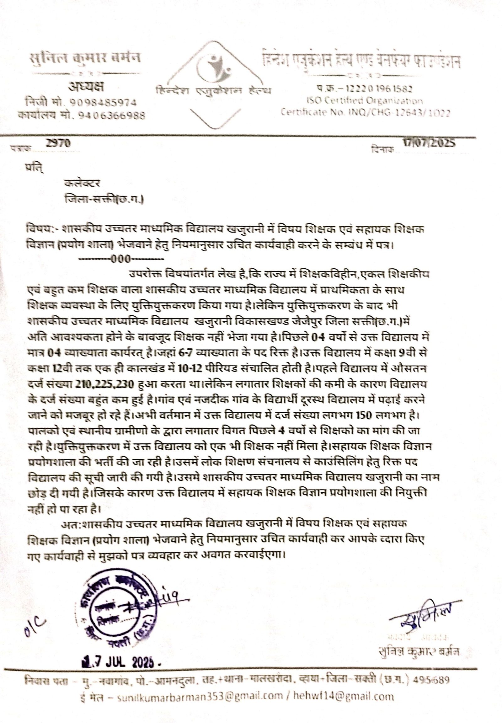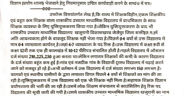 जैजैपुर(एचकेपी 24 न्यूज)।4 व्याख्याताओ के भरोसे शासकीय उच्चतर माध्यमिक विद्यालय खजुरानी का कक्षा 9 वी से कक्षा 12 वी तक की कक्षाओ का संचालन जैसे तैसे हो रहा है।7 व्याख्याताओ का पद रिक्त है।विषयवार शिक्षकों का अभाव के कारण छात्र-छात्राओं का भविष्य भगवान भरोसे है।शिक्षकों का अभाव के कारण छात्र-छात्राओं की संख्या में लगातार गिरावट आ रहा है।अति आवश्यक होने के बावजूद एक भी शिक्षक युक्तियुक्तकरण प्रक्रिया के तहत् नहीं भेजा गया है।छात्र-छात्राओं का विषयवार शिक्षक समस्या को गंभीरता से लेते हुए जिला स्तर पर छात्र-छात्राओं के शिक्षक समस्या का निराकरण करवाने आवश्यक कार्यवाही करने हिन्देश एजुकेशन हेल्थ एण्ड वेलफेयर फाउण्डेशन (रजिस्टर्ड) के अध्यक्ष सुनिल कुमार बर्मन ने कलेक्टर को पत्र लिखा है।