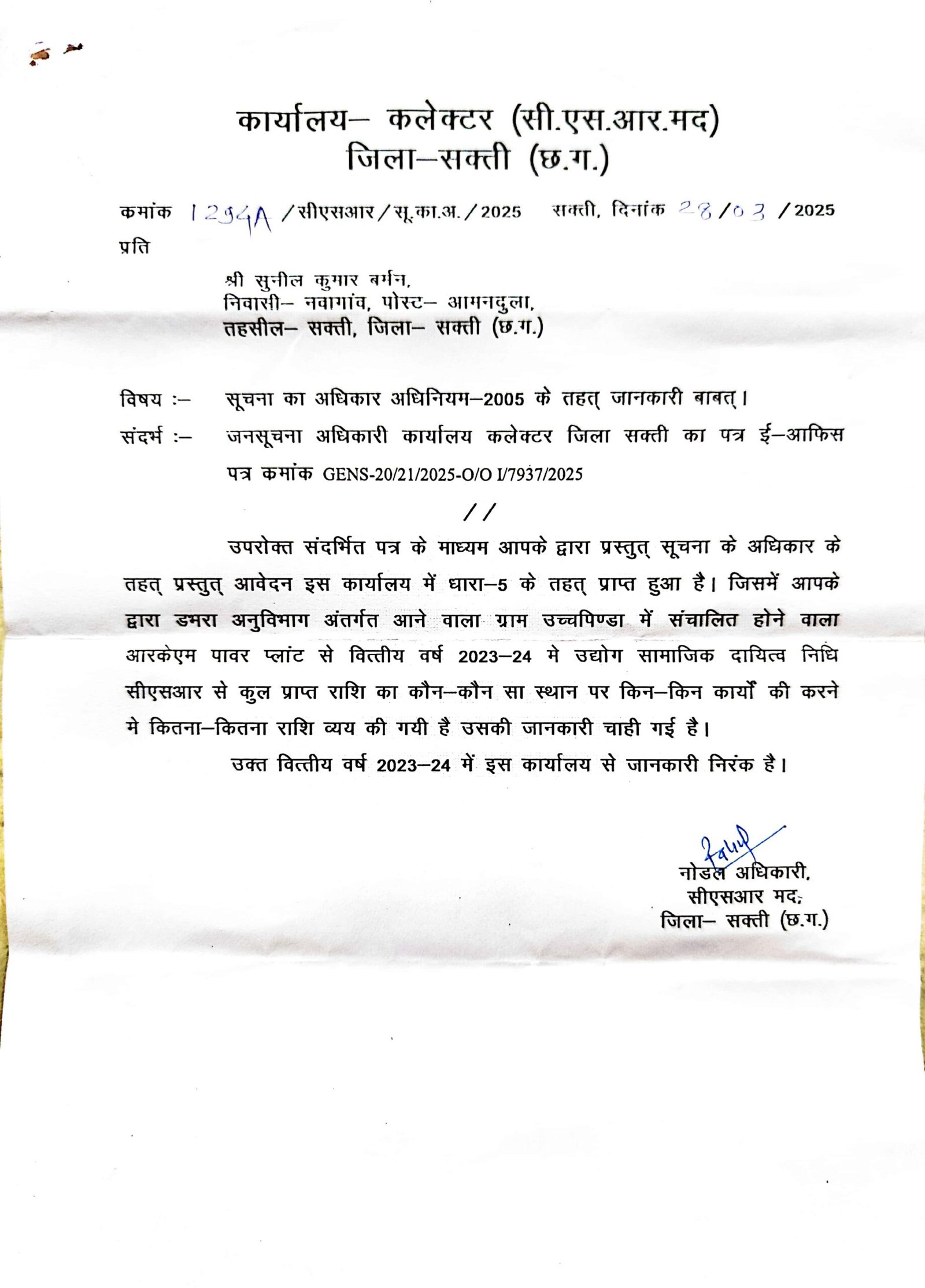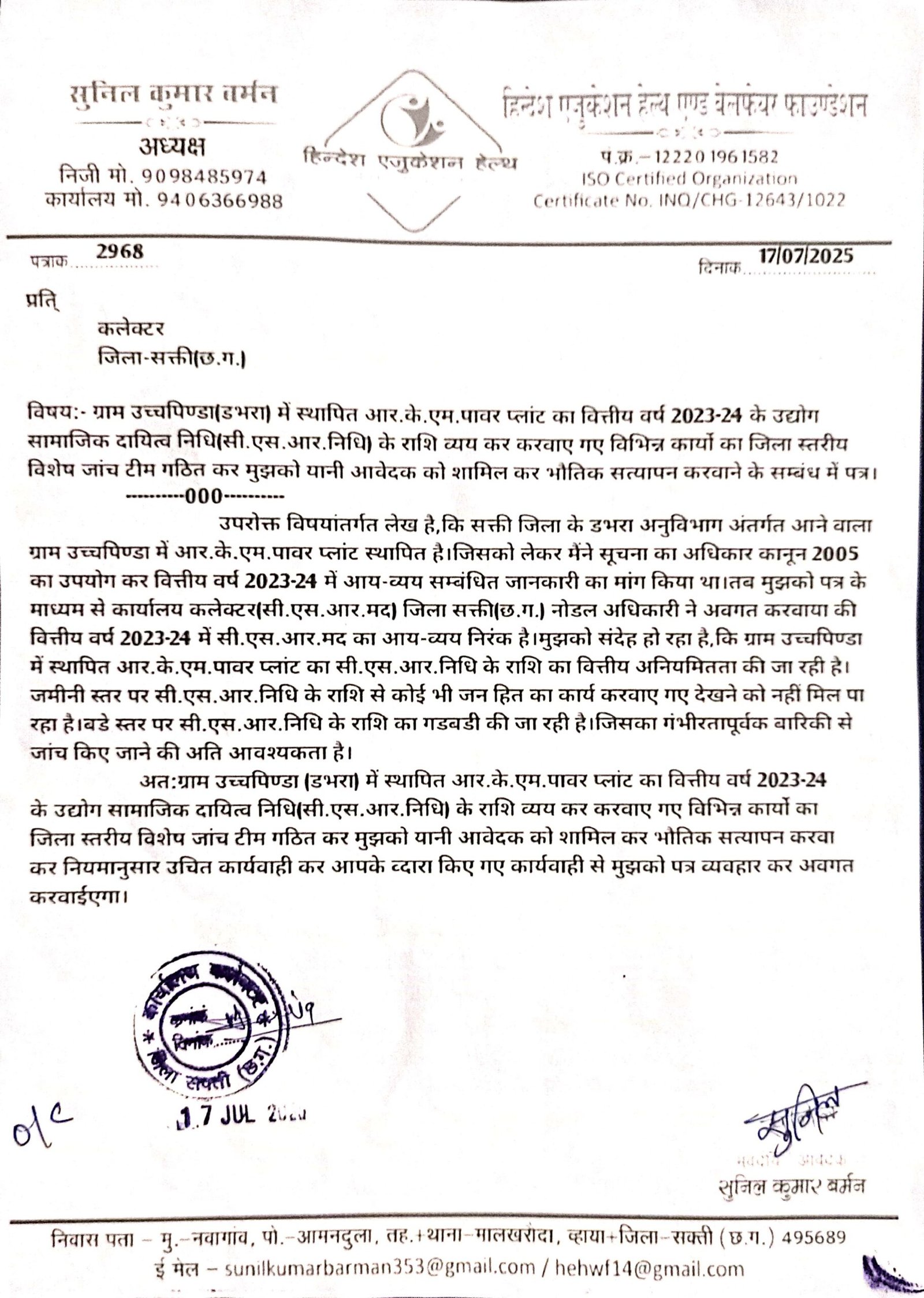 डभरा(एचकेपी 24 न्यूज)।सूचना का अधिकार कानून 2005 का उपयोग कर ग्राम उच्चपिण्डा(डभरा) में स्थापित आर.के.एम.पावर प्लांट का वित्तीय वर्ष 2023-24 के उद्योग सामाजिक दायित्व निधि(सी.एस.आर.मद) से आय-व्यय सम्बंधित जानकारी मांगे जाने पर लोक सूचना अधिकारी कार्यालय कलेक्टर(सी.एस.आर.मद) ने अपने कार्याकाल में उक्त सम्बंध में जानकारी निरंक होने की पत्र के माध्यम से अवगत करवाए जाने पर सी.एस.आर.मद के राशि का गड़बड़ी किए जाने की आशंका व्यक्त कर हिन्देश एजुकेशन हेल्थ एण्ड वेलफेयर फाउण्डेशन(रजिस्टर्ड) के अध्यक्ष सुनिल कुमार बर्मन ने उक्त प्लांट का वित्तीय वर्ष 2023-24 के सी.एस.आर.मद के राशि व्यय कर करवाए गए विभिन्न कार्यो का जिला स्तरीय विशेष जांच टीम गठित कर आवेदक को भी शामिल कर भौतिक सत्यापन करवा कर नियमानुसार उचित कार्यवाही करने कलेक्टर को पत्र लिखा है।