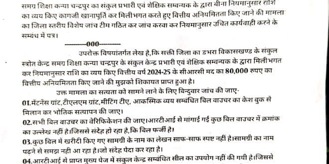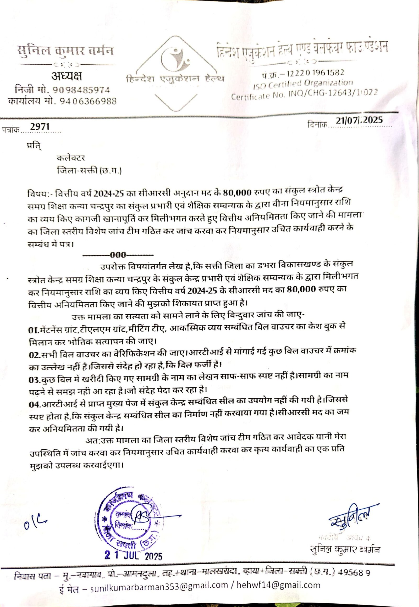 डभरा(एचकेपी 24 न्यूज)।वित्तीय वर्ष 2024-25 का सीआरसी अनुदान मद के 80,000 रुपए का संकुल स्त्रोत केन्द्र समग्र शिक्षा कन्या चन्द्रपुर का संकुल प्रभारी एवं शैक्षिक सम्वन्यक के द्वारा बीना नियमानुसार राशि का व्यय किए कागजी खानापूर्ति कर मिलीभगत करते हुए वित्तीय अनियमितता किए जाने की शिकायत प्राप्त होने पर आरटीआई से मांगी गई जानकारी में प्राप्त बिल वाउचर एवं केशबुक का अवलोकन करने उपरांत वित्तीय अनियमितता किए जाने की आशंका बढ़ने पर हिन्देश एजुकेशन हेल्थ एण्ड वेलफेयर फाउण्डेशन(रजिस्टर्ड) के अध्यक्ष सुनिल कुमार बर्मन ने कलेक्टर को जिला स्तरीय विशेष जांच टीम गठित कर भौतिक सत्यापन करवा कर नियमानुसार उचित करने के लिए पत्र लिखा है।