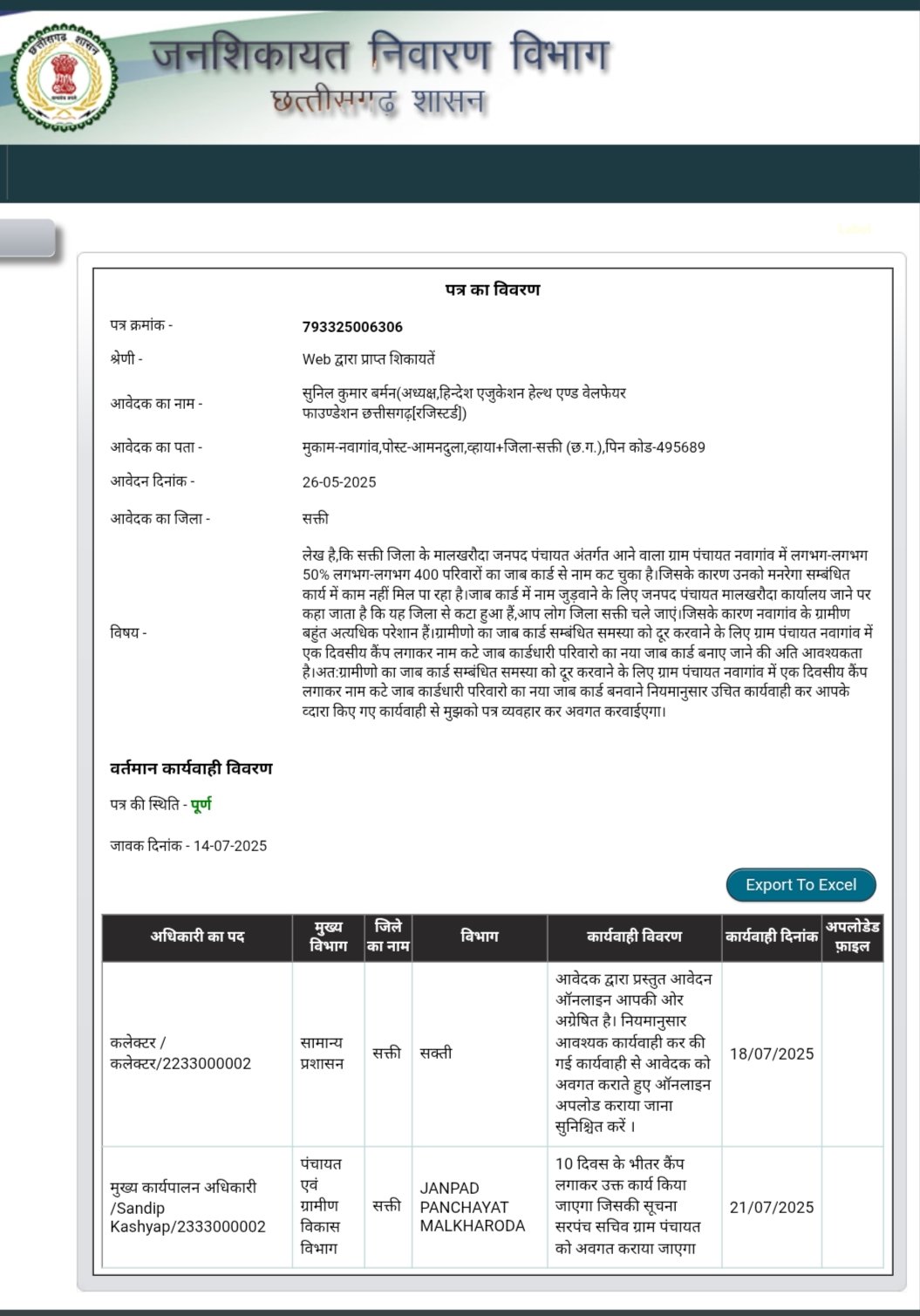 मालखरौदा(एचकेपी 24 न्यूज)।ग्राम पंचायत नवागांव में लगभग-लगभग 50%(लगभग 400 परिवारों)का जाब कार्ड से नाम कटने के कारण उनको मनरेगा सम्बंधित कार्य करने के लिए मौका नहीं मिल पा रहा है।ग्रामीणों का जाब कार्ड सम्बंधित समस्या का संज्ञान में आने पर हिन्देश एजुकेशन हेल्थ एण्ड वेलफेयर फाउण्डेशन(रजिस्टर्ड) का अध्यक्ष सुनिल कुमार बर्मन के व्दारा ग्रामीणो का जाब कार्ड सम्बंधित समस्या को दूर करवाने के लिए ग्राम पंचायत नवागांव में एक दिवसीय कैंप लगाकर नाम कटे जाब कार्डधारी परिवारो का नया जाब कार्ड बनवाने नियमानुसार उचित कार्यवाही करने कलेक्टर,सीईओ जिला पंचायत एवं जन शिकायत निवारण विभाग छत्तीसगढ़ शासन को पत्र लिख जाने के पश्चात् सीईओ जनपद पंचायत आगामी 10 दिवस के भीतर ग्राम नवागांव में शिविर लगवा कर ग्रामीणों के जाब कार्ड सम्बंधित समस्या का निराकरण करवाएंगे।