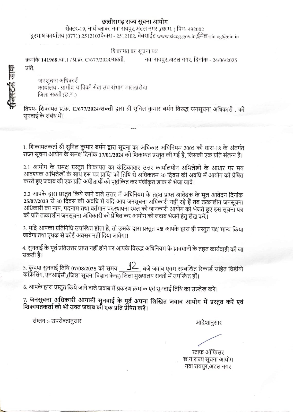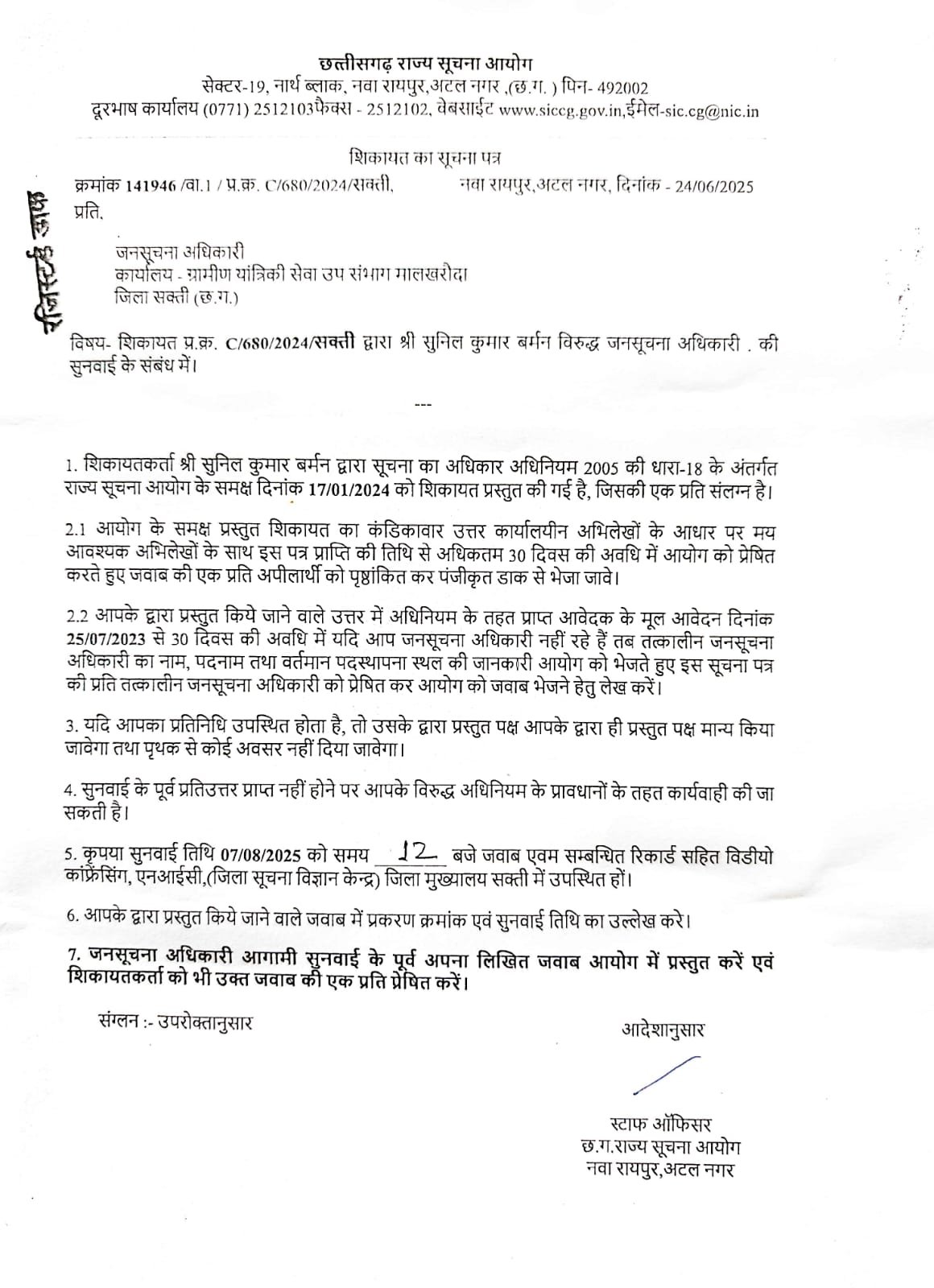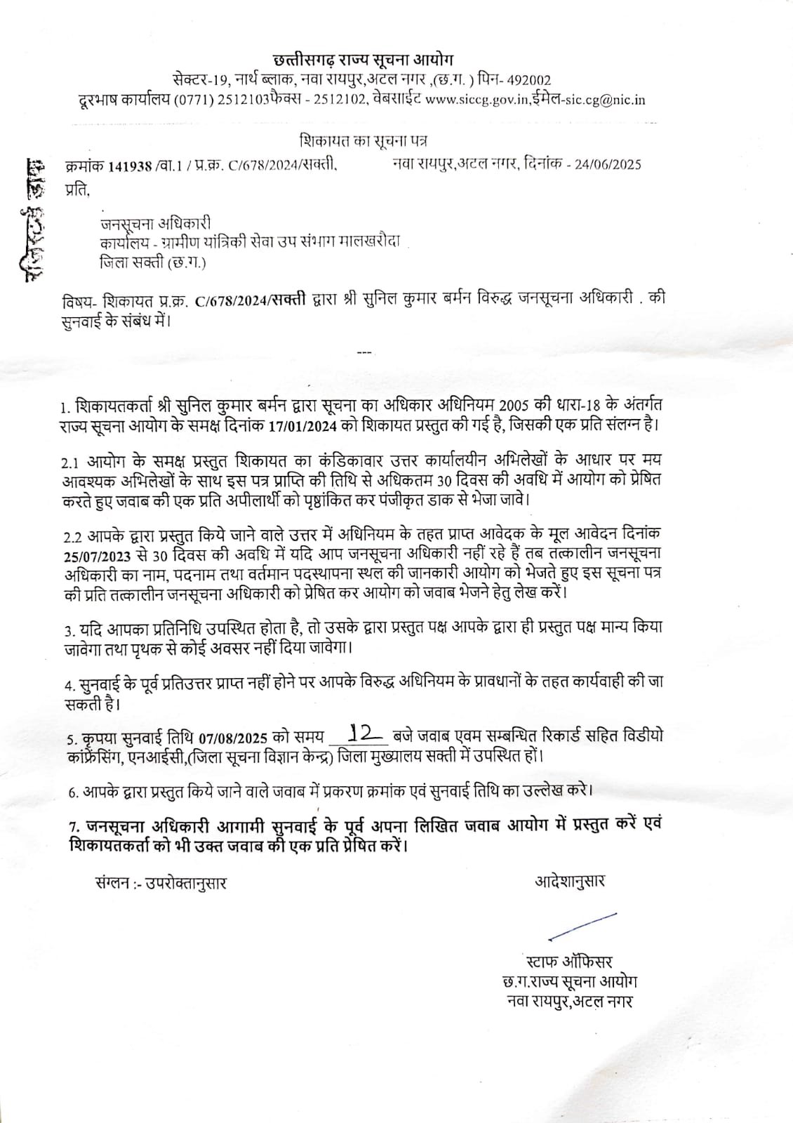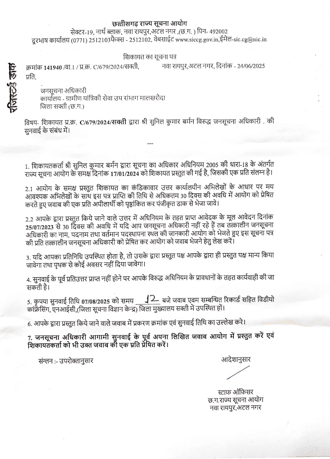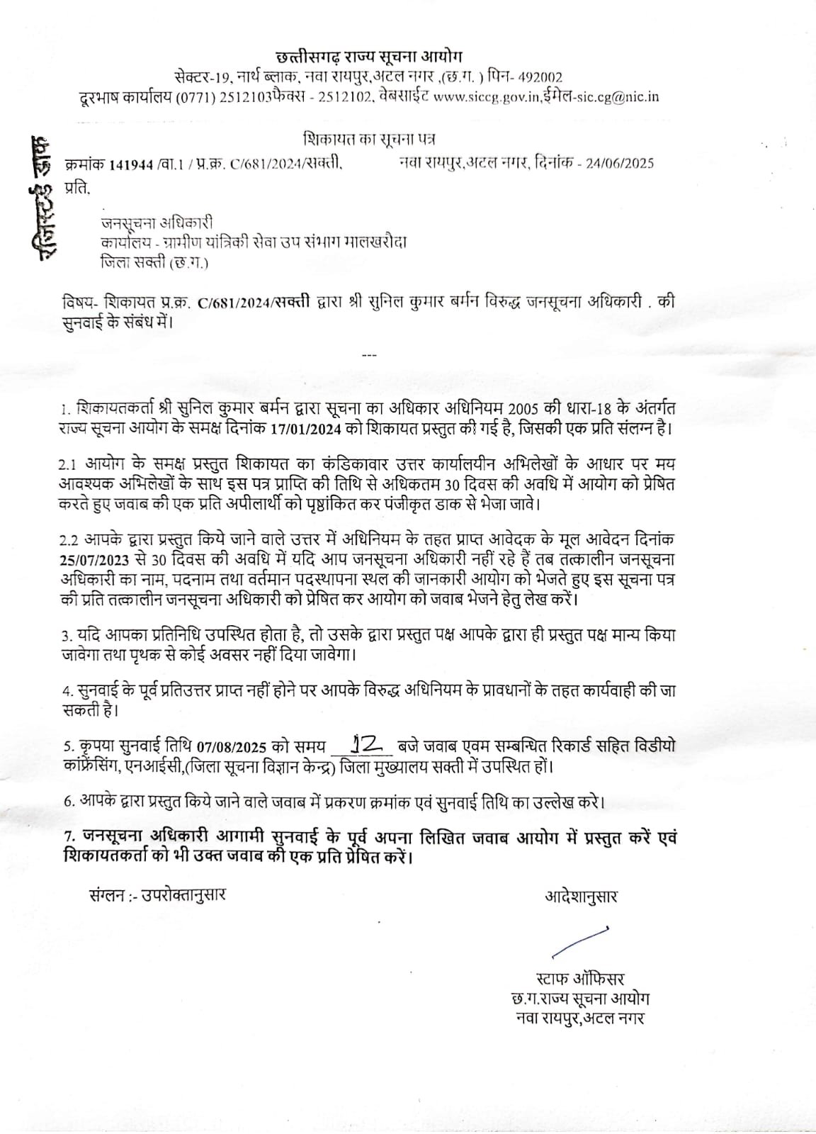 मालखरौदा(एचकेपी 24 न्यूज)।सूचना का अधिकार कानून 2005 का उपयोग कर ग्रामीण यांत्रिकी सेवा उप संभाग मालखरौदा सम्बंधित अलग-अलग विषय उल्लेखित 05 आवेदन पत्र कर मांगी गई जानकारी को आवेदन पत्र प्राप्त करने के तिथि का 30 दिवस के भीतर सम्बंधित तत्कालीन लोक सूचना अधिकारी के व्दारा उपलब्ध नही करवाने पर नाराजगी जताते हुए छत्तीसगढ़ राज्य सूचना आयोग को हिन्देश एजुकेशन हेल्थ एण्ड वेलफेयर फाउण्डेशन (रजिस्टर्ड) के अध्यक्ष एवं वरिष्ठ युवा आरटीआई कार्यकर्ता सुनिल कुमार बर्मन के द्वारा लिखित शिकायत करने के उपरांत आयोग ने सम्बंधित तत्कालीन लोक सूचना अधिकारी को 05 अलग-अलग नोटिस जारी कर दिनांक 07/08/2025 को विडियो कांफ्रेंसिंग एनआईसी जिला मुख्यालय सक्ती में उपस्थित होकर अपना लिखित जवाब प्रस्तुत करने आदेश जारी किया है।