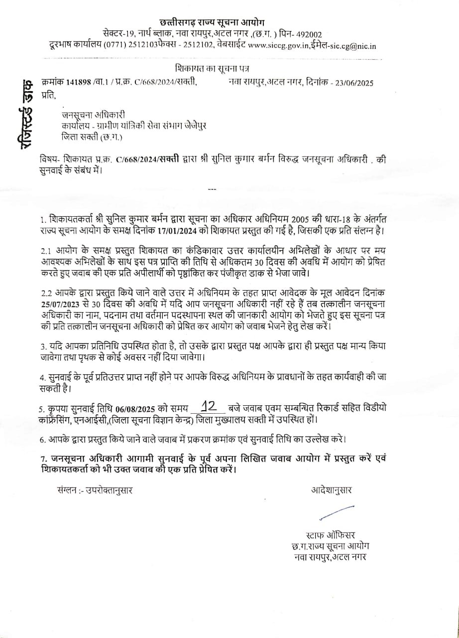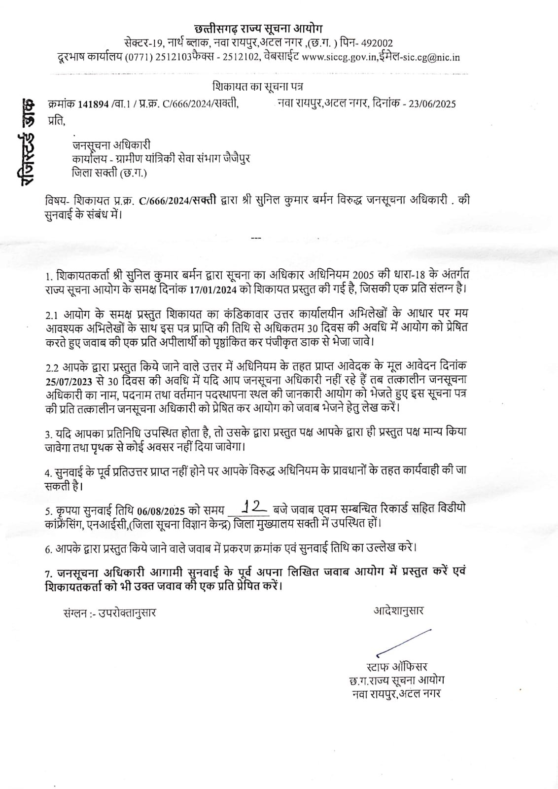 जैजैपुर (एचकेपी 24 न्यूज)।सूचना का अधिकार कानून 2005 का उपयोग कर ग्रामीण यांत्रिकी सेवा उप संभाग जैजैपुर सम्बंधित अलग-अलग विषय उल्लेखित 04 आवेदन पत्र कर मांगी गई जानकारी को आवेदन पत्र प्राप्त करने के तिथि का 30 दिवस के भीतर सम्बंधित तत्कालीन लोक सूचना अधिकारी के व्दारा उपलब्ध नही करवाने पर नाराजगी जताते हुए छत्तीसगढ़ राज्य सूचना आयोग को हिन्देश एजुकेशन हेल्थ एण्ड वेलफेयर फाउण्डेशन (रजिस्टर्ड) के अध्यक्ष एवं वरिष्ठ युवा आरटीआई कार्यकर्ता सुनिल कुमार बर्मन के द्वारा लिखित शिकायत करने के उपरांत आयोग ने सम्बंधित तत्कालीन लोक सूचना अधिकारी को 04 अलग-अलग नोटिस जारी कर दिनांक 06/08/2025 को विडियो कांफ्रेंसिंग एनआईसी जिला मुख्यालय सक्ती में उपस्थित होकर अपना लिखित जवाब प्रस्तुत करने आदेश जारी किया है।