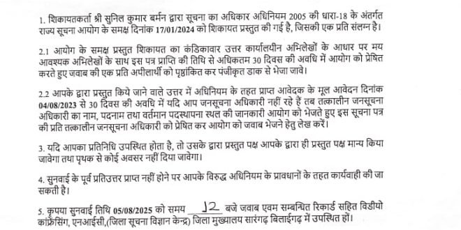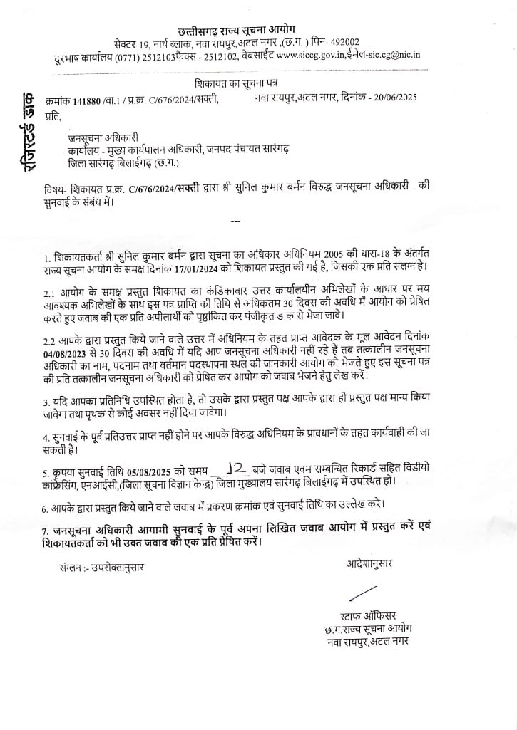 सारंगढ(एचकेपी 24 न्यूज)।सूचना का अधिकार कानून 2005 का उपयोग कर मुख्य कार्यपालन अधिकारी कार्यालय जनपद पंचायत सारंगढ सम्बंधित अलग-अलग विषय उल्लेखित 02 आवेदन पत्र प्रेषित कर मांगी गई जानकारी को आवेदन पत्र प्राप्त करने के तिथि का 30 दिवस के भीतर सम्बंधित तत्कालीन लोक सूचना अधिकारी के व्दारा उपलब्ध नही करवाने पर नाराजगी जताते हुए छत्तीसगढ़ राज्य सूचना आयोग को हिन्देश एजुकेशन हेल्थ एण्ड वेलफेयर फाउण्डेशन (रजिस्टर्ड) के अध्यक्ष एवं वरिष्ठ युवा आरटीआई कार्यकर्ता सुनिल कुमार बर्मन के द्वारा लिखित शिकायत करने के उपरांत आयोग ने सम्बंधित तत्कालीन लोक सूचना अधिकारी को 02 अलग-अलग नोटिस जारी कर दिनांक 05/08/2025 को विडियो कांफ्रेंसिंग एनआईसी जिला मुख्यालय सारंगढ-बिलाईगढ में उपस्थित होकर अपना लिखित जवाब प्रस्तुत करने के लिए आदेश जारी किया है।