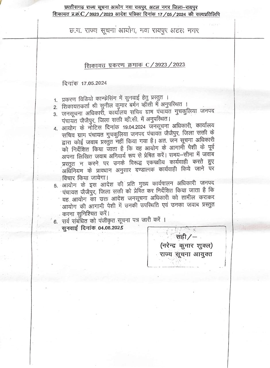 जैजैपुर(एचकेपी 24 न्यूज)।सूचना का अधिकार कानून 2005 का उपयोग कर आवेदन पत्र प्रेषित करते हुए ग्राम पंचायत गुचकुलिया सम्बंधित मांगी गई जानकारी को आवेदन पत्र प्राप्त करने के तिथि का 30 दिवस के भीतर सम्बंधित तत्कालीन लोक सूचना अधिकारी के व्दारा उपलब्ध नही करवाए जाने पर नाराजगी जताते हुए छत्तीसगढ़ राज्य सूचना आयोग को हिन्देश एजुकेशन हेल्थ एण्ड वेलफेयर फाउण्डेशन (रजिस्टर्ड) के अध्यक्ष एवं वरिष्ठ युवा आरटीआई कार्यकर्ता सुनिल कुमार बर्मन के द्वारा लिखित शिकायत करने के उपरांत आयोग ने सम्बंधित तत्कालीन लोक सूचना अधिकारी को नोटिस जारी कर दिनांक 04/08/2025 को विडियो कांफ्रेंसिंग एनआईसी जिला मुख्यालय सक्ती में उपस्थित होकर अपना लिखित जवाब प्रस्तुत करने के लिए आदेश जारी किया है।
