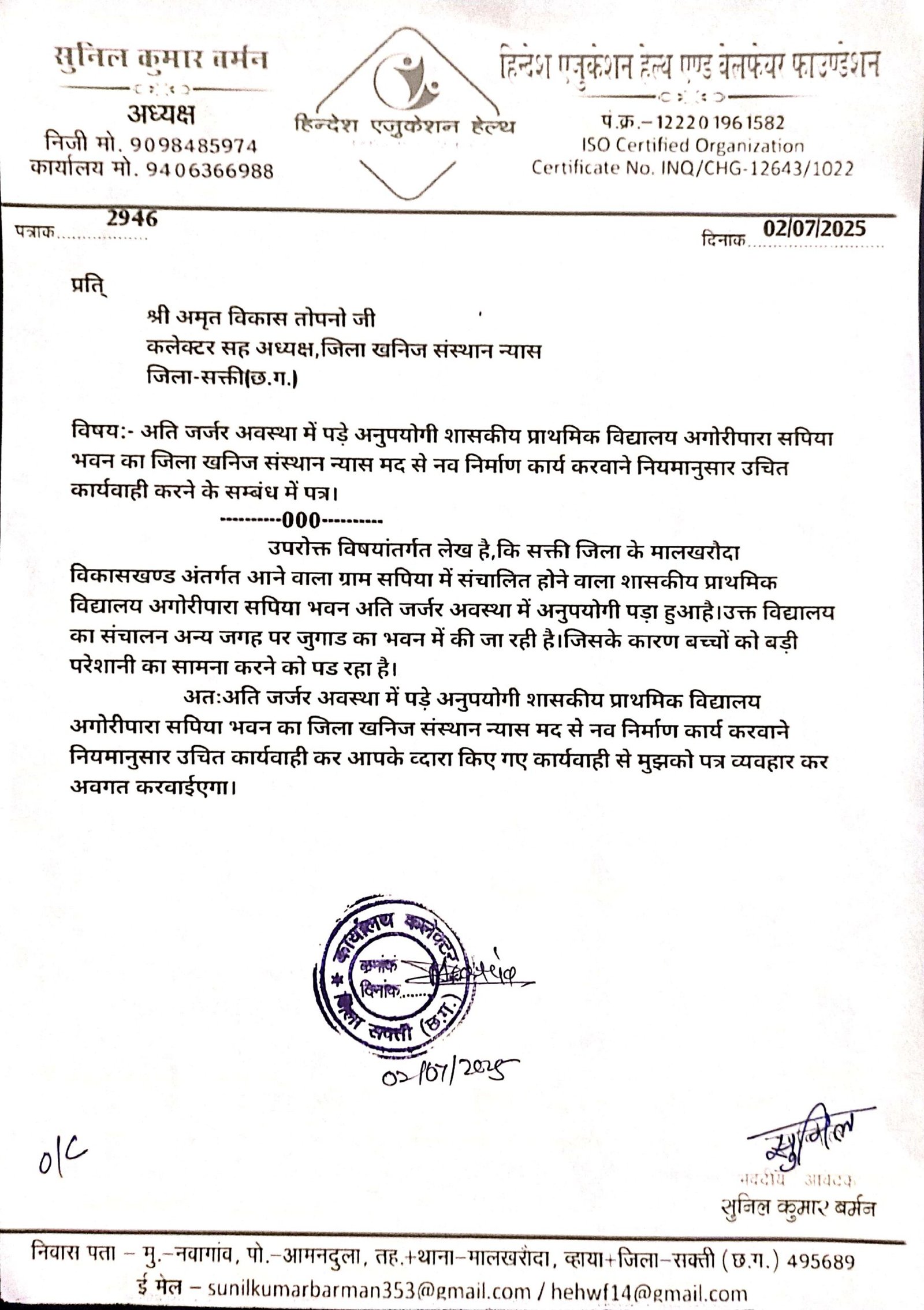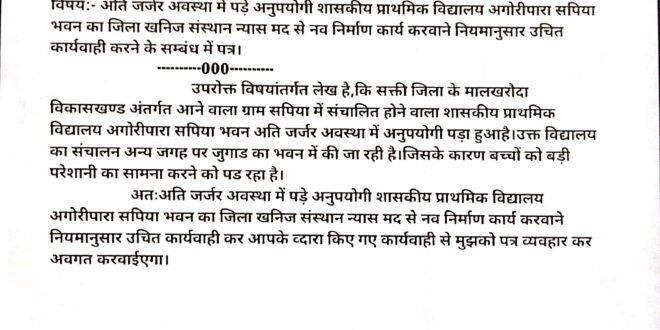 मालखरौदा(एचकेपी 24 न्यूज)।जीर्ण शीर्ण अवस्था में अनुपयोगी पड़े सक्ती जिला के अंतिम क्षोर मे संचालित होने वाला शासकीय प्राथमिक विद्यालय अगोरीपारा सपिया भवन का जिला खनिज संस्थान न्यास मद से नव निर्माण कार्य करवाने नियमानुसार उचित कार्यवाही करने के लिए हिन्देश एजुकेशन हेल्थ एण्ड वेलफेयर फाउण्डेशन ( रजिस्टर्ड) के अध्यक्ष सुनिल कुमार बर्मन ने कलेक्टर को पत्र लिखा है।