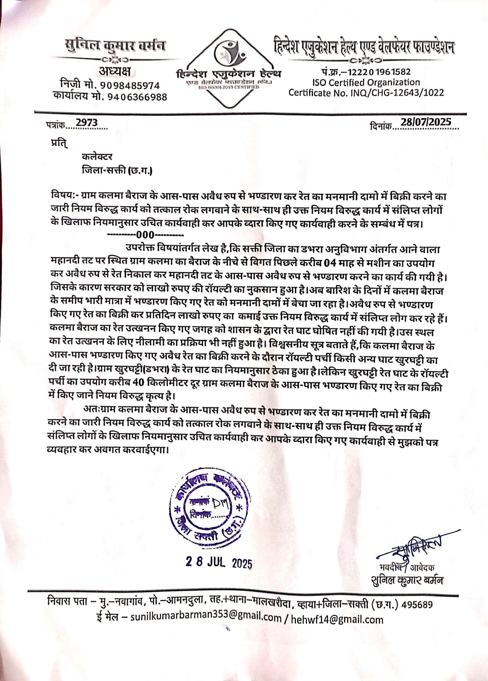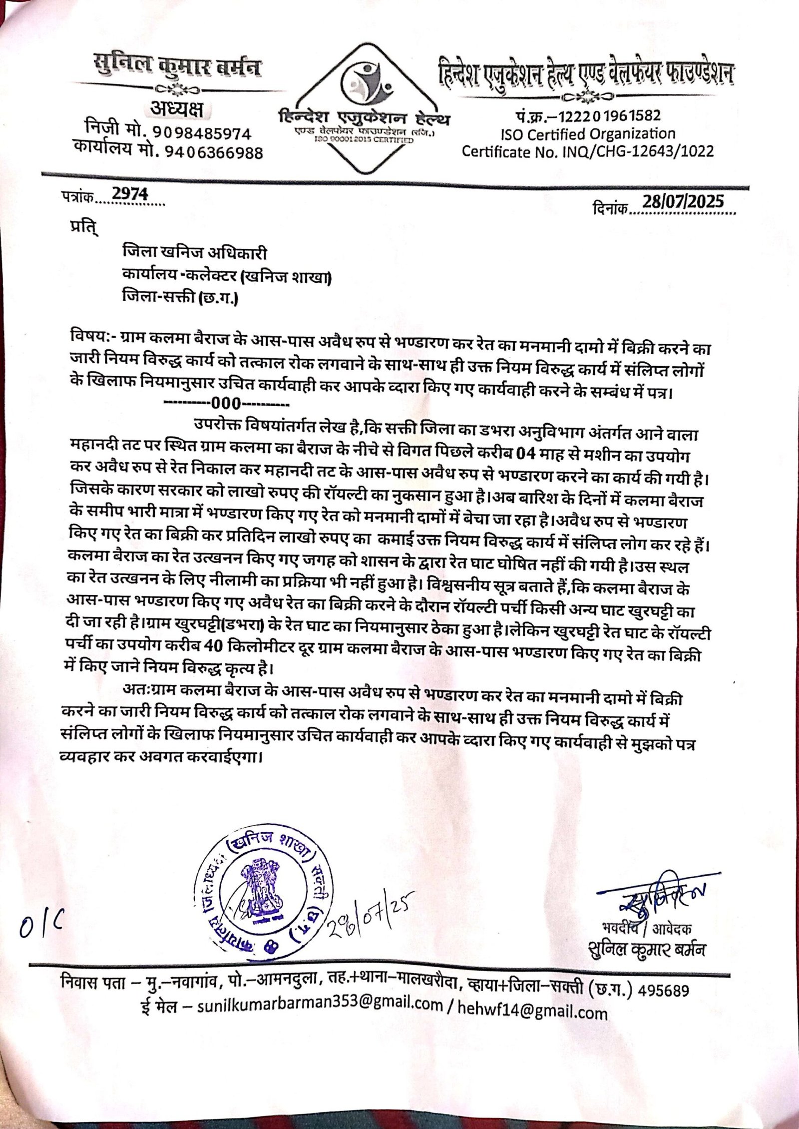 डभरा(एचकेपी 24 न्यूज)।बरसात का मौसम आने के पूर्व ग्राम कलमा में बीना अनुमति नियम विरुद्ध किए गए रेत की अवैध भण्डारण का अब मनमानी दाम पर बिक्री कर लाखो रुपए का कमाई कर रहे रेत माफिया..हिन्देश एजुकेशन हेल्थ एण्ड वेलफेयर फाउण्डेशन (रजिस्टर्ड) के अध्यक्ष सुनिल कुमार बर्मन ने ग्राम कलमा बैराज के आस-पास अवैध रुप से भण्डारण कर रेत का मनमानी दामो में बिक्री करने का जारी नियम विरुद्ध कार्य को तत्काल रोक लगवाने के साथ-साथ ही उक्त नियम विरुद्ध कार्य में संलिप्त लोगों के खिलाफ नियमानुसार उचित कार्यवाही करने कलेक्टर एवं जिला खनिज अधिकारी को ज्ञापन सौंपा है।