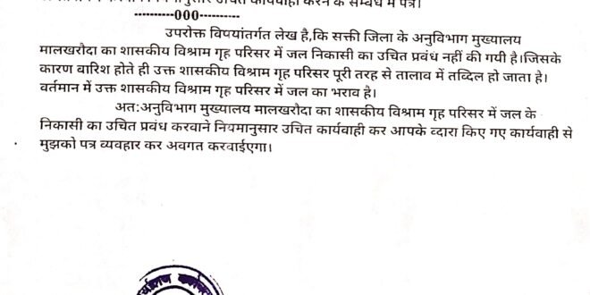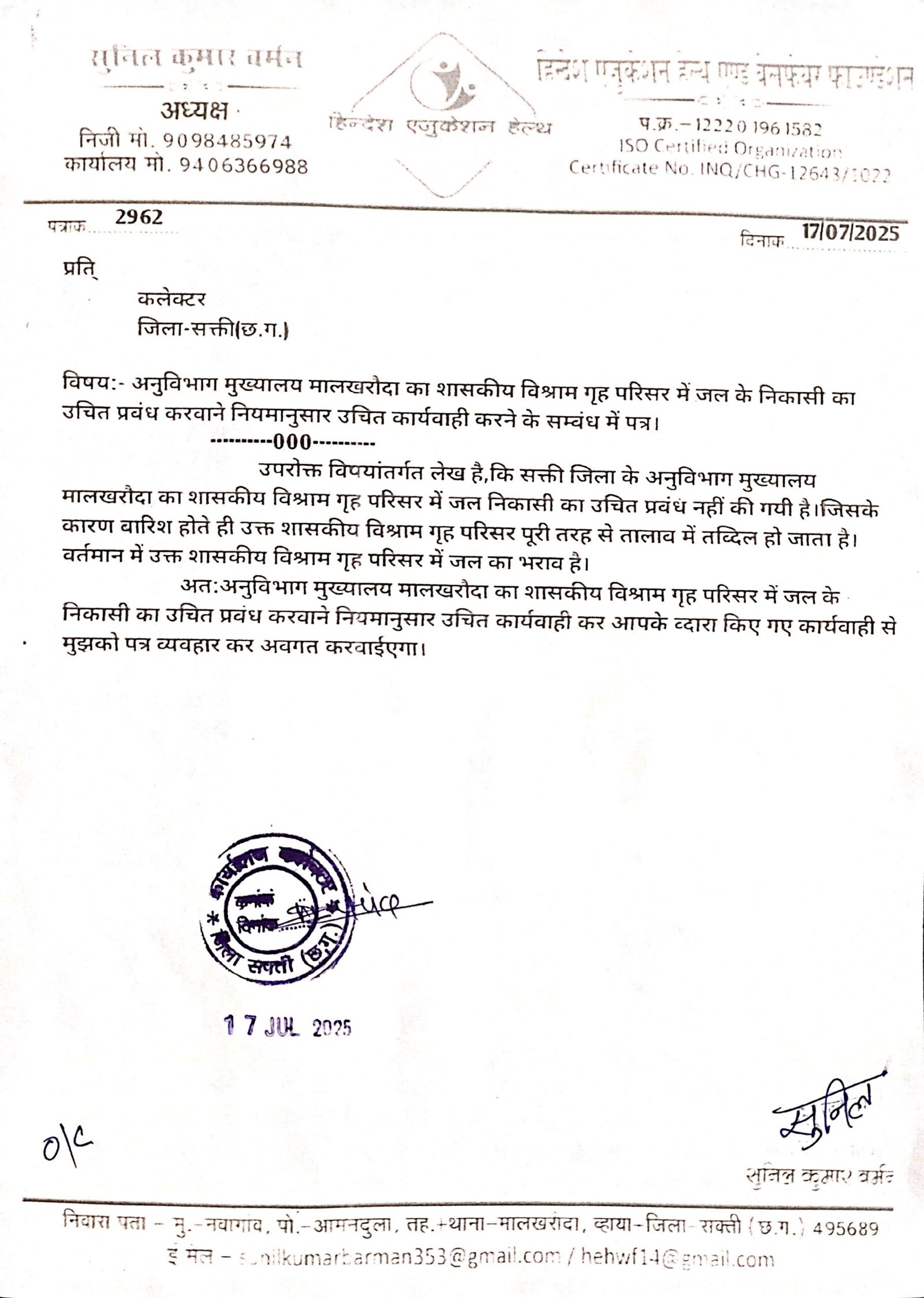 मालखरौदा(एचकेपी 24 न्यूज)।बारिश होते ही शासकीय विश्राम गृह परिसर जलमग्न हो जा रहा है।शासकीय विश्राम गृह परिसर में जल के निकासी का उचित प्रबंध करवाने नियमानुसार उचित कार्यवाही करने हिन्देश एजुकेशन हेल्थ एण्ड वेलफेयर फाउण्डेशन (रजिस्टर्ड) के अध्यक्ष सुनिल कुमार बर्मन ने कलेक्टर को पत्र लिखा है।
