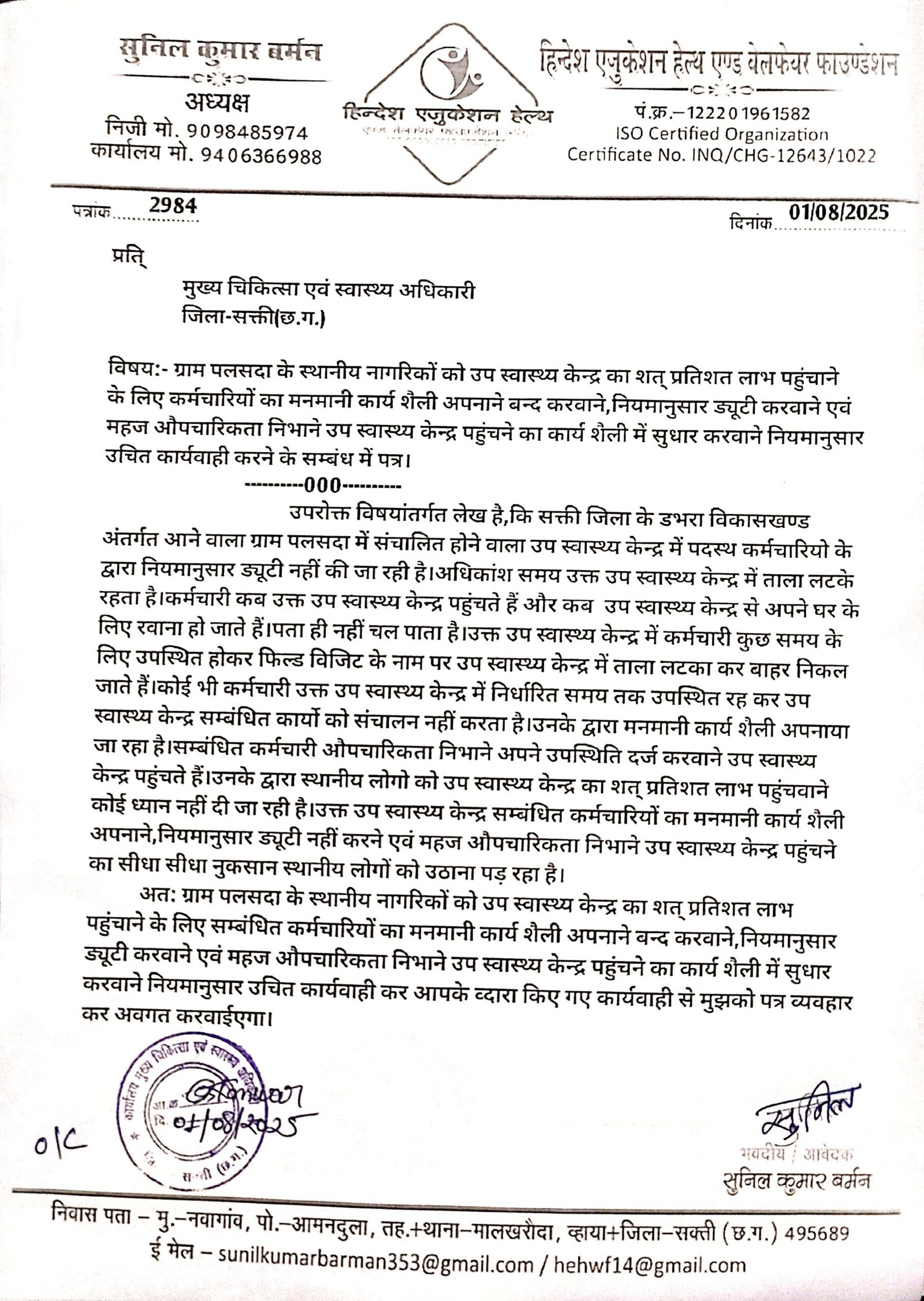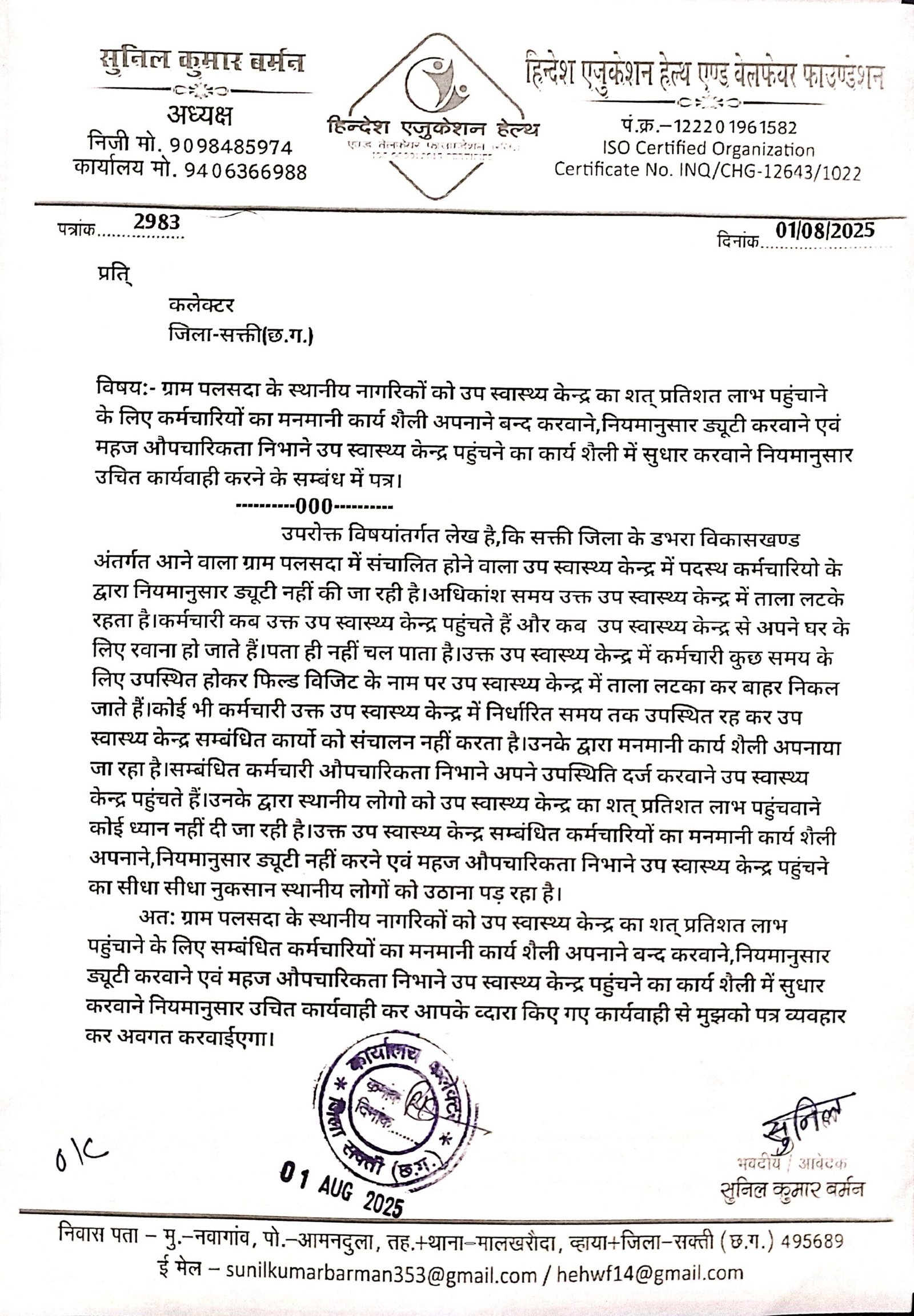 डभरा(एचकेपी 24 न्यूज)।ग्राम पलसदा के उप स्वास्थ्य केन्द्र में पदस्थ समस्त कर्मचारी केन्द्र का जिला के अंतिम क्षोर मे स्थित होने का फायदा उठाते हुए मनमानी कार्य शैली अपना रहे हैं।अधिकांश समय उक्त उप स्वास्थ्य केन्द्र में ताला लटके रहता है।उप स्वास्थ्य केन्द्र सम्बंधित कर्मचारी मुख्यालय में निवास करने ध्यान नही दें रहे हैं।हिन्देश एजुकेशन हेल्थ एण्ड वेलफेयर फाउण्डेशन (रजिस्टर्ड) के अध्यक्ष सुनिल कुमार बर्मन ने पलसदा के उप स्वास्थ्य केन्द्र सम्बंधित लोगों को शत् प्रतिशत लाभ पहुंचाने के लिए कर्मचारियों का मनमानी कार्य शैली अपनाने बन्द करवाने,नियमानुसार ड्यूटी करवाने एवं महज औपचारिकता निभाने उप स्वास्थ्य केन्द्र पहुंचने का कार्य शैली में सुधार करवाने नियमानुसार उचित कार्यवाही करने कलेक्टर एवं सीएमएचओ को पत्र लिखा है।