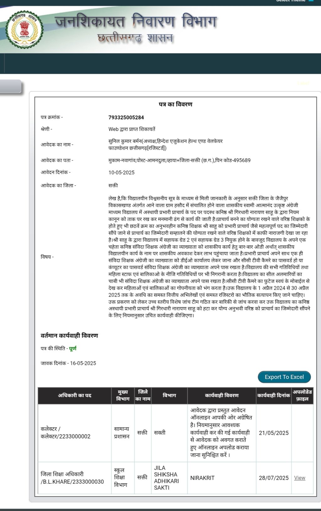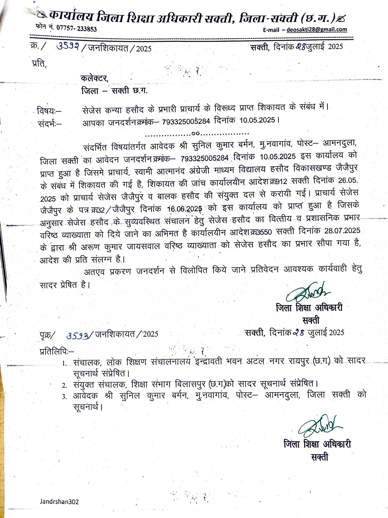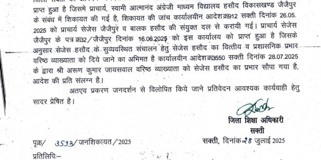 जैजैपुर(एचकेपी 24 न्यूज)।वरिष्ठता सूची में छठवे नम्बर का कनिष्ठ व्याख्याता को शासकीय स्वामी आत्मानंद उत्कृष्ट अंग्रेजी माध्यम विद्यालय हसौद का प्रभारी प्राचार्य बना दिए जाने से वरिष्ठ व्याख्याताओ मे नकारात्मक प्रभाव पड़ने के कारण विद्यालय का माहौल असामान्य निर्मित होने पर छात्र-छात्राओ का हित के दृष्टिकोण से हिन्देश एजुकेशन हेल्थ एण्ड वेलफेयर फाउण्डेशन(रजिस्टर्ड) का अध्यक्ष सुनिल कुमार बर्मन के द्वारा जनशिकायत निवारण विभाग छत्तीसगढ़ शासन को वरिष्ठ व्याख्याता को प्राचार्य का जिम्मेदारी सौंपने का मांग करते हुए पत्र लिखे जाने के पश्चात् डीईओ ने वरिष्ठ व्याख्याता को सेजेस हसौद का वित्तीय एवं प्रशासनिक प्रभार सौंपा है।