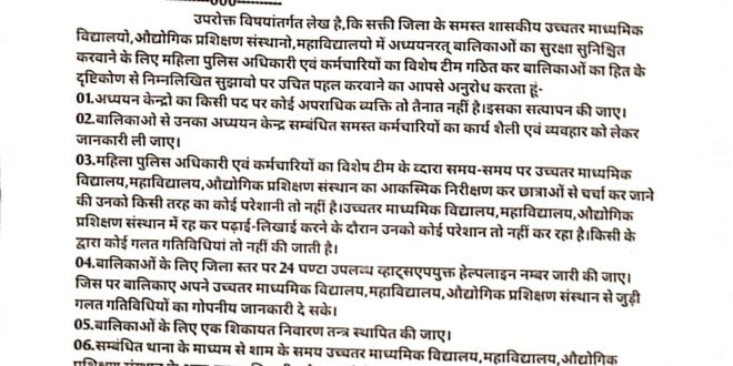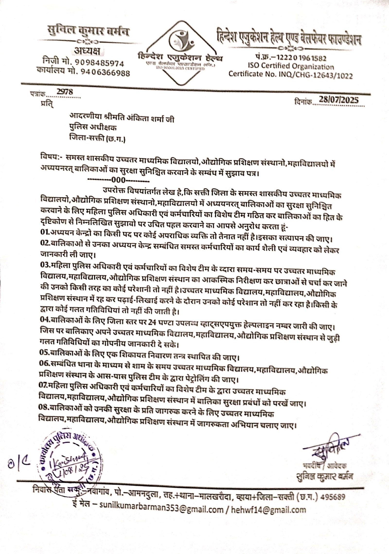 सक्ती(एचकेपी 24 न्यूज)।जिला के समस्त शासकीय शासकीय उच्चतर माध्यमिक विद्यालयो,औद्योगिक प्रशिक्षण संस्थानो एवं महाविद्यालयो में अध्ययनरत् बालिकाओ को मानसिक रुप से सुरक्षा सुनिश्चित करवाने के लिए महिला पुलिस अधिकारी एवं कर्मचारियों का विशेष टीम गठित कर बालिकाओं का हित के दृष्टिकोण से 08 बिन्दुओं पर उल्लेखित सुझाव पर उचित पहल करवाने हिन्देश एजुकेशन हेल्थ एण्ड वेलफेयर फाउण्डेशन (रजिस्टर्ड) के अध्यक्ष सुनिल कुमार बर्मन ने पुलिस अधीक्षक को पत्र लिखा है।