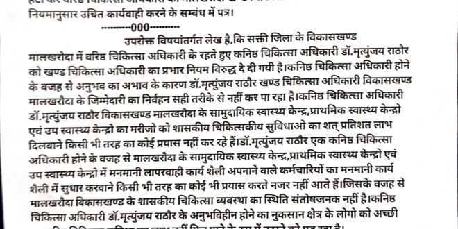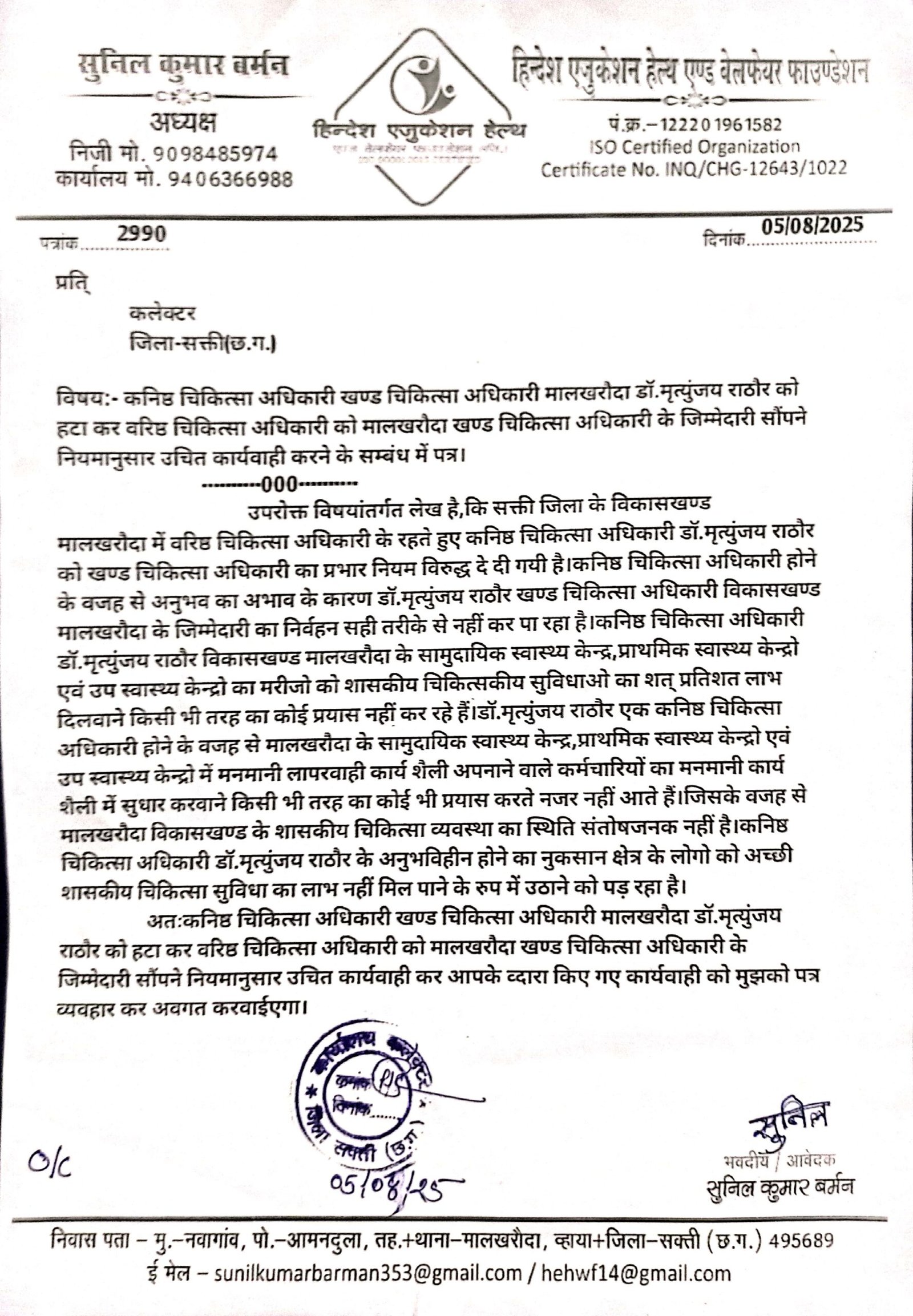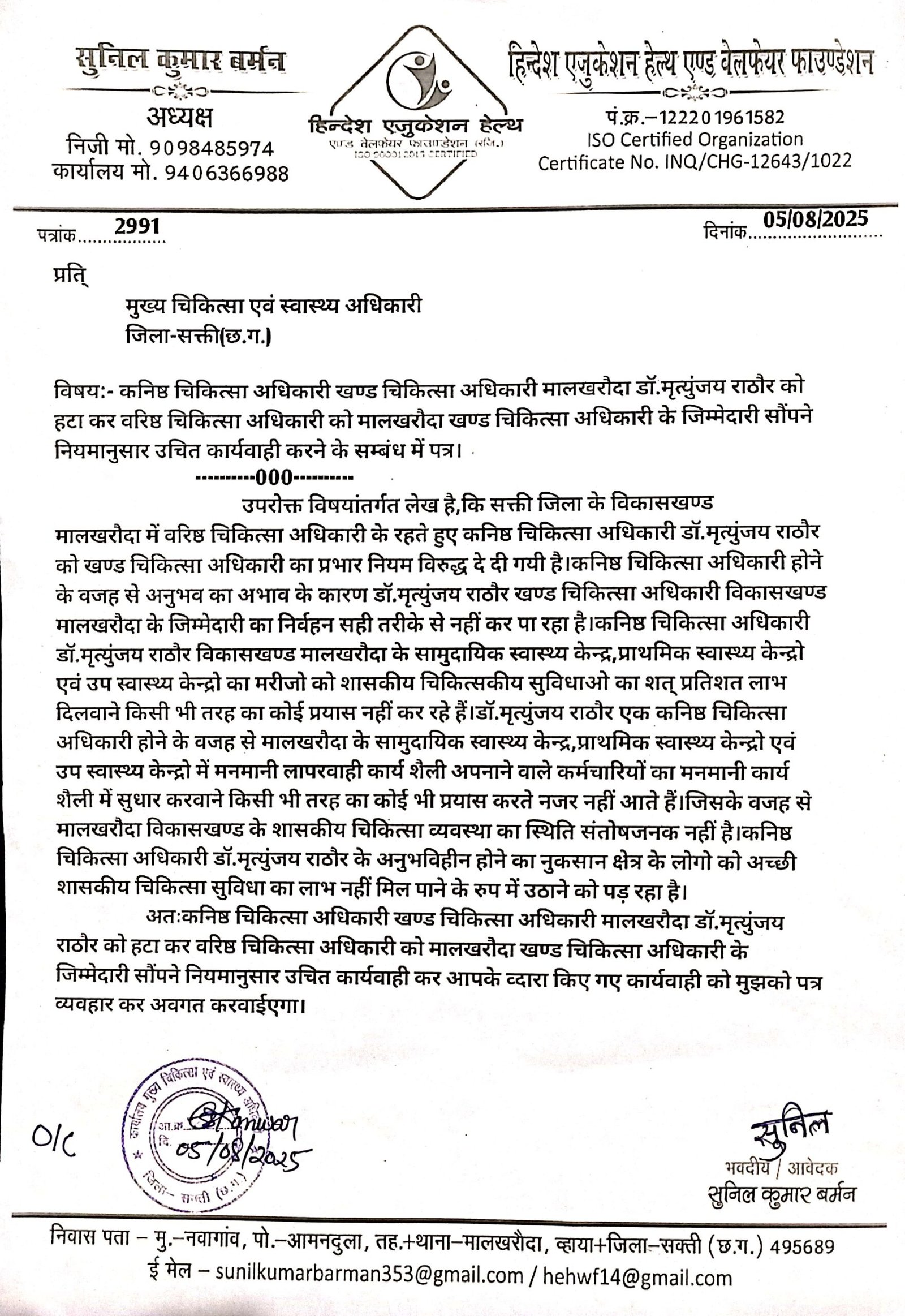 मालखरौदा(एचकेपी 24 न्यूज)।वरिष्ठ चिकित्सा अधिकारियो के रहते हुए नियम विरुद्ध कनिष्ठ चिकित्सा अधिकारी को खण्ड चिकित्सा अधिकारी मालखरौदा का प्रभार सौंपा गया है।अनुभवहीन कनिष्ठ चिकित्सा अधिकारी खण्ड चिकित्सा अधिकारी का जिम्मेदारी नहीं सम्हाल पा रहा है।सीएचसी,पीएचसी सहित एसएचसी से मरीजों को अच्छी शासकीय चिकित्सकीय सुविधा नहीं मिल पा रहा है।हिन्देश एजुकेशन हेल्थ एण्ड वेलफेयर फाउण्डेशन (रजिस्टर्ड) के अध्यक्ष सुनिल कुमार बर्मन ने कनिष्ठ चिकित्सा अधिकारी को खण्ड चिकित्सा अधिकारी का जिम्मेदारी से मुक्त कर वरिष्ठ चिकित्सा अधिकारी को मालखरौदा खण्ड चिकित्सा अधिकारी का जिम्मेदारी सौंपने कलेक्टर एवं सीएमएचओ को पत्र लिखा है।