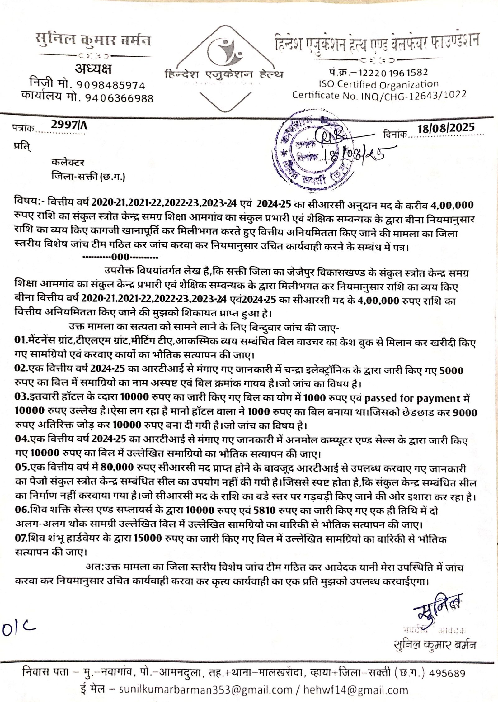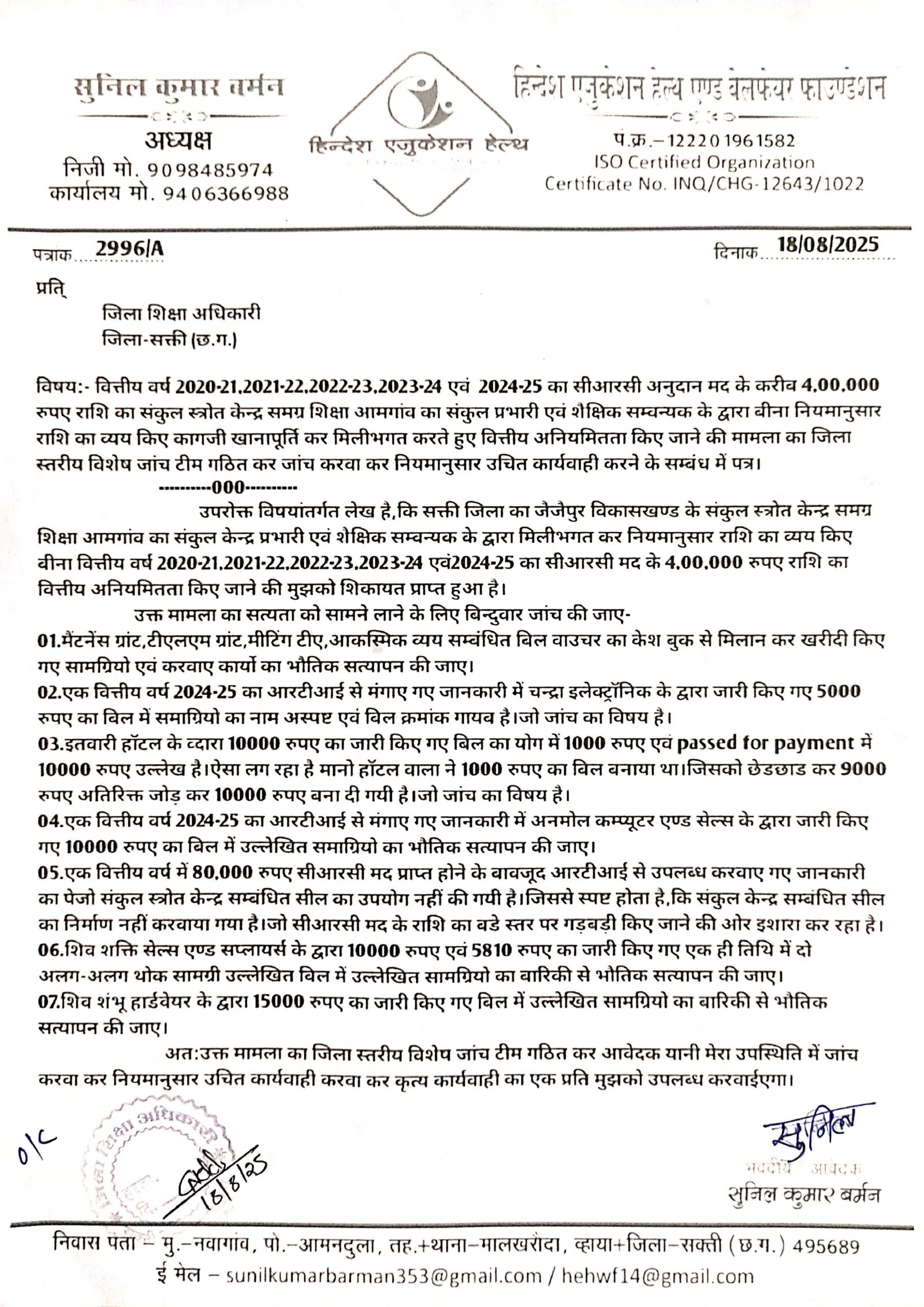 जैजैपुर(एचकेपी 24 न्यूज)।संकुल प्रभारी एवं शैक्षिक सम्वन्यक के द्वारा बीना नियमानुसार राशि का व्यय किए कागजी खानापूर्ति कर मिलीभगत करते हुए वित्तीय अनियमितता किए जाने की शिकायत प्राप्त होने पर आरटीआई से मांगी गई जानकारी में प्राप्त बिल वाउचर एवं केशबुक का अवलोकन करने उपरांत वित्तीय अनियमितता किए जाने की आशंका बढ़ने पर हिन्देश एजुकेशन हेल्थ एण्ड वेलफेयर फाउण्डेशन(रजिस्टर्ड) के अध्यक्ष सुनिल कुमार बर्मन ने वित्तीय वर्ष 2020-21,2021-22,2022-23,2023-24,2024-25 का सीआरसी अनुदान मद के राशि का संकुल स्त्रोत केन्द्र समग्र शिक्षा आमगांव का जिला स्तरीय विशेष जांच टीम गठित कर भौतिक सत्यापन करवा कर नियमानुसार उचित करने के लिए कलेक्टर एवं डीईओ को पत्र लिखा है।