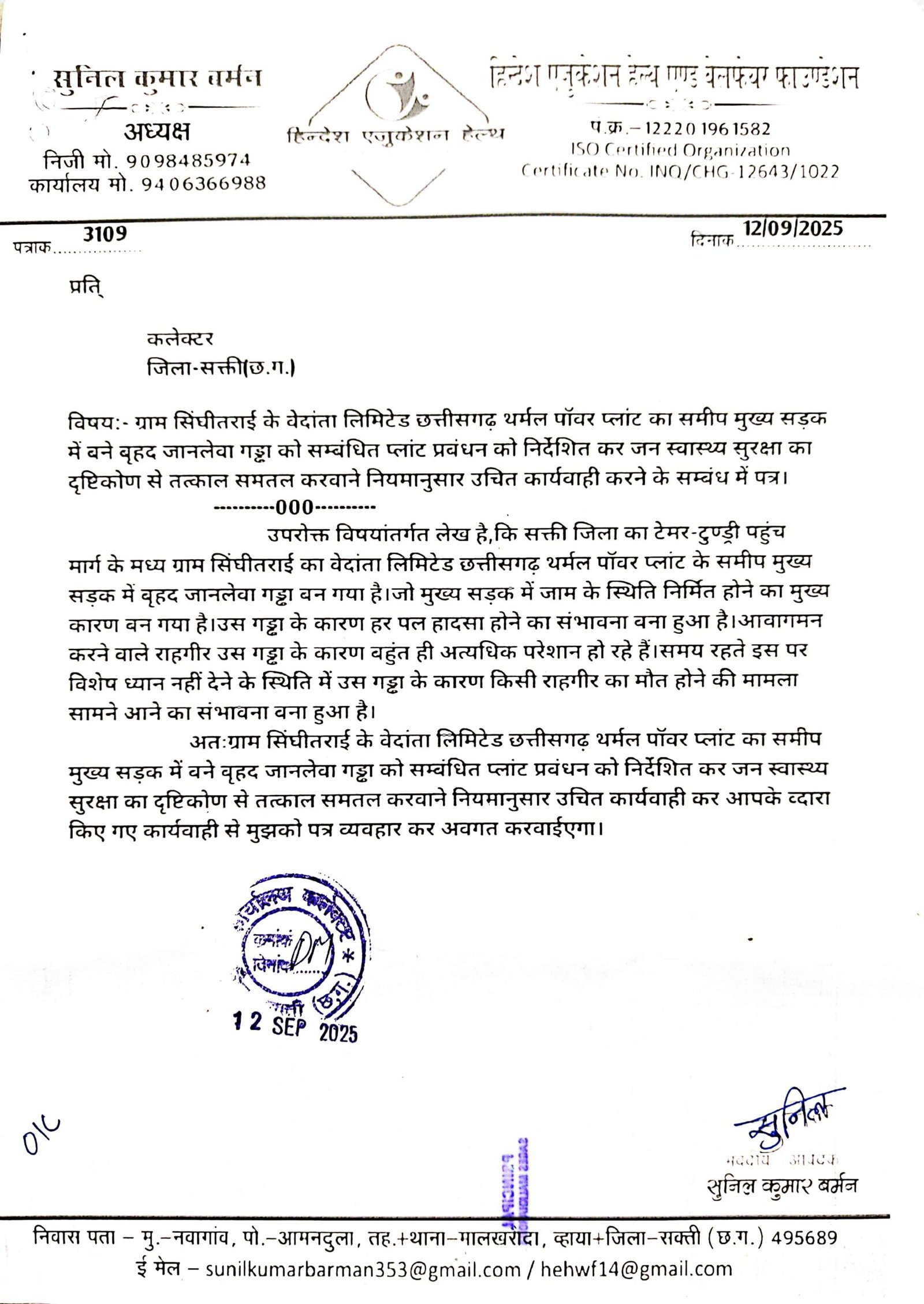 डभरा(एचकेपी 24 न्यूज)।ग्राम सिंघीतराई के वेदांता लिमिटेड छत्तीसगढ़ थर्मल पॉवर प्लांट का समीप मुख्य सड़क में बने बृहद आए दिन सड़क जाम होने एवं सडक हादसा होने का कारण बनने वाला जानलेवा गड्ढा को सम्बंधित प्लांट प्रबंधन को निर्देशित कर जन स्वास्थ्य सुरक्षा का दृष्टिकोण से तत्काल आवश्यक मटेरियल डलवा कर समतल करवाने नियमानुसार उचित कार्यवाही करने हिन्देश एजुकेशन हेल्थ एण्ड वेलफेयर फाउण्डेशन(रजिस्टर्ड) के अध्यक्ष सुनिल कुमार बर्मन ने कलेक्टर को ज्ञापन सौंपा है।