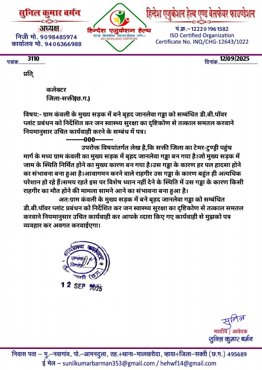 डभरा(एचकेपी 24 न्यूज)।ग्राम कंवली का मुख्य सड़क में बने बृहद आए दिन सड़क जाम होने एवं सडक हादसा होने का कारण बनने वाला जानलेवा गड्ढा को नजदीकी सम्बंधित डी.बी.पॉवर प्लांट बाडादरहा प्रबंधन को निर्देशित कर जन स्वास्थ्य सुरक्षा का दृष्टिकोण से तत्काल आवश्यक मटेरियल डलवा कर समतल करवाने नियमानुसार उचित कार्यवाही करने हिन्देश एजुकेशन हेल्थ एण्ड वेलफेयर फाउण्डेशन(रजिस्टर्ड) के अध्यक्ष सुनिल कुमार बर्मन ने कलेक्टर को ज्ञापन सौंपा है।