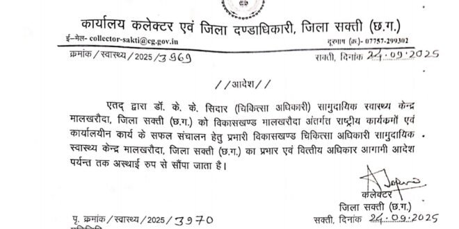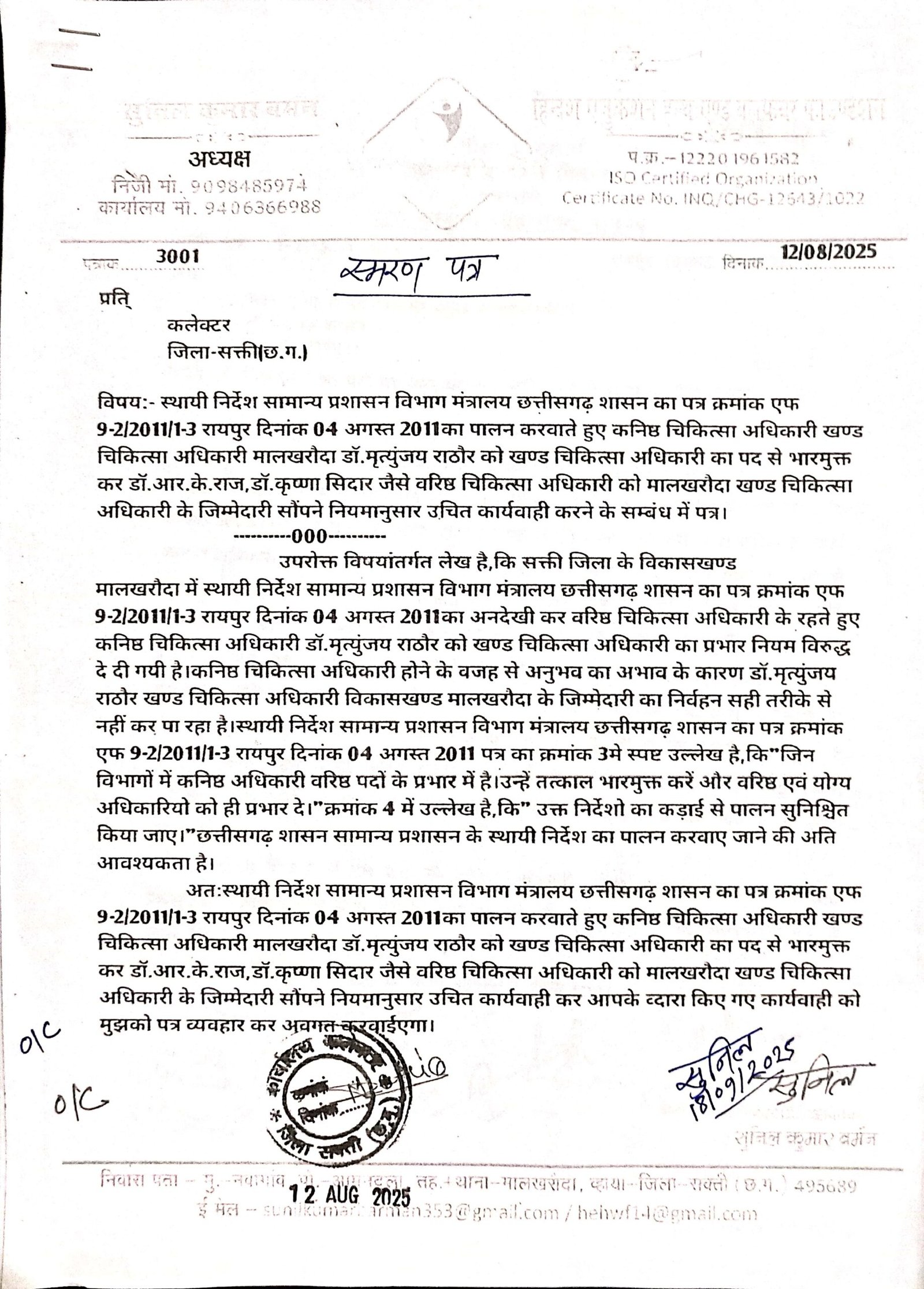 मालखरौदा(एचकेपी 24 न्यूज)।वरिष्ठ चिकित्सा अधिकारियो के रहते हुए नियम विरुद्ध अनुभवविहीन कनिष्ठ चिकित्सा अधिकारी को प्र.खण्ड चिकित्सा अधिकारी मालखरौदा का प्रभार सौपे जाने से सीएचसी,पीएचसी सहित एसएचसी से मरीजों को अच्छी शासकीय चिकित्सकीय सुविधा नहीं मिलने की हिन्देश एजुकेशन हेल्थ एण्ड वेलफेयर फाउण्डेशन (रजिस्टर्ड) के अध्यक्ष सुनिल कुमार बर्मन के व्दारा कलेक्टर को लगातार लिखित रुप से अवगत करवाए जाने के पश्चात् कलेक्टर ने स्थायी निर्देश सामान्य प्रशासन विभाग मंत्रालय छत्तीसगढ़ शासन का पत्र क्रमांक एफ 9-2/2011/1-3 रायपुर दिनांक 04 अगस्त 2011 का पालन करवाते हुए कनिष्ठ चिकित्सा अधिकारी प्र.खण्ड चिकित्सा अधिकारी मालखरौदा डॉ. मृत्युंजय राठौर को प्र.खण्ड चिकित्सा अधिकारी का पद से भारमुक्त कर आदेश पत्र जारी कर डॉ.के.के.सिदार को प्र.खण्ड चिकित्सा अधिकारी मालखरौदा का प्रभार सौंपा है।