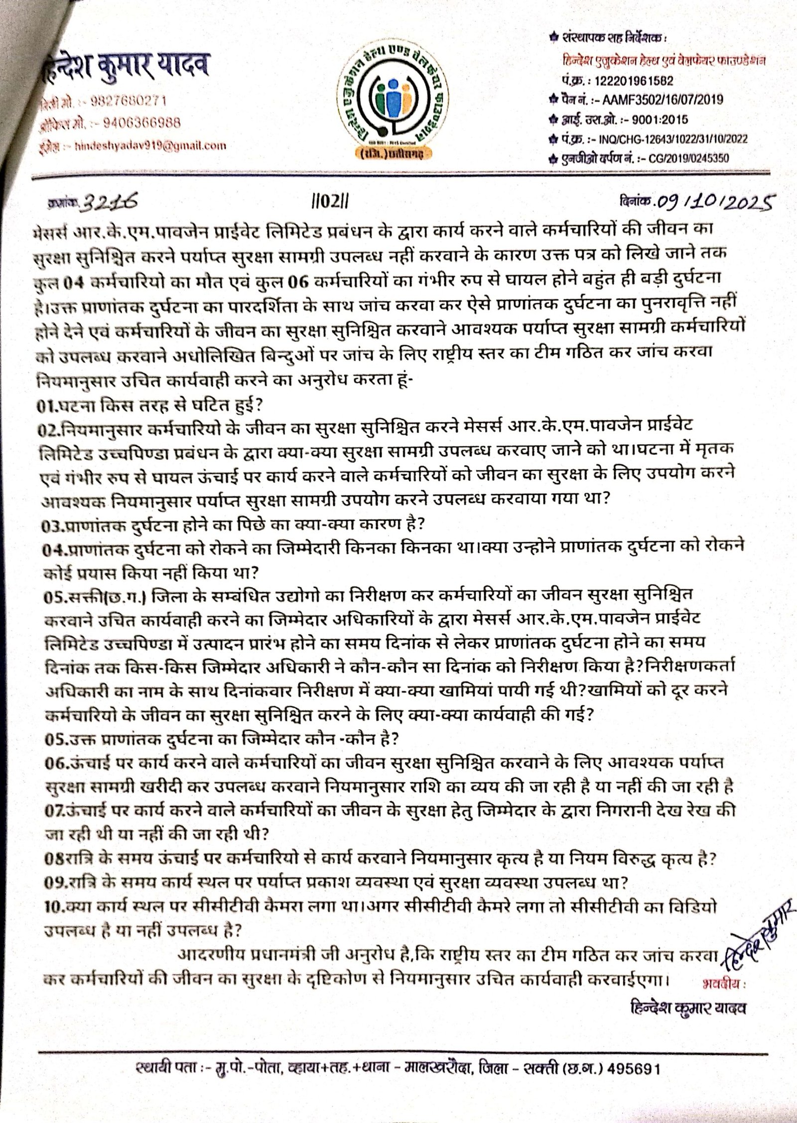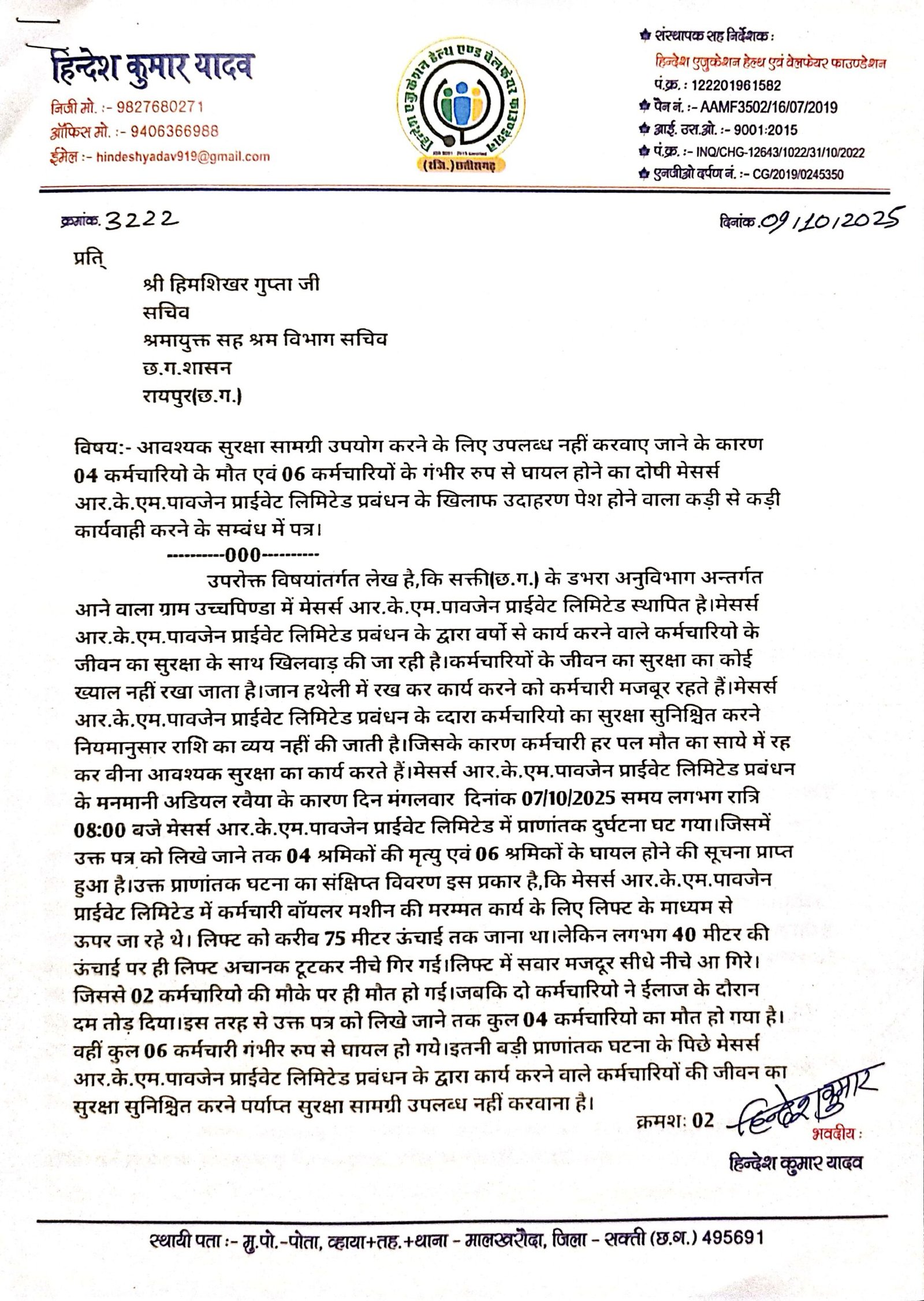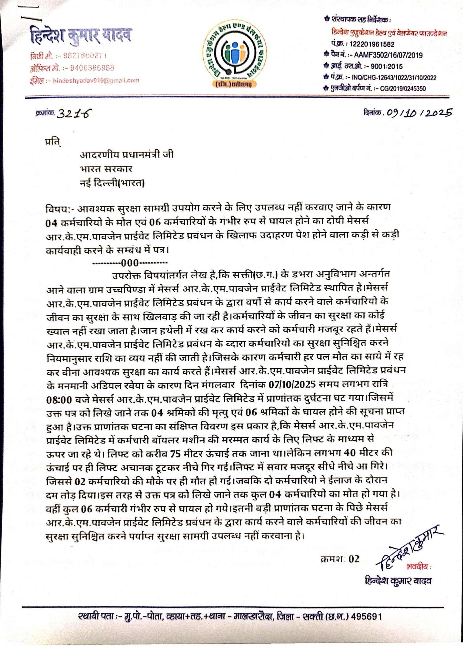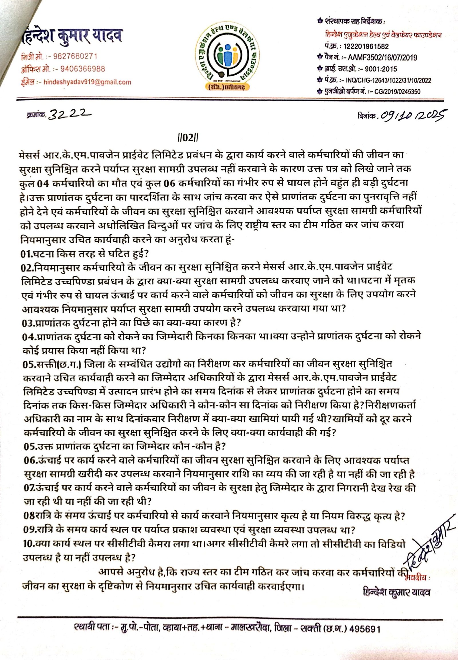 डभरा(एचकेपी 24 न्यूज)।आवश्यक पर्याप्त मात्रा में उपयोग करने योग्य जीवन का सुरक्षा सामग्री उपयोग करने के लिए उपलब्ध नहीं करवाए जाने एवं खराब जीवन का सुरक्षा सामग्री का उपयोग करते हुए कार्य करने के कारण 04 कर्मचारियो का मौत एवं 06 कर्मचारियों का गंभीर रुप से घायल होने की मामला का उच्च स्तरीय जांच टीम गठित कर जांच टीम से जांच करवा कर मजदूरों का जीवन के सुरक्षा का ख्याल नहीं रखने वाला मेसर्स आर.के.एम.पावजेन प्राईवेट लिमिटेड उच्चपिण्डा प्रबंधन के खिलाफ उदाहरण पेश होने वाला कड़ी से कड़ी कार्यवाही करने के लिए हिन्देश एजुकेशन हेल्थ एण्ड वेलफेयर फाउण्डेशन(रजिस्टर्ड) के फाउण्डर सह डायरेक्टर हिन्देश कुमार यादव ने पीएमओ,श्रम मंत्री भारत सरकार,सचिव श्रम मंत्रालय भारत सरकार तथा श्रमायुक्त सह सचिव श्रम मंत्रालय छ.ग.शासन को पत्र लिखा है।