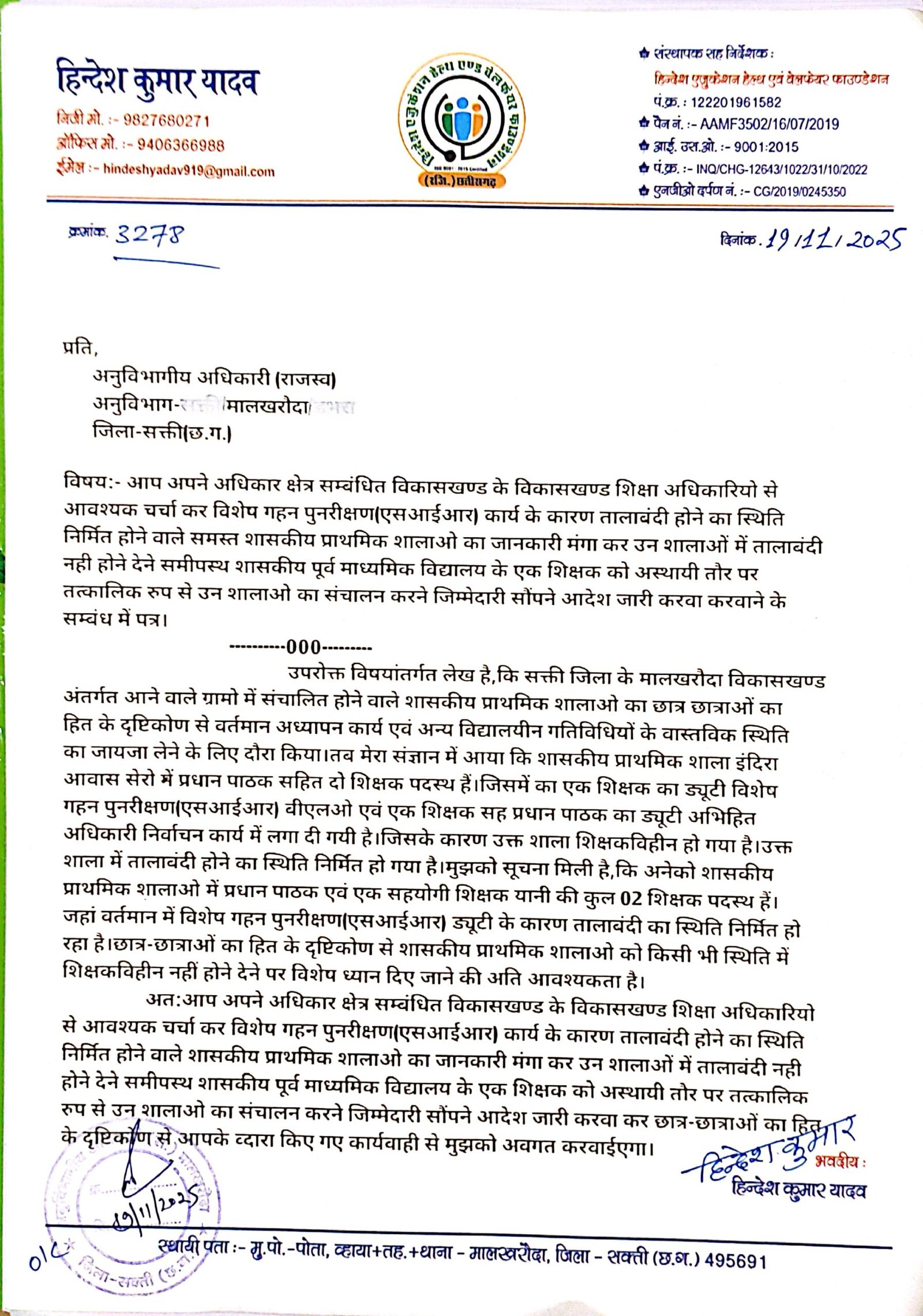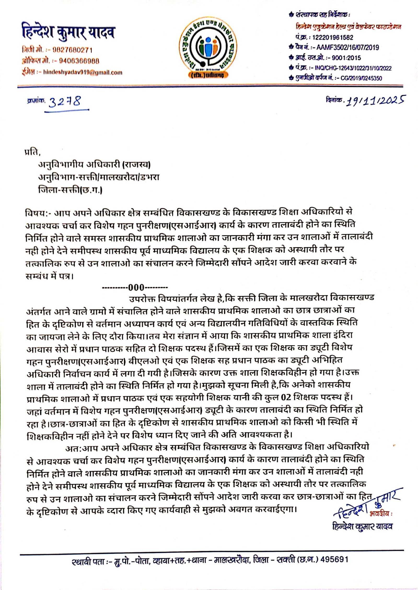 सक्ती(एचकेपी 24 न्यूज)।हिन्देश एजुकेशन हेल्थ एण्ड वेलफेयर फाउण्डेशन (रजिस्टर्ड) के चीफ हिन्देश कुमार यादव का औचक दौरा में शा.प्रा.शाला इंदिरा आवास सेरो(मालखरौदा) में पदस्थ दो शिक्षकों में से एक शिक्षक का बूथ लेवल आफिसर आफिसर एवं अभिहित अधिकारी दोनों शिक्षको का एसआईआर निर्वाचन कार्य में ड्यूटी लगने के कारण शाला का तालाबंदी होने का स्थिति निर्मित होते देख कर एसडीएम को पत्र लिख कर अपने अधिकार क्षेत्र सम्बंधित विकासखण्ड के बीईओ से आवश्यक चर्चा कर एसआईआर कार्य के कारण तालाबंदी होने का स्थिति निर्मित होने वाले समस्त शा.प्रा.शालाओ का जानकारी मंगा कर उन शालाओं में तालाबंदी नही होने देने समीपस्थ शा.पू.मा.वि. के एक शिक्षक को तत्कालिक रुप से उन शालाओ का संचालन करने जिम्मेदारी सौंपने आदेश जारी करवाने का मांग किया है।