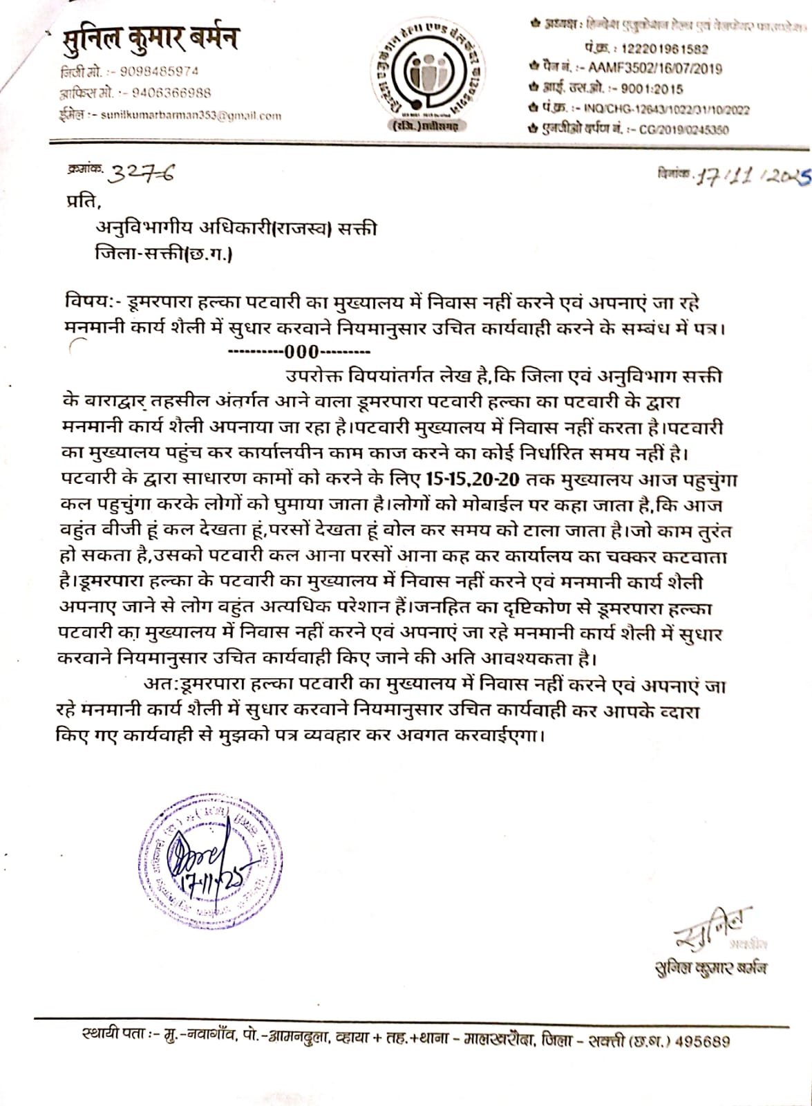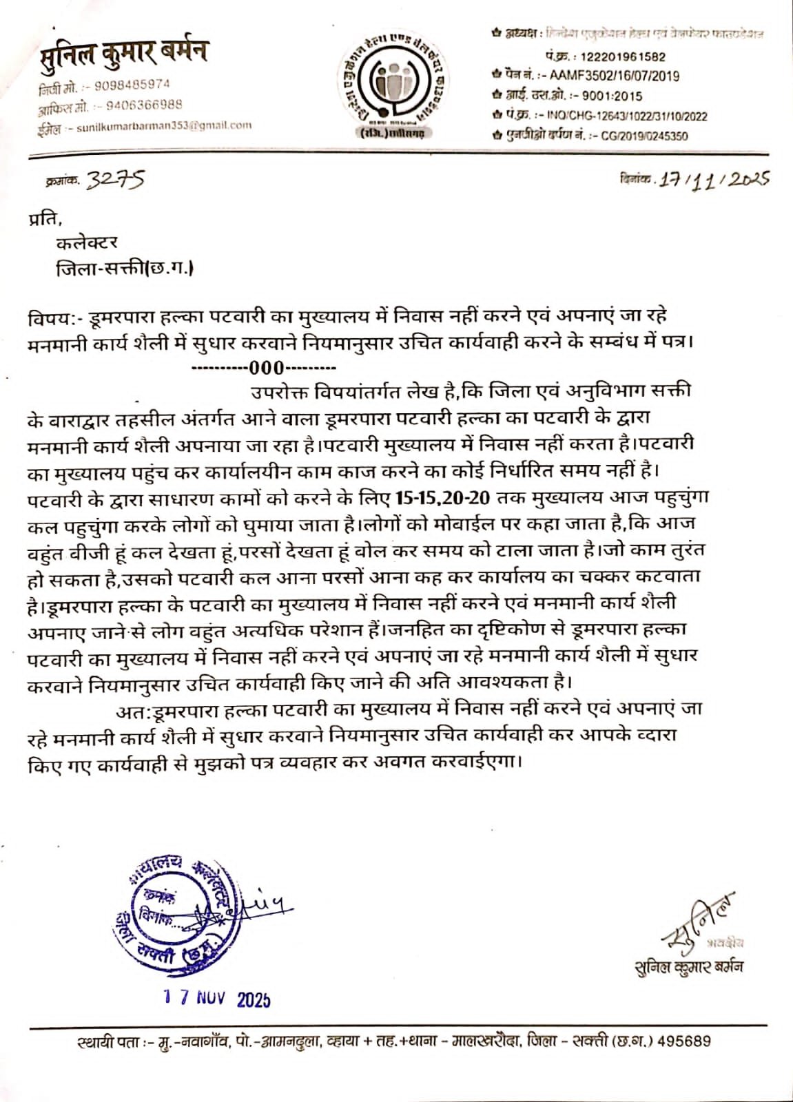 सक्ती(एचकेपी 24 न्यूज)।डूमरपारा (बाराद्वार)हल्का पटवारी का मुख्यालय में निवास नहीं करने,कार्यालय आना-जाना करने का निर्धारित समय नही होने,सामान्य काम के लिए लोगों को 15-15/20-20 दिनो तक आज जाऊंगा कल जाऊंगा कार्यालय करके लोगों को घूमाने,मोबाईल कॉल से संपर्क करने पर आज बहुंत बीजी हूं कल देखता हूं परसों देखता हूं बोल कर लोगों को कार्यालय का चक्कर कटवा कर परेशान करने वाला पटवारी के खिलाफ जनहित का दृष्टिकोण से नियमानुसार उचित कार्यवाही कर पटवारी का मनमानी कार्य शैली में सुधार करवाने एवं मुख्यालय में निवाब करने नियमानुसार उचित कार्यवाही हिन्देश एजुकेशन हेल्थ एण्ड वेलफेयर फाउण्डेशन (रजिस्टर्ड) के अध्यक्ष सुनिल कुमार बर्मन ने कलेक्टर एवं एसडीएम को पत्र लिखा है।