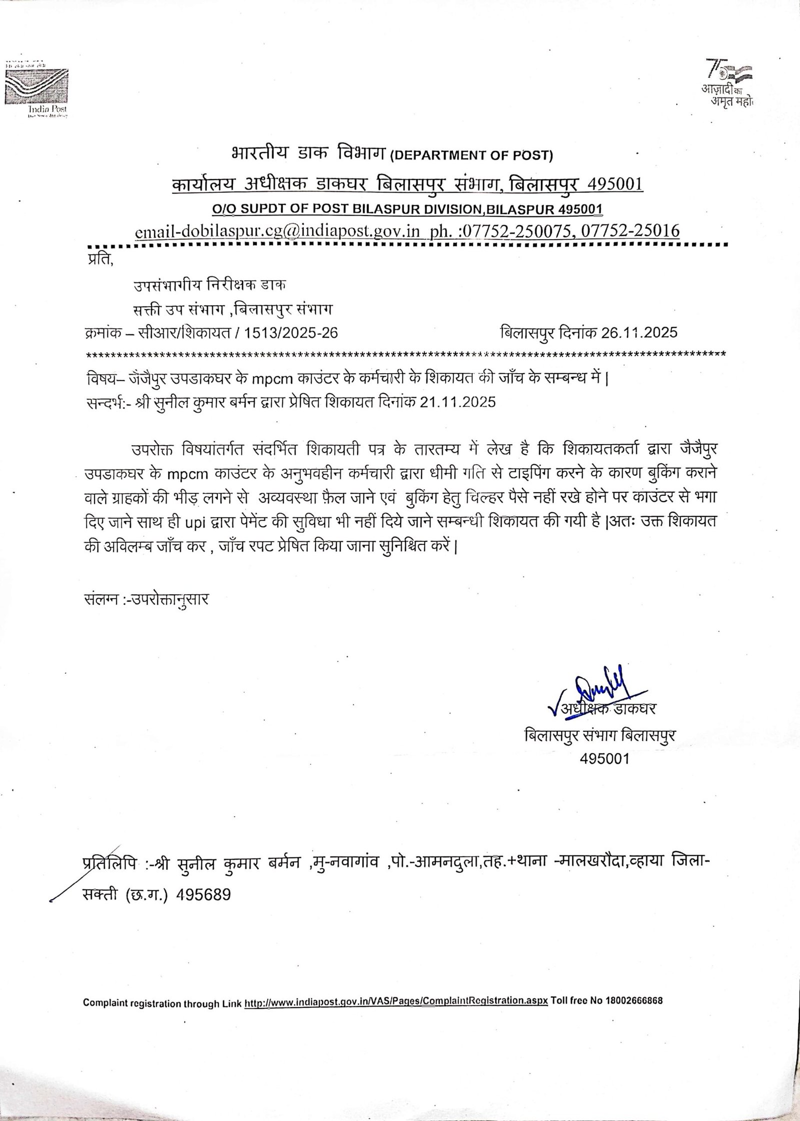 जैजैपुर-सक्ती(एचकेपी 24 न्यूज)।उप डाकघर जैजैपुर मे व्याप्त भारी अव्यवस्थाओ को लेकर हिन्देश एजुकेशन हेल्थ एण्ड वेलफेयर फाउण्डेशन का अध्यक्ष सुनिल कुमार बर्मन के द्वारा पत्र लिख कर लिखित रुप से शिकायत किए जाने के पश्चात् अधीक्षक डाकघर बिलासपुर संभाग ने उप संभागीय निरीक्षक डाक सक्ती उप संभाग को मामला का जांच कर आगे का कार्यवाही हेतु जांच प्रतिवेदन प्रेषित करने पत्र जारी किया है।