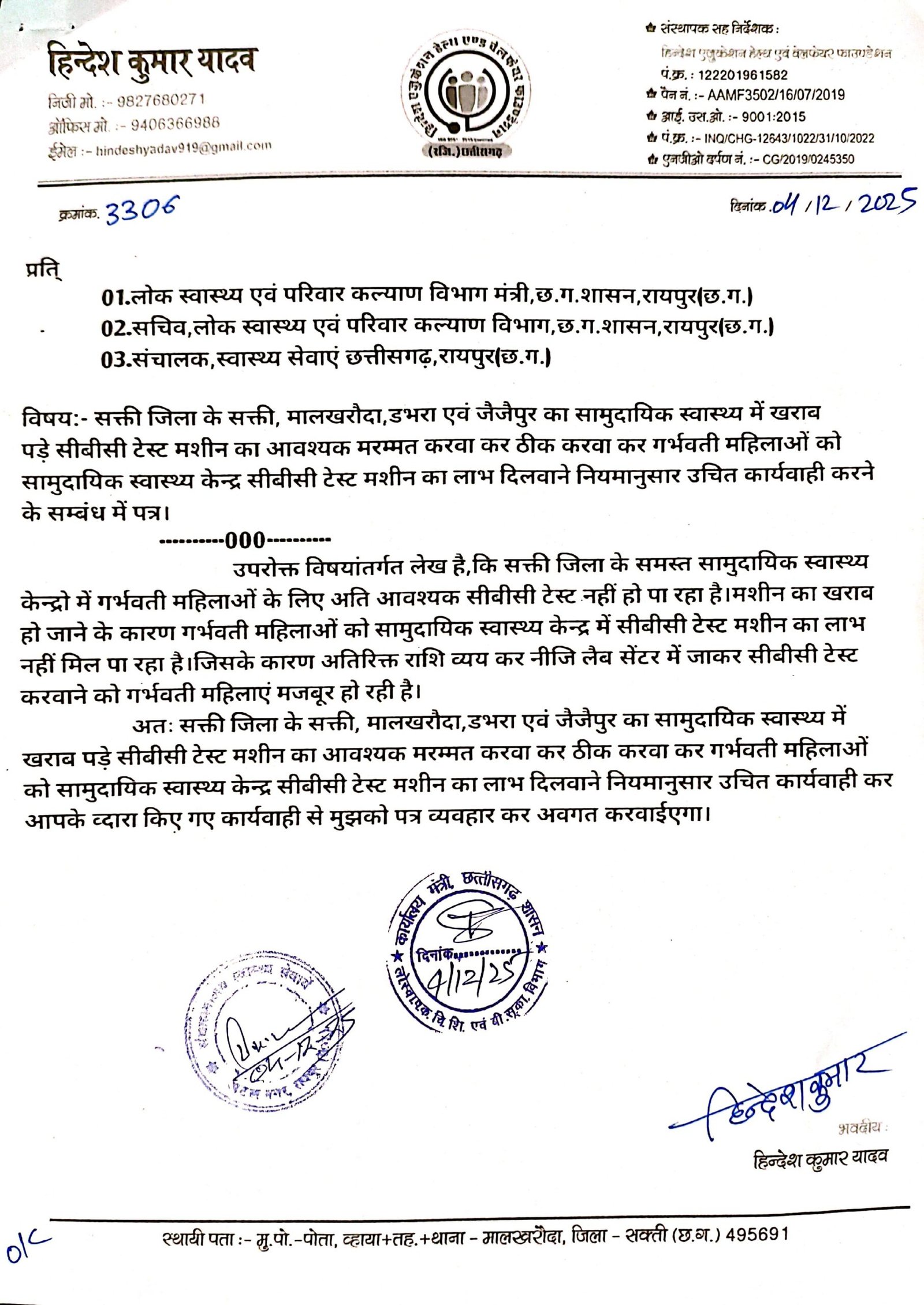 सक्ती(एचकेपी 24 न्यूज)।सक्ती,मालखरौदा,डभरा एवं जैजैपुर का सामुदायिक स्वास्थ्य में खराब पड़े सीबीसी टेस्ट मशीन के कारण गर्भवती महिलाओ को होने वाली परेशानियो को स्वत:संज्ञान में लेते हुए हिन्देश एजुकेशन हेल्थ एण्ड वेलफेयर फाउण्डेशन (रजिस्टर्ड) के फाउण्डर सह डायरेक्टर हिन्देश कुमार यादव ने लोक स्वास्थ्य एवं परिवार कल्याण विभाग मंत्री छ.ग.शासन तथा संचालक स्वास्थ्य सेवाएं छत्तीसगढ़ को गर्भवती महिलाओ का समस्या को निराकरण करवाने आवश्यक मरम्मत करवा कर ठीक करवा कर गर्भवती महिलाओं को सामुदायिक स्वास्थ्य केन्द्र में सीबीसी टेस्ट मशीन का लाभ दिलवाने नियमानुसार उचित कार्यवाही करने के लिए पत्र लिखा है।