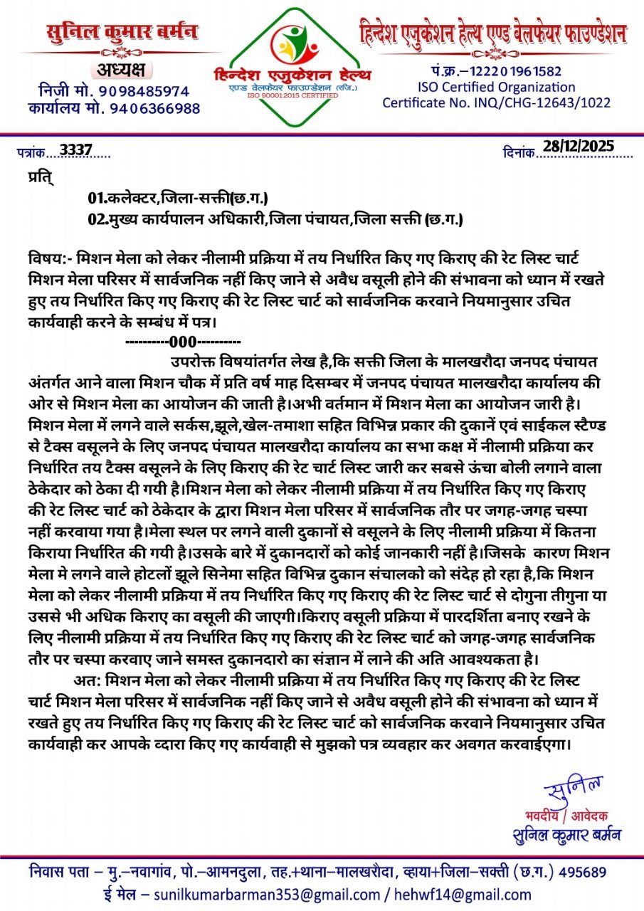 मालखरौदा:- मिशन मेला को लेकर नीलामी प्रक्रिया में तय निर्धारित किए गए किराए की रेट लिस्ट चार्ट मिशन मेला परिसर में सार्वजनिक नहीं किए जाने से अवैध वसूली होने की संभावना को ध्यान में रखते हुए तय निर्धारित किए गए किराए की रेट लिस्ट चार्ट को सार्वजनिक करवाने नियमानुसार उचित कार्यवाही करने के लिए हिन्देश एजुकेशन हेल्थ एण्ड वेलफेयर फाउण्डेशन(रजिस्टर्ड) के अध्यक्ष सुनिल कुमार बर्मन ने कलेक्टर एवं सीईओ जिला पंचायत को लिखा पत्र…