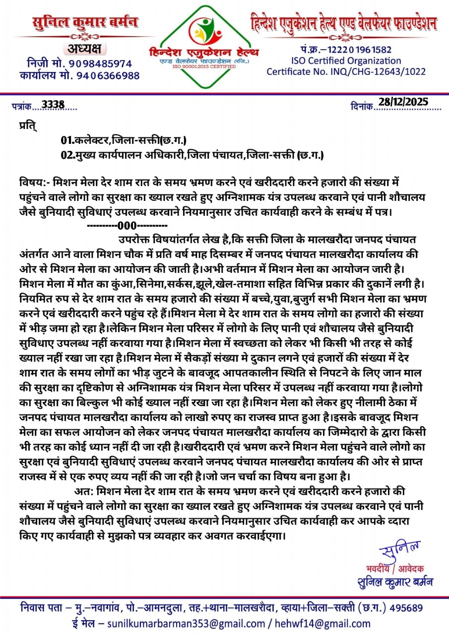 मालखरौदा:- मिशन मेला में देर शाम रात के समय भ्रमण करने एवं खरीददारी करने हजारो की संख्या में पहुंचने वाले लोगो का सुरक्षा का ख्याल रखते हुए अग्निशामक यंत्र उपलब्ध करवाने एवं पानी शौचालय जैसे बुनियादी सुविधाएं उपलब्ध करवाने नियमानुसार उचित कार्यवाही करने के लिए हिन्देश एजुकेशन हेल्थ एण्ड वेलफेयर फाउण्डेशन (रजिस्टर्ड) के अध्यक्ष सुनिल कुमार बर्मन ने कलेक्टर एवं सीईओ जिला पंचायत को लिखा पत्र…