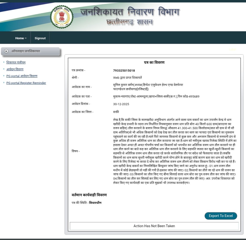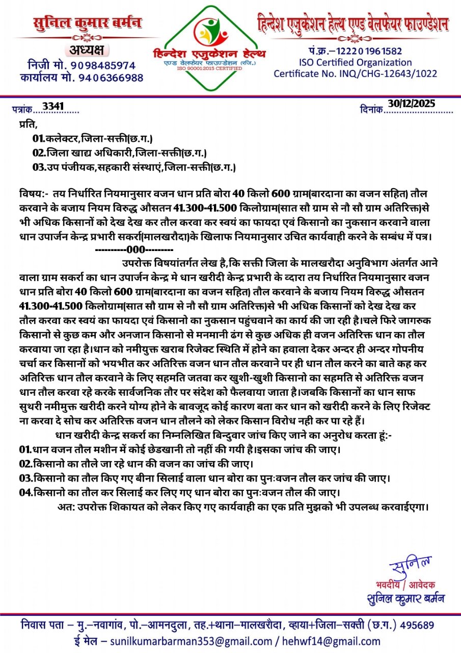 मालखरौदा(एचकेपी 24 न्यूज)।तय निर्धारित नियमानुसार वजन धान प्रति बोरा 40 किलो 600 ग्राम(बारदाना का वजन सहित) तौल करवाने के बजाय नियम विरुद्ध औसतन 41.300-41.500 किलोग्राम(सात सौ ग्राम से नौ सौ ग्राम अतिरिक्त)से भी अधिक किसानों को देख देख कर तौल करवा कर स्वयं का फायदा एवं किसानो का नुकसान करवाने वाला धान उपार्जन केन्द्र प्रभारी सकर्रा(मालखरौदा)के खिलाफ नियमानुसार उचित कार्यवाही करने हिन्देश एजुकेशन हेल्थ एण्ड वेलफेयर फाउण्डेशन (रजिस्टर्ड) के अध्यक्ष सुनिल कुमार बर्मन ने जनशिकायत निवारण विभाग छत्तीसगढ़ शासन,कलेक्टर,जिला खाद्य अधिकारी एवं उप पंजीयक सहकारी संस्थाएं जिला सक्ती को पत्र लिखा है।
