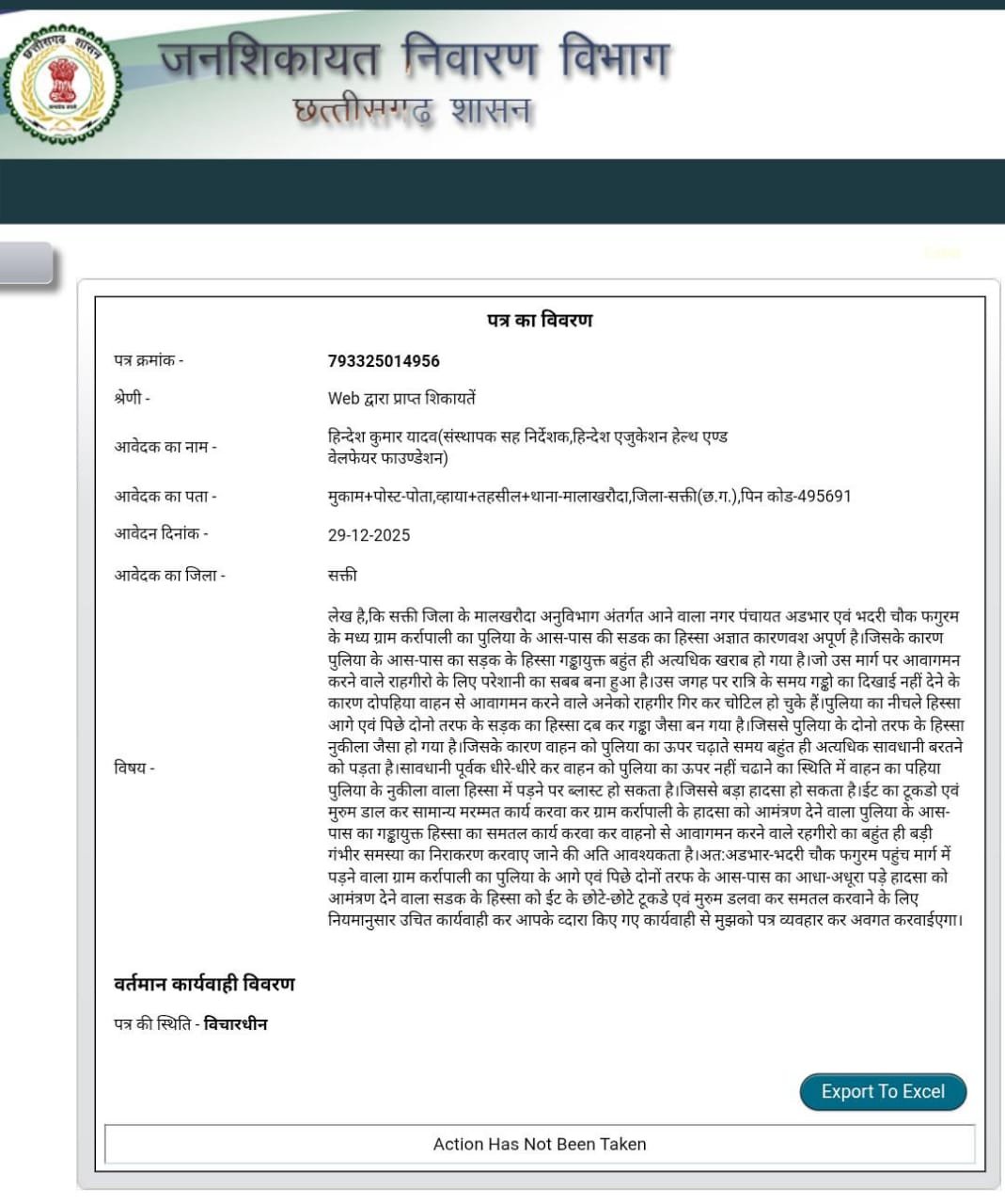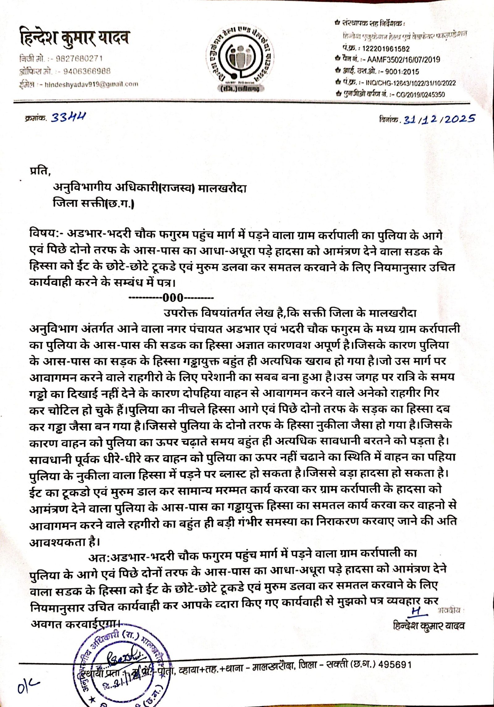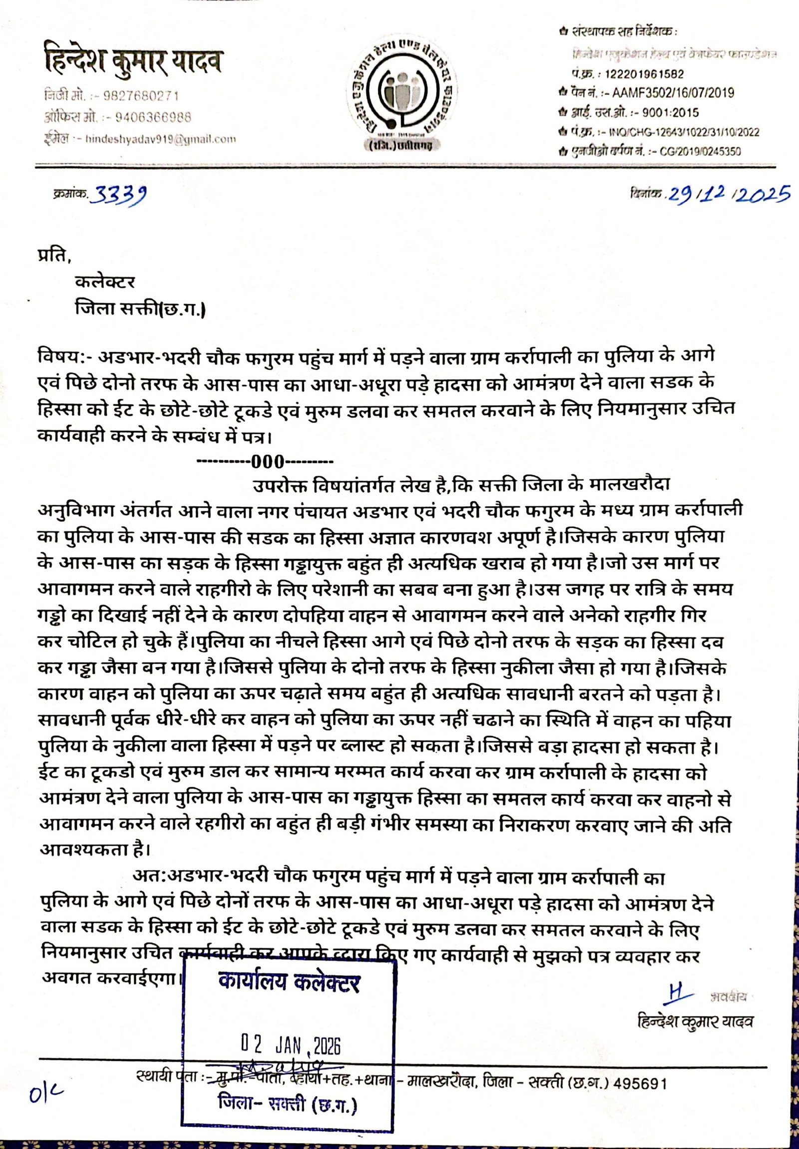 मालखरौदा(एचकेपी 24 न्यूज)।सक्ती-टुण्ड्री पहुंच मार्ग में स्थित ग्राम कर्रापाली के सड़क का पुलिया के आस-पास हिस्सा की गड्ढा बनने दब जाने से पुलिया का ऊंचाई बढ़ने के कारण पुलिया की दोनो तरफ के हिस्सा का नुकीला हो जाने से वाहनो के पहिया का आवागमन करने के दौरान पुलिया का नुकीले हिस्सो से टकरा कर ब्लास्ट होकर बडा हादसा होने का हर पल संभावना बना हुआ है। हादसा को आमंत्रण देने वाला सडक का पुलिया के आस-पास गड्ढायुक्त दबने वाला हिस्सो मे ईट का छोटा-छोटा टुकडा एवं मुरुम डलवा कर पुलिया एवं सडक को समतल करवाने नियमानुसार उचित कार्यवाही करने हिन्देश एजुकेशन हेल्थ एण्ड वेलफेयर फाउण्डेशन के संस्थापक सह निर्देशक हिन्देश कुमार यादव ने जनशिकायत निवारण विभाग छ.ग.शासन,कलेक्टर एवं एसडीएम को पत्र लिखा है।