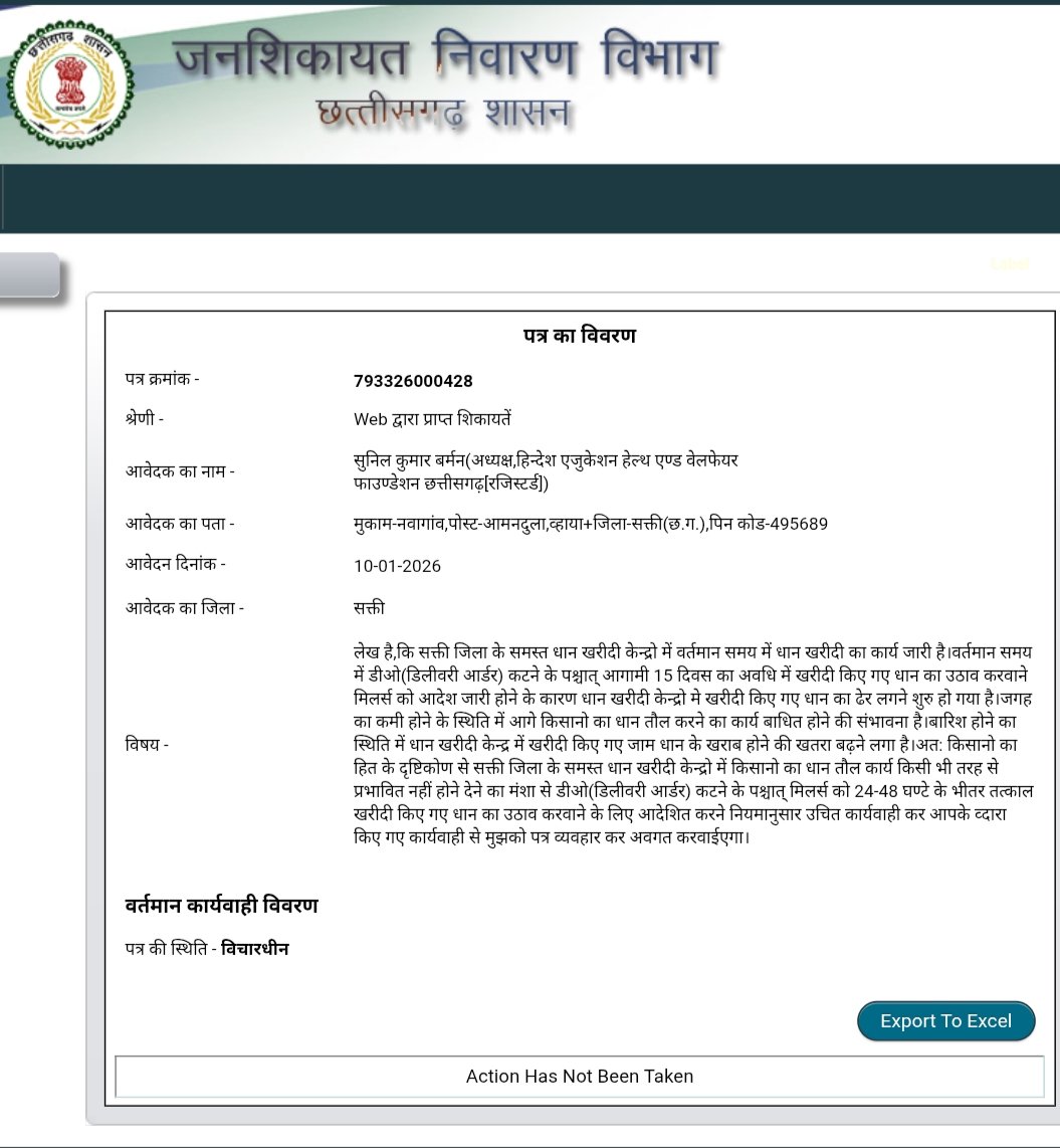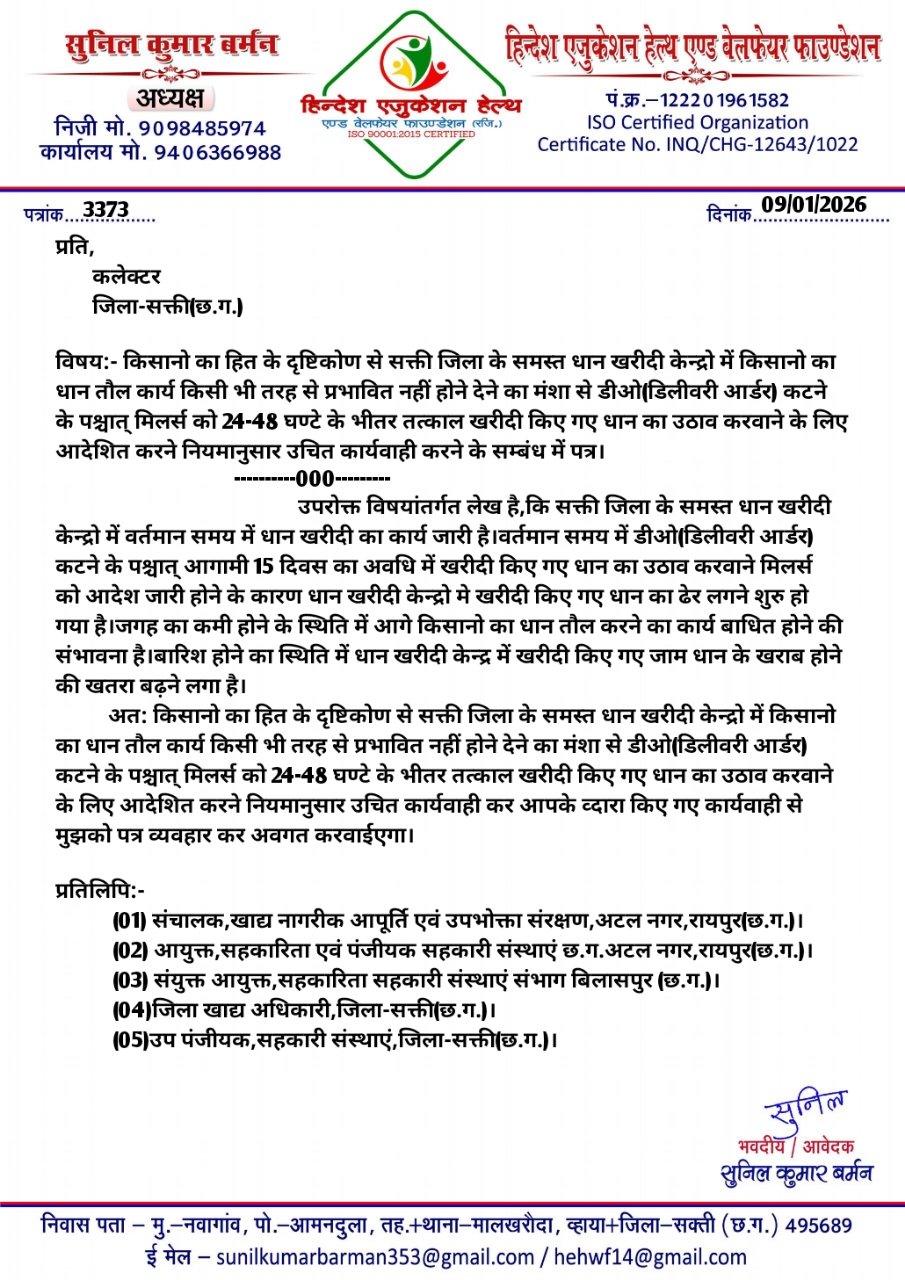 सक्ती(एचकेपी 24 न्यूज)।डीओ कटने के पश्चात् आगामी 15 दिवस का अवधि में खरीदी किए गए धान का उठाव करने मिलर्स को आदेश जारी होने से धान खरीदी केन्द्रो में धान के जाम का स्थिति निर्मित होने से बारिश होने का स्थिति मे खरीदी किए गए धान खरीदी केन्द्र में जाम धान का खराब होने का संभावना एवं आगे किसानो का धान तौल संभावित बाधित होने को ध्यान में रखते हुए किसानो का हित के दृष्टिकोण से सक्ती जिला के समस्त धान खरीदी केन्द्रो में किसानो का धान तौल कार्य किसी भी तरह से प्रभावित नहीं होने देने डीओ(डिलीवरी आर्डर) कटने के पश्चात् मिलर्स को 24-48 घण्टे के भीतर तत्काल खरीदी किए गए धान का उठाव करवाने के लिए आदेश जारी कर नियमानुसार उचित कार्यवाही करने जन शिकायत निवारण विभाग छ.ग.शासन एवं कलेक्टर को हिन्देश एजुकेशन हेल्थ एण्ड वेलफेयर फाउण्डेशन के अध्यक्ष सुनिल कुमार बर्मन ने पत्र लिखा है।