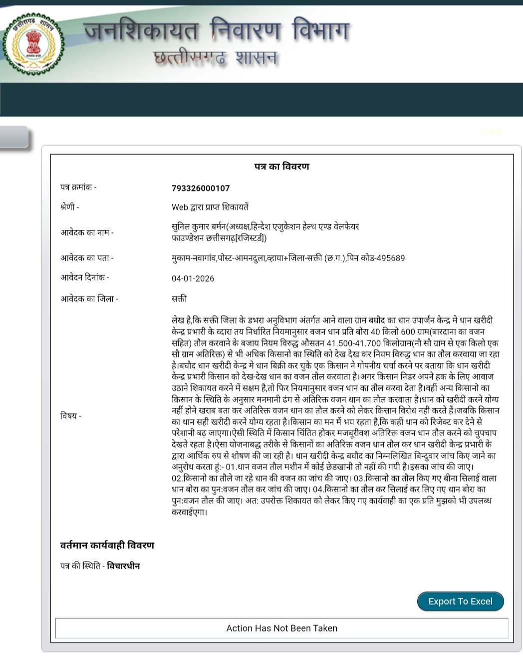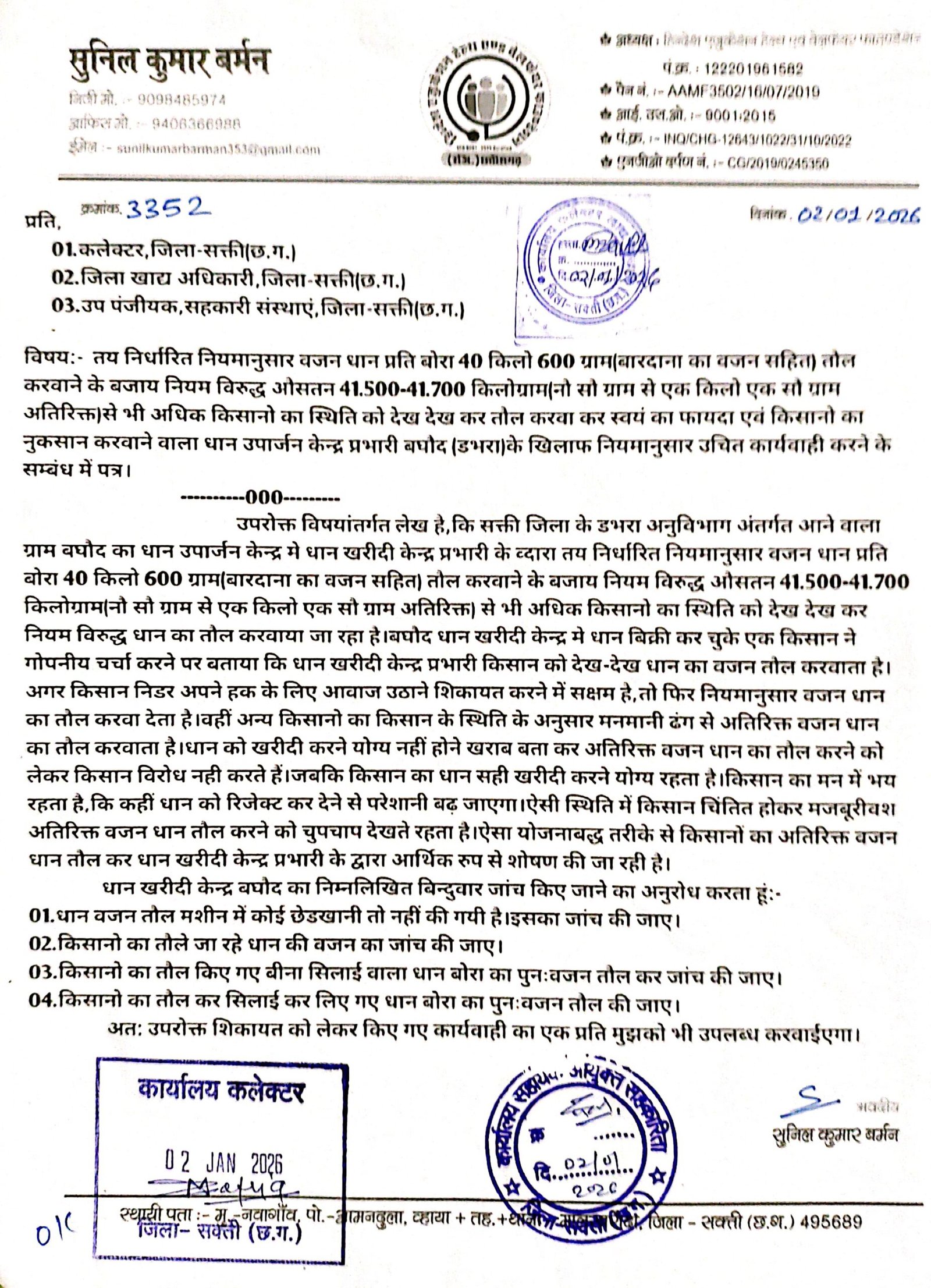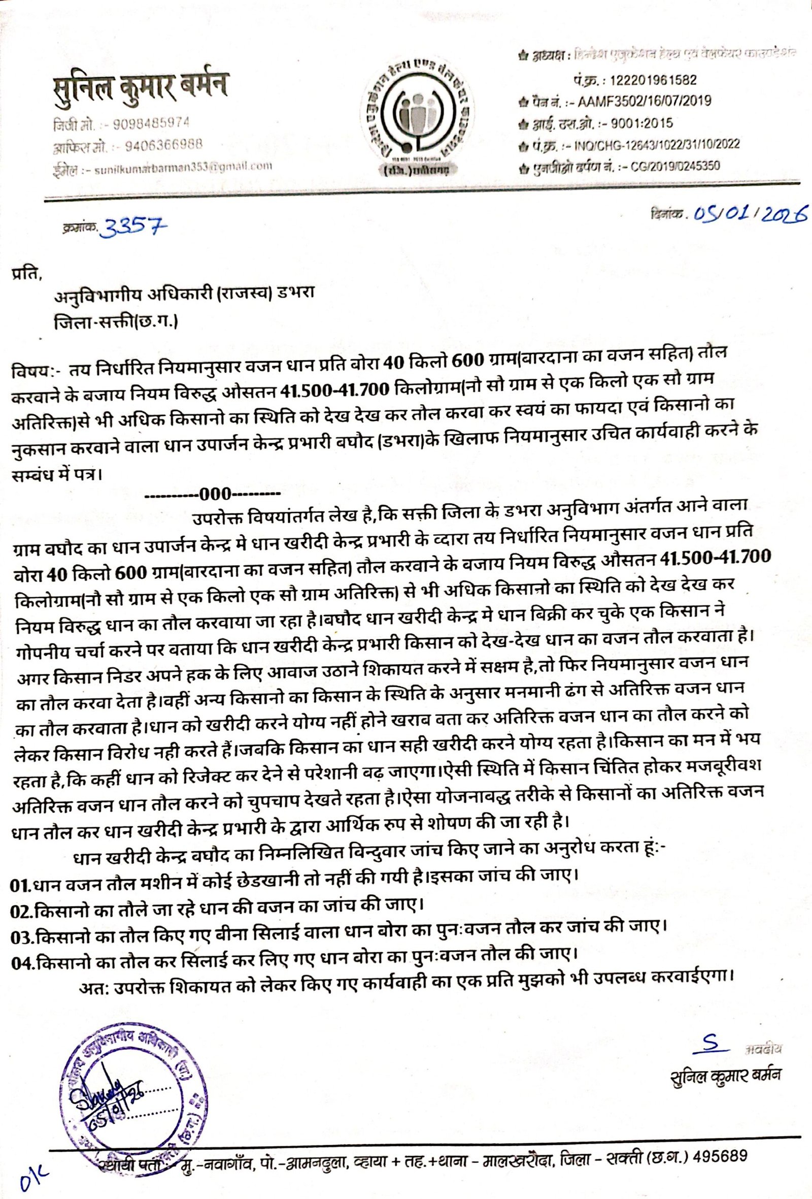 डभरा(एचकेपी 24 न्यूज)।तय वजन से औसतन नौ सौ ग्राम से एक किलो एक सौ ग्राम तक तो कुछ-कुछ किसानो से डेढ किलोग्राम तक भी अधिक वजन धान का प्रति बोरा तौल करवा कर धान खरीदी केन्द्र प्रभारी किसानो का आर्थिक रुप से शोषण कर रहा है।धान मे कुछ खामियां बता कर धान को तौल करने के लिए रिजेक्ट कर वापस घर ना ले जाने को बोल दे करके डर से अपने आंख के सामने अधिक वजन तौल को देखते हुए भी किसान अधिक वजन धान तौल करने को लेकर विरोध नही कर पा रहे है।धान खरीदी केन्द्र प्रभारी बघौद (डभरा)के खिलाफ नियमानुसार उचित कार्यवाही करने हिन्देश एजुकेशन हेल्थ एण्ड वेलफेयर फाउण्डेशन (रजिस्टर्ड) के अध्यक्ष सुनिल कुमार बर्मन ने जनशिकायत निवारण विभाग छत्तीसगढ़ शासन,कलेक्टर,एसडीएम,जिला खाद्य अधिकारी,उप पंजीयक सहकारी संस्थाएं जिला सक्ती को पत्र लिखा है।