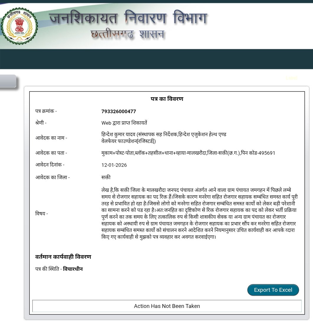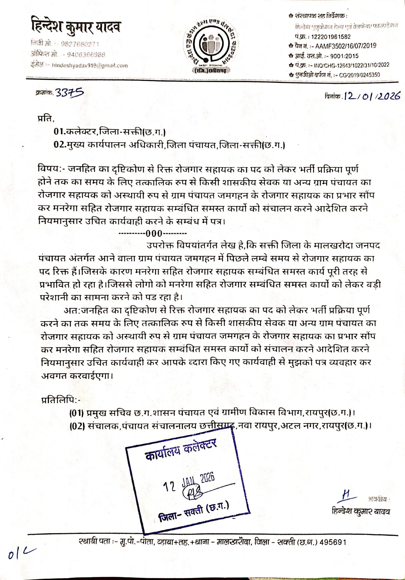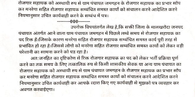 मालखरौदा(एचकेपी 24 न्यूज)।पिछले लम्बा समय से ग्राम पंचायत जमगहन का रोजगार सहायक पद रिक्त है।मनरेगा सहित रोजगार सहायक सम्बंधित समस्त कार्यो का प्रभावित होने से आम जनता परेशान हो रहे है।जनहित का दृष्टिकोण से रिक्त रोजगार सहायक का पद को लेकर भर्ती प्रक्रिया पूर्ण होने तक का समय के लिए तत्कालिक रुप से किसी शासकीय सेवक या अन्य ग्राम पंचायत का रोजगार सहायक को अस्थायी रुप से ग्राम पंचायत जमगहन के रोजगार सहायक का प्रभार सौंप कर मनरेगा सहित रोजगार सहायक सम्बंधित समस्त कार्यो को संचालन करने आदेशित करने हिन्देश एजुकेशन हेल्थ एण्ड वेलफेयर फाउण्डेशन के संस्थापक सह निर्देशक हिन्देश कुमार यादव ने जनशिकायत विभाग छ.ग.शासन,कलेक्टर एवं सीईओ जिला पंचायत को पत्र लिखा है।