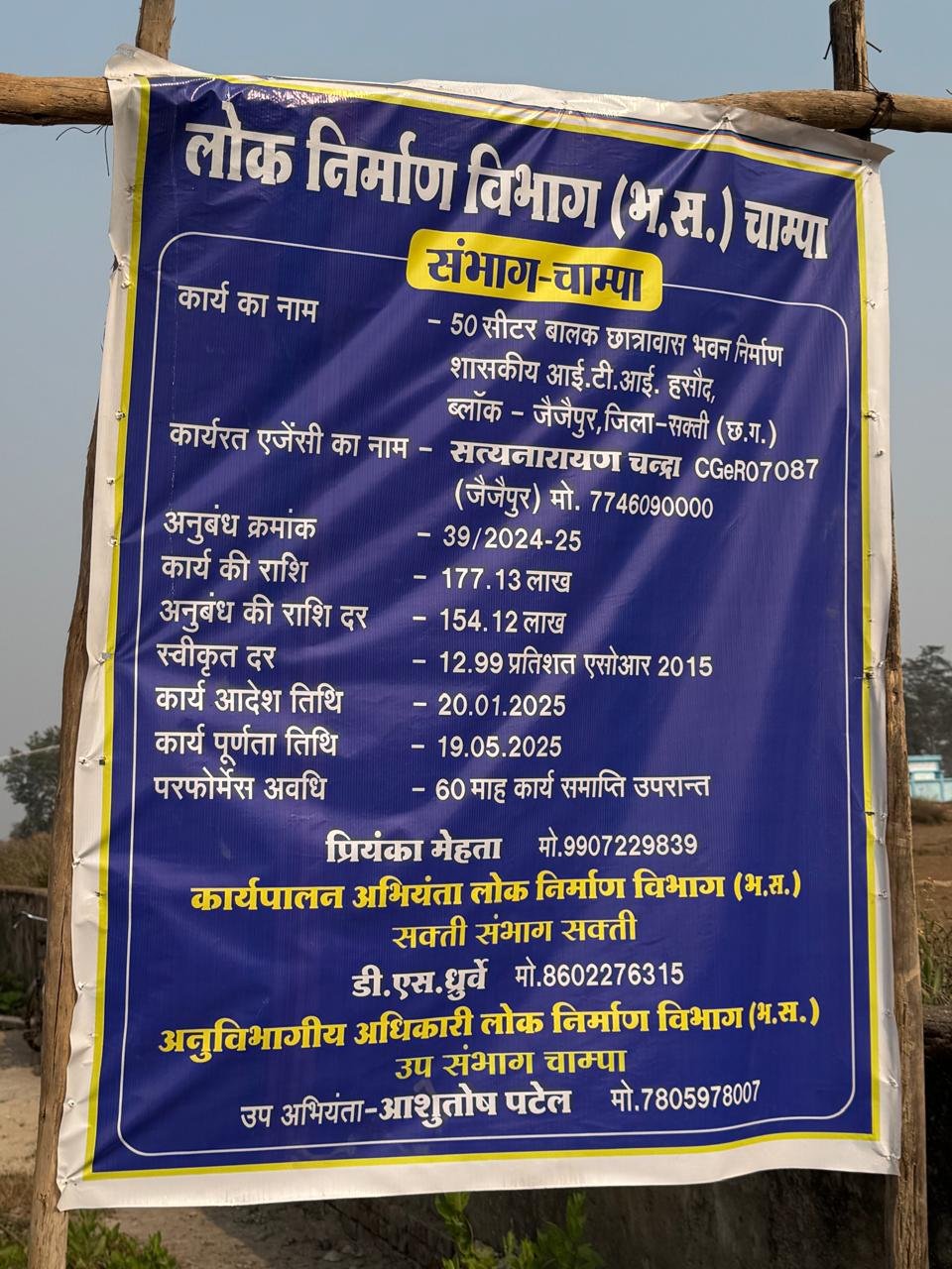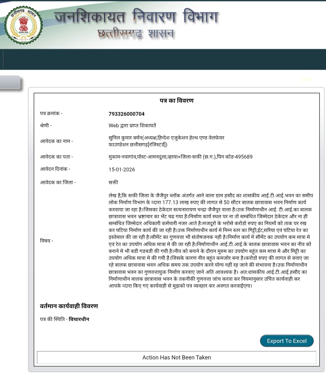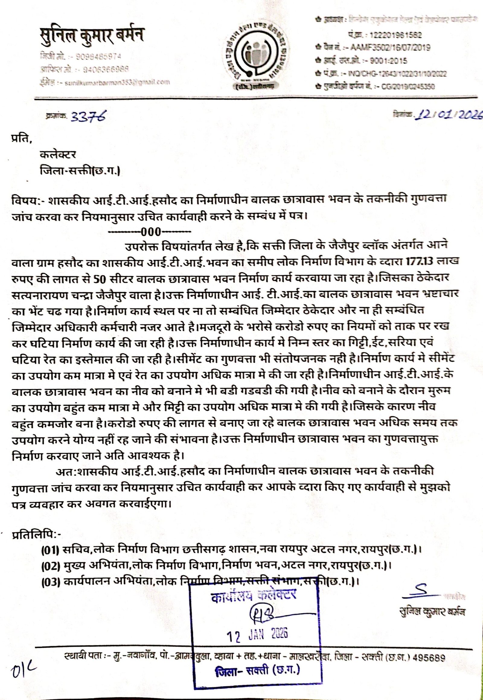 जैजैपुर(एचकेपी 24 न्यूज)।शासकीय आई.टी.आई.हसौद का 177.13 लाख रुपए की लागत से पीडब्ल्यूडी विभाग व्दारा ठेकेदार के माध्यम से बनवाए जा रहे 50 सीटर बालक छात्रावास भवन भ्रष्टाचार का भेंट चढ गया है।निर्माण कार्य मे निम्न स्तर की ईट,गिट्टी,रेत,मुरुम,सीमेंट एवं सरिया का उपयोग की जा रही है।सीमेंट का मात्रा कम और रेत का मात्रा अधिक कर मसाला तैयार कर निर्माण कार्य मे उपयोग की जा रही है।छात्रावास भवन का नीव मे मुरुम को कम कर मिट्टी का मात्रा अधिक किए जाने से नीव कमजोर बन गया है।निर्माण कार्य स्थल पर ठेकेदार सहित जिम्मेदार अधिकारी-कर्मचारी नजर नही आते है।हिन्देश एजुकेशन हेल्थ एण्ड वेलफेयर फाउण्डेशन का अध्यक्ष सुनिल कुमार बर्मन ने निर्माणाधीन गुणवत्ताविहीन आई.टी.आई.हसौद बालक छात्रावास भवन का तकनीकी गुणवत्ता जांच करवाकर नियमानुसार उचित कार्यवाही करने जनशिकायत निवारण विभाग छ.ग.शासन एवं कलेक्टर को पत्र लिखा है।