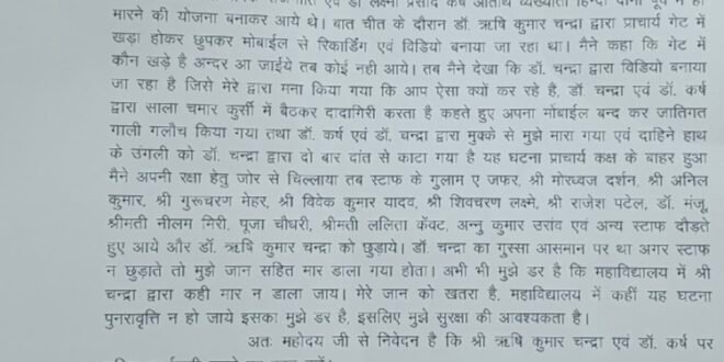 डभरा(एचकेपी 24 न्यूज)।शासकीय नवीन महाविद्यालय चन्द्रपुर मे पदस्थ दो कर्मचारियों ने मिल कर प्रभारी प्राचार्य से मारपीट किया है।प्रभारी प्राचार्य ने अपने साथ हुए मारपीट को लेकर थाना मे लिखित शिकायत किया है।
