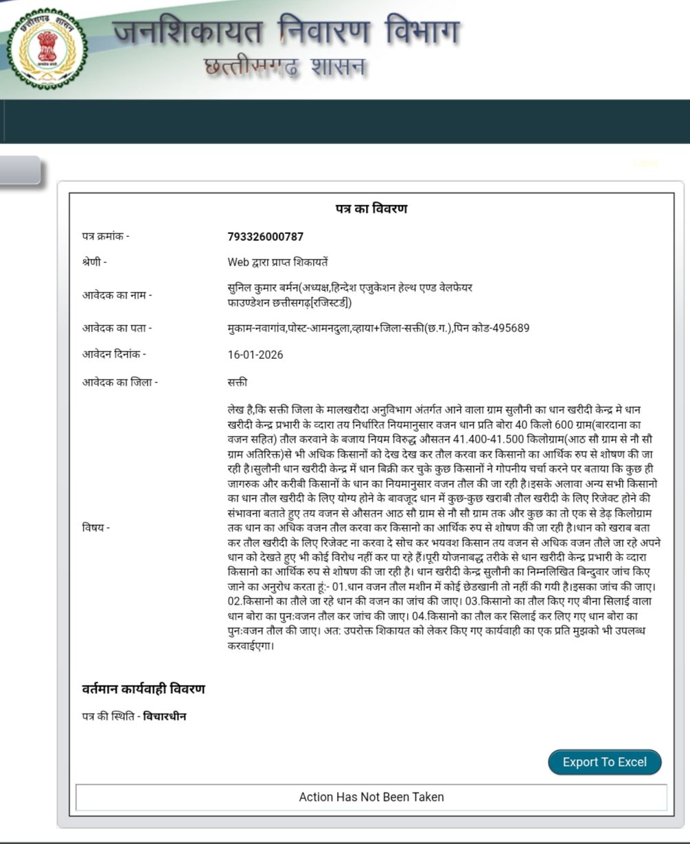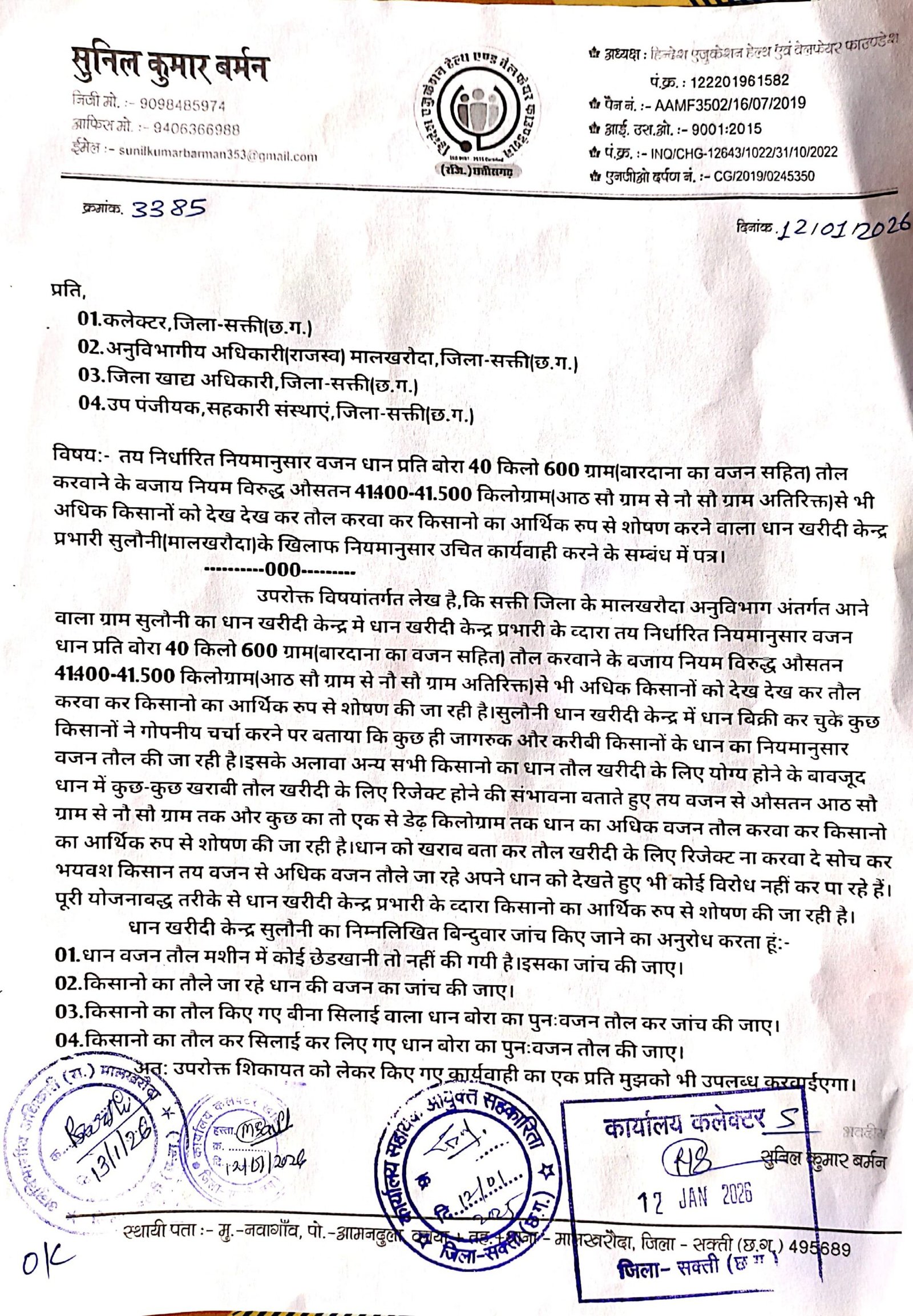मालखरौदा(एचकेपी 24 न्यूज)।सुलौनी धान खरीदी केन्द्र प्रभारी नियम कानून को ताक पर रखते हुए तय वजन से औसतन 900 ग्राम तो नियम से अनजान किसानो का तो एक से डेढ किलोग्राम तक अधिक धान वजन तौल करवा कर किसानो का आर्थिक रुप से शोषण कर रहा है।धान खरीदी केन्द्र प्रभारी के खिलाफ नियमानुसार उचित कार्यवाही करने हिन्देश एजुकेशन हेल्थ एण्ड वेलफेयर फाउण्डेशन के अध्यक्ष सुनिल कुमार बर्मन ने जनशिकायत निवारण विभाग,कलेक्टर,एसडीएम,जिला खाद्य अधिकारी एवं उप पंजीयक सहकारी संस्थाएं को पत्र लिखा है।