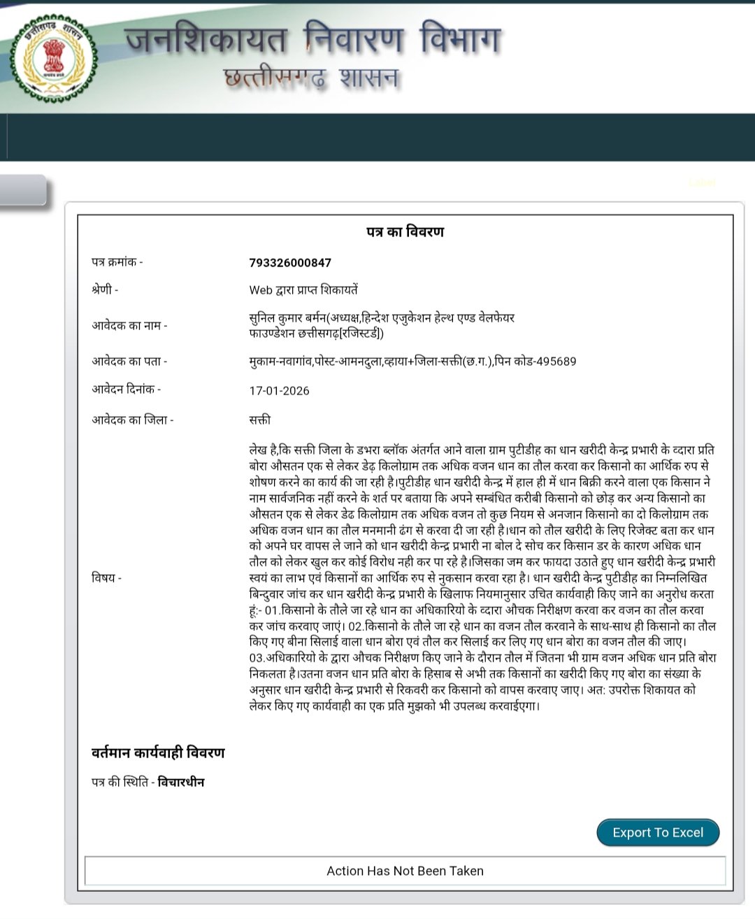 डभरा(एचकेपी 24 न्यूज)।पुटीडीह धान खरीदी केन्द्र प्रभारी औसतन एक से डेढ़ किलोग्राम अधिक धान का वजन तौल करवा कर किसानो का आर्थिक रुप से शोषण कर रहा है।पूर्व में किसानों का तौल कर खरीदी किए गए अधिक वजन धान को धान खरीदी केन्द्र प्रभारी से रिकवरी कर किसानो को वापसी करवाने के साथ ही धान खरीदी केन्द्र प्रभारी के खिलाफ नियमानुसार उचित कार्यवाही करने हिन्देश एजुकेशन हेल्थ एण्ड वेलफेयर फाउण्डेशन के अध्यक्ष सुनिल कुमार बर्मन ने जनशिकायत निवारण विभाग,कलेक्टर,एसडीएम,जिला खाद्य अधिकारी एवं सहायक पंजीयक सहकारी संस्थाएं को पत्र लिखा है।