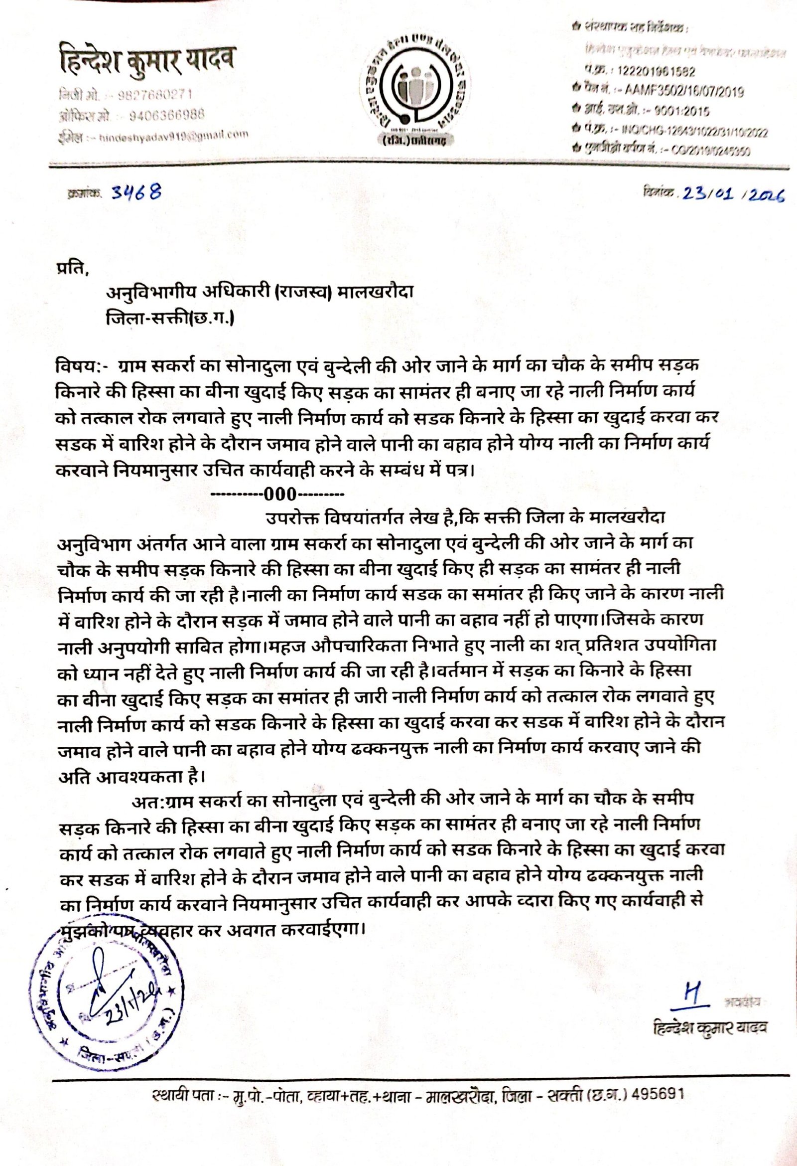 मालखरौदा(एचकेपी 24 न्यूज)।ग्राम सकर्रा का सोनादुला एवं बुन्देली की ओर जाने के मार्ग का चौक के समीप सड़क किनारे की हिस्सा का बीना खुदाई किए सड़क का सामंतर ही बनाए जा रहे नाली निर्माण कार्य को तत्काल रोक लगवाते हुए नाली निर्माण कार्य को सडक किनारे के हिस्सा का खुदाई करवा कर सडक में बारिश होने के दौरान जमाव होने वाले पानी का बहाव होने योग्य ढक्कनयुक्त नाली का निर्माण कार्य करवाने नियमानुसार उचित कार्यवाही करने हिन्देश एजुकेशन हेल्थ एण्ड वेलफेयर फाउण्डेशन के संस्थापक सह निर्देशक हिन्देश कुमार यादव ने एसडीएम को पत्र लिखा है।