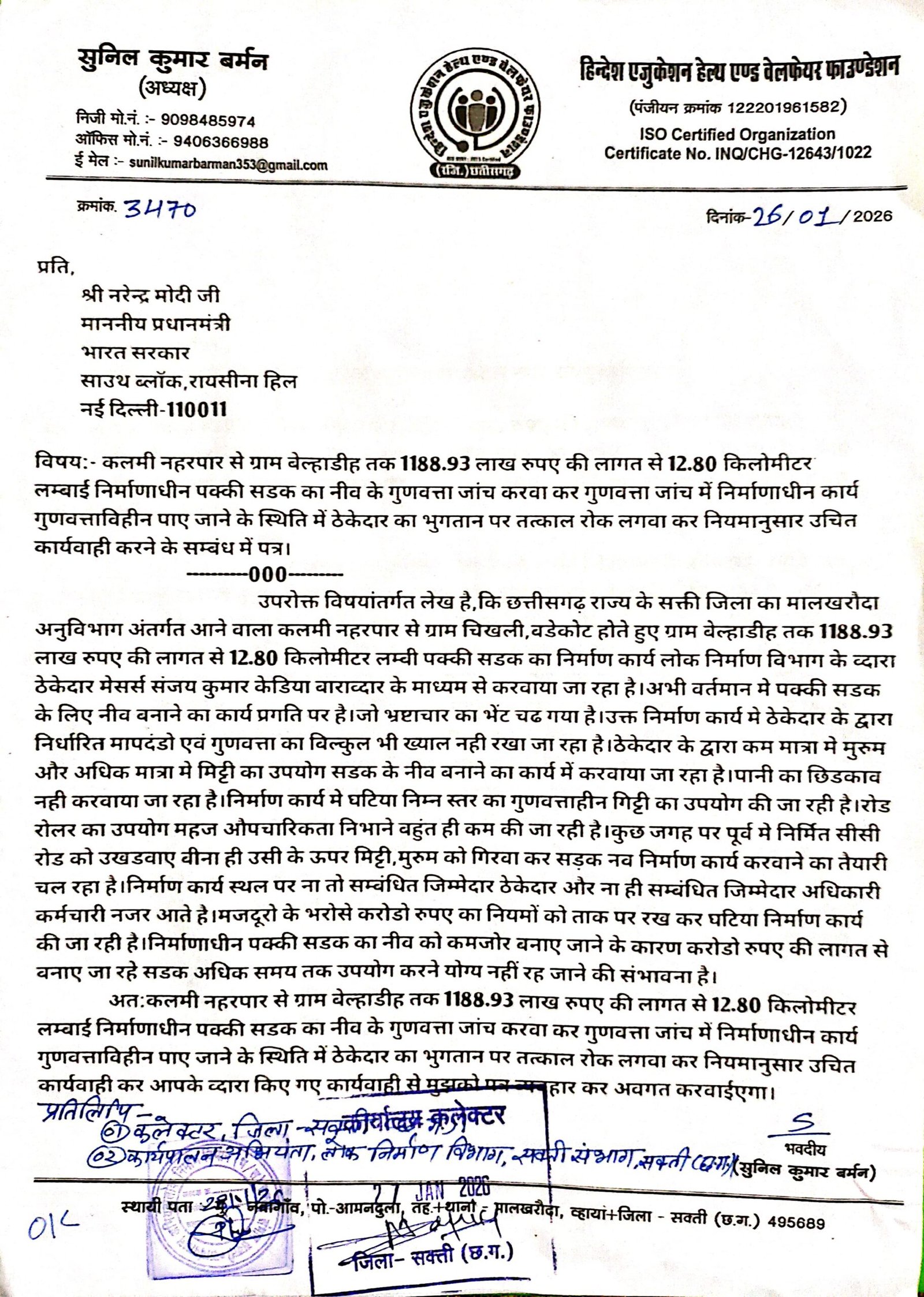 मालखरौदा(एचकेपी 24 न्यूज)।12 करोड की लागत से PWD के व्दारा ठेकेदार संजय कुमार केडिया के माध्यम से बनवाए जा रहे कलमी नहरपार से बेल्हाडीह तक 13.00 कि.मी.लम्बी निर्माणाधीन पक्की सडक का नीव निर्माण कार्य में निर्धारित मापदंडो एवं गुणवत्ता का ख्याल नही रखा जा रहा है।पानी का छिडकाव नही करवाया जा रहा है।घटिया गिट्टी का उपयोग हो रहा है।रोड रोलर का बहुंत ही कम उपयोग की जा रही है।कुछ जगह पर पूर्व मे निर्मित सीसी रोड को उखडवाए बीना ही उसी के ऊपर मिट्टी,मुरुम को गिरवा कर निर्माण कार्य करवाया जा रहा है।निर्माणाधीन पक्की सडक का गुणवत्ता जांच में निर्माणाधीन कार्य गुणवत्ताविहीन पाए जाने के स्थिति में ठेकेदार का भुगतान पर तत्काल रोक लगवा कर नियमानुसार उचित कार्यवाही करने हिन्देश एजुकेशन हेल्थ एण्ड वेलफेयर फाउण्डेशन के अध्यक्ष सुनिल बर्मन ने पीएमओ को पत्र लिखा है।
