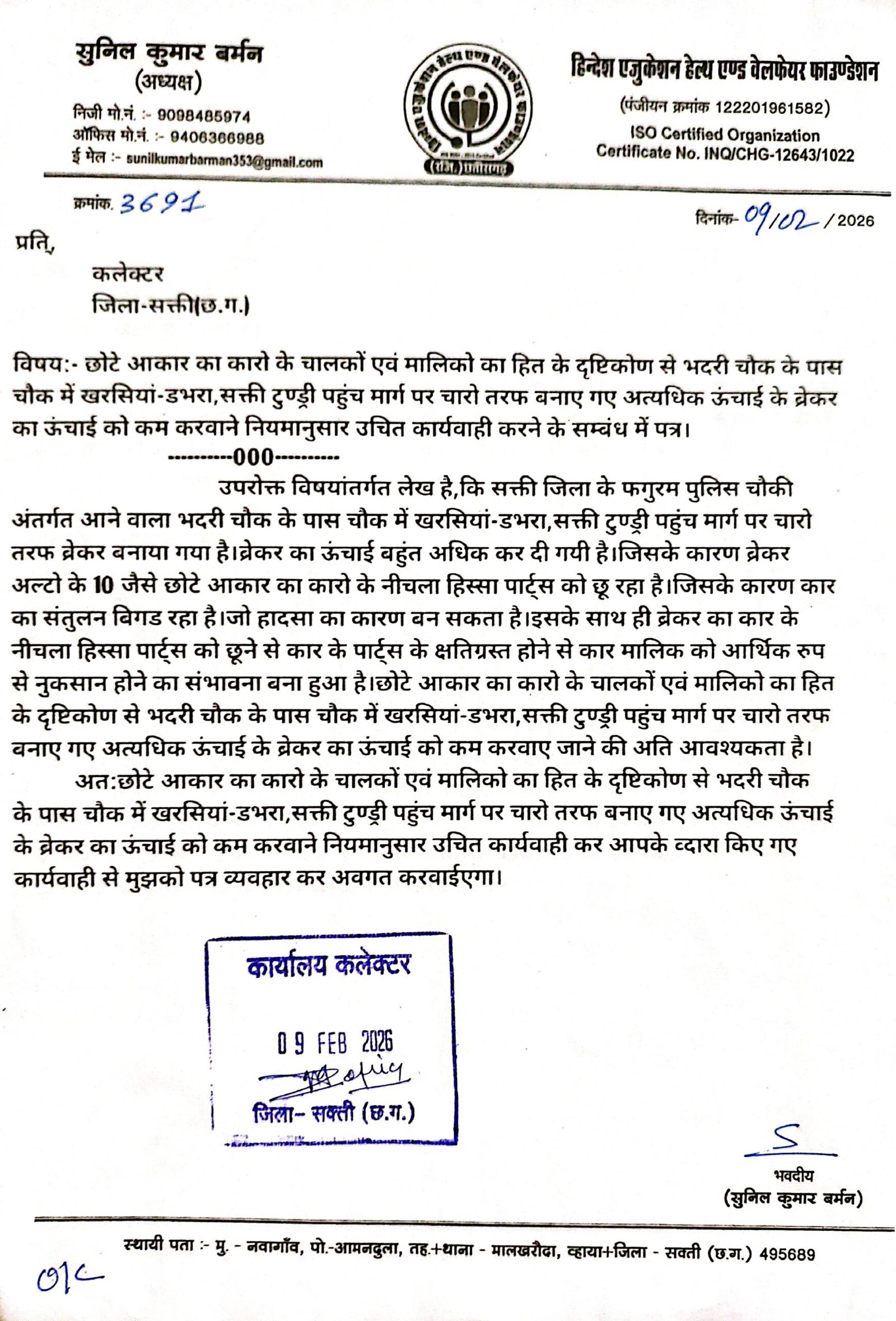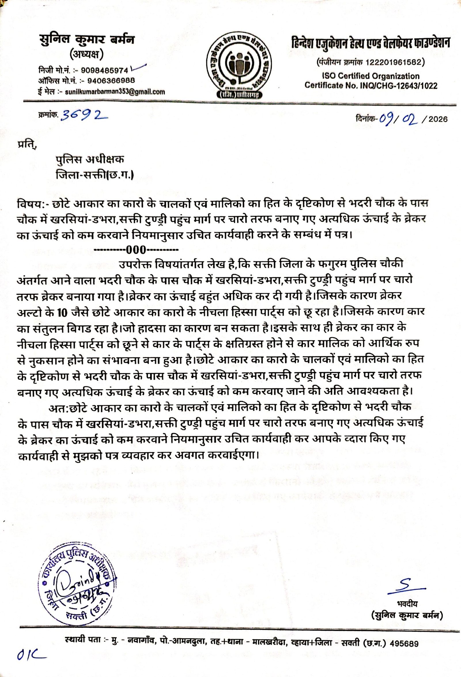 सक्ती(एचकेपी 24 न्यूज)।सडक हादसा कम करने का मंशा से बनाए गए भदरी चौक फगुरम मे सक्ती-टुण्ड्री एवं डभरा-खरसियां पहुंच मार्ग पर चारो दिशाओ मे चार नग ब्रेकर अधिक ऊंचाई एवं चौडाई आवश्यकतानुसार कम होने के कारण कार वाहन मालिको के लिए परेशानी का सबब बना हुआ है।अधिक ऊंचाई का ब्रेकर से कार को पार करने के दौरान कार का निचला हिस्सा (Under Body) को ब्रेकर का छूने से कार के एग्जॉस्ट सिस्टम,ऑयल पैन,सस्पेंशन या फ्यूल टैंक को नुकसान पहुंचने का संभावना बना हुआ है।हिन्देश एजुकेशन हेल्थ एण्ड वेलफेयर फाउण्डेशन के अध्यक्ष सुनिल कुमार बर्मन ने ब्रेकर का ऊंचाई को कम करवाने नियमानुसार उचित कार्यवाही करने कलेक्टर एवं एसपी को पत्र लिखा है।