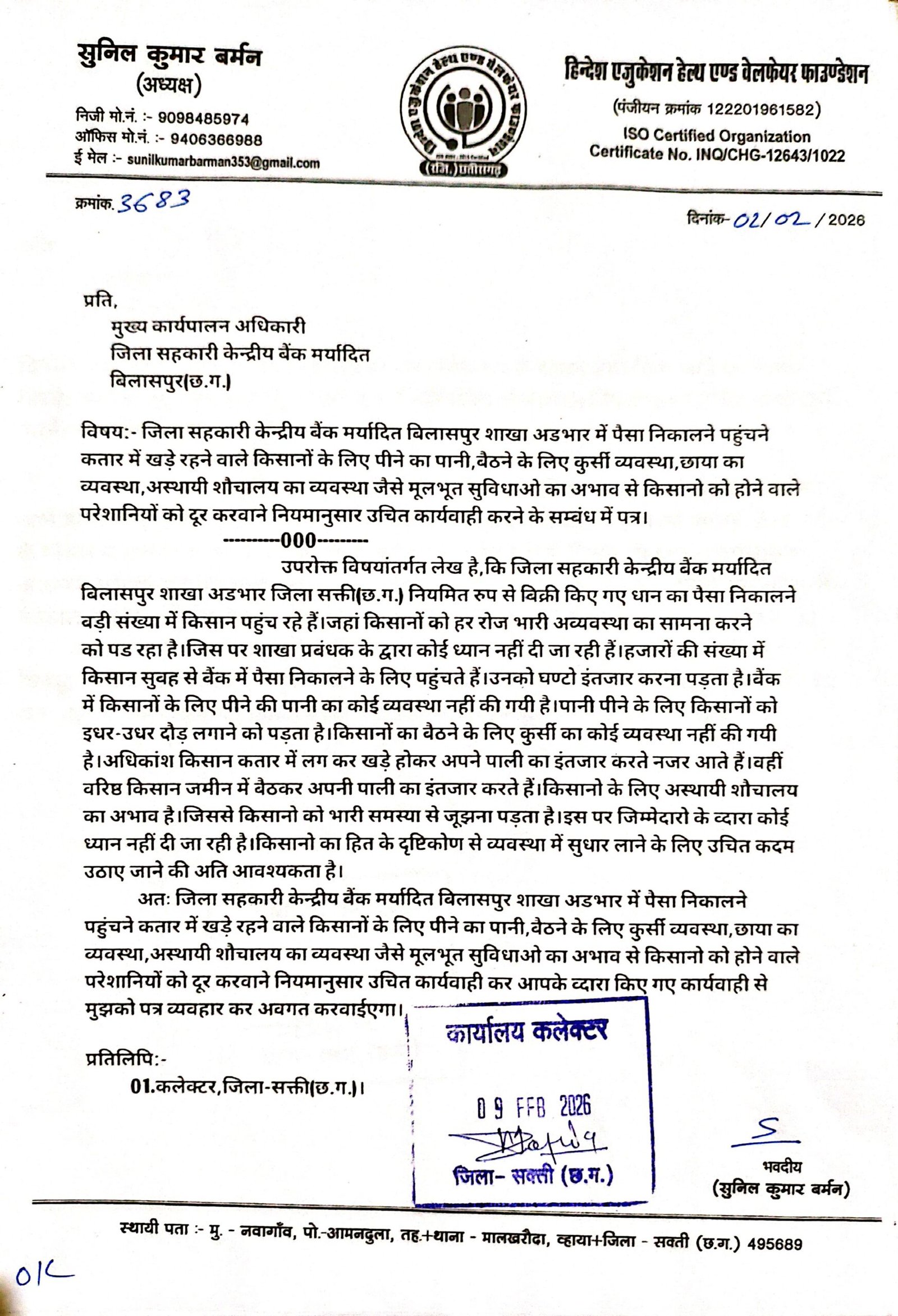 सक्ती(एचकेपी 24 न्यूज)।जिला सहकारी केन्द्रीय बैंक मर्यादित बिलासपुर शाखा अडभार मे बिक्री किए गए धान का राशि लेने पहुंचने वाले किसानो के मूलभूत आवश्यक सुविधाओ का ध्यान नही रखा जा रहा है।धान बिक्री करने के दौरान मशक्कत करने के पश्चात् अब किसान बैंक से राशि निकालने भारी मशक्कत करने को मजबूर हो रहे है।जिला सहकारी केन्द्रीय बैंक का शाखा मे किसानो का बैठने के लिए पर्याप्त कुर्सी का अभाव,अस्थायी शौचालय का अभाव,पीने के लिए स्वच्छ पानी का अभाव एवं शाखा के बाहर छाया का अभाव है।शाखा मे किसानो को आवश्यक मूलभूत सुविधाएं मुहैय्या करवाने नियमानुसार उचित कार्यवाही करने हिन्देश एजुकेशन हेल्थ एण्ड वेलफेयर फाउण्डेशन के अध्यक्ष सुनिल कुमार बर्मन ने जिला सहकारी केन्द्रीय बैंक मर्यादित बिलासपुर के सीईओ को पत्र लिखा है।
