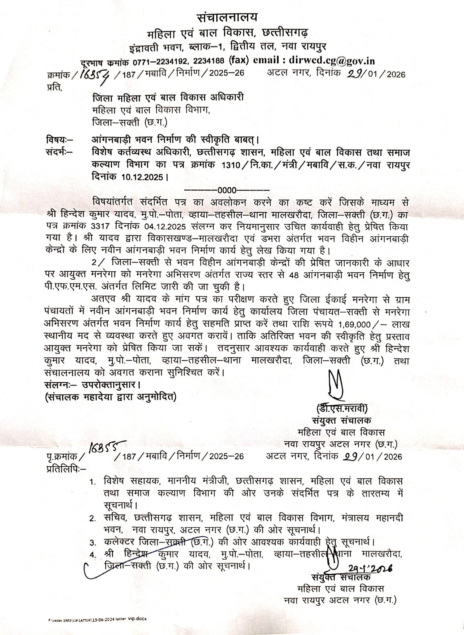 मालखरौदा-डभरा(एचकेपी 24 न्यूज)।एकीकृत बाल विकास परियोजना मालखरौदा एवं डभरा अंतर्गत संचालित होने वाले शासकीय भवन विहीन आंगनबाड़ी केन्द्रो के लिए नौनिहालो का हित के दृष्टिकोण से आंगनबाड़ी केन्द्र भवन नव निर्माण कार्य करवाने हिन्देश एजुकेशन हेल्थ एण्ड वेलफेयर फाउण्डेशन (रजिस्टर्ड) के फाउण्डर सह डायरेक्टर हिन्देश कुमार यादव के व्दारा महिला एवं बाल विकास मंत्री छ.ग.शासन को पत्र लिखे जाने के पश्चात् संयुक्त संचालक ने शासकीय भवनविहीन आंगनबाड़ी केन्द्र के लिए आंगनबाड़ी केन्द्र भवन नवनिर्माण कार्य करवाने हेतु जिला महिला एवं बाल विकास अधिकारी को जिला स्तर से आवश्यक प्रक्रिया रिपोर्ट तैयार कर संचालनालय को प्रेषित करने पत्र जारी किया है।