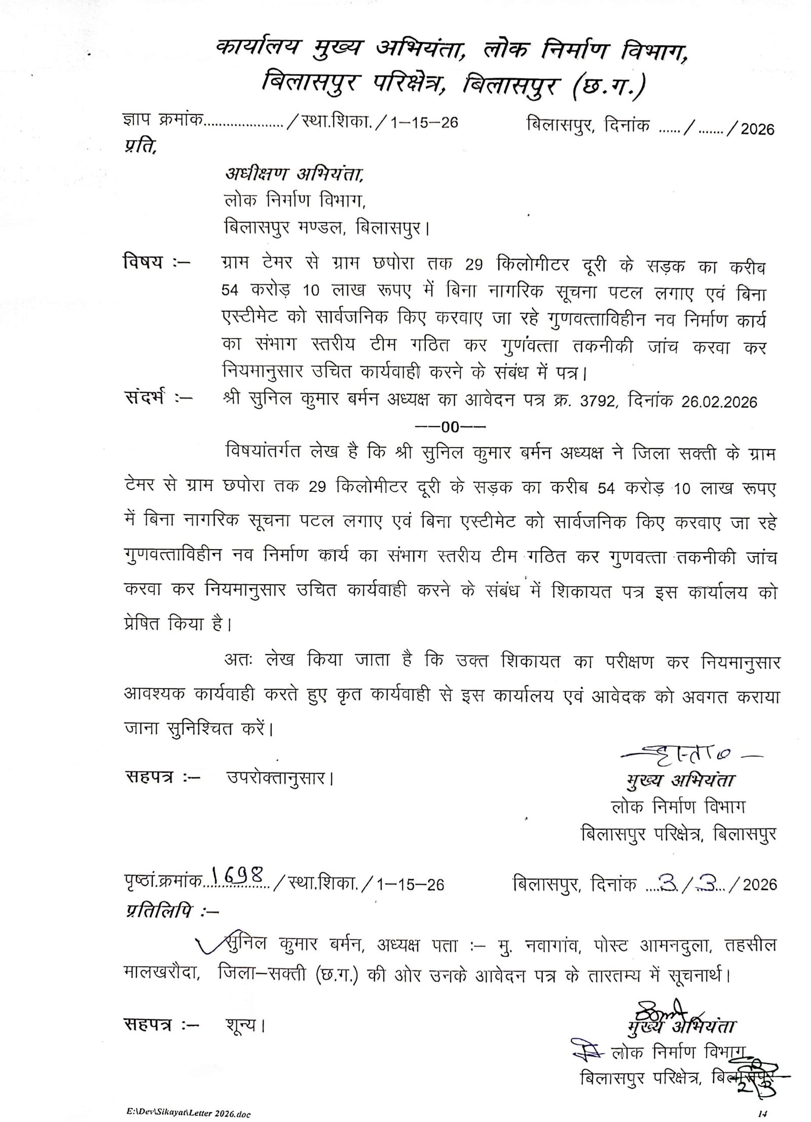 सक्ती(एचकेपी 24 न्यूज)।ग्राम टेमर से ग्राम छपोरा तक 29 किलोमीटर दूरी के सड़क का करीब 54 करोड़ 10 लाख रुपए की लागत से बीना नागरीक सूचना पटल लगाए एवं बीना एस्टीमेट को सार्वजनिक किए बनाए जा रहे सडक भ्रष्टाचार का भेंट चढ़ गया है।पुराना सड़क को उखाडे बीना ही पुराना सड़क के ऊपर ही सडक नव निर्माण कार्य किए जाने का तैयारी चल रहा है।निर्माणाधीन सड़क की गुणवत्ता तकनीकी जांच करवा कर सडक नव निर्माण कार्य गुणवत्तायुक्त करवाने नियमानुसार उचित कार्यवाही करने हिन्देश एजुकेशन हेल्थ एण्ड वेलफेयर फाउण्डेशन के अध्यक्ष सुनिल कुमार बर्मन के व्दारा पत्र लिखे जाने के पश्चात् मुख्य अभियंता पीडब्लूडी बिलासपुर परिक्षेत्र ने मामला का जांच कर नियमानुसार उचित कार्यवाही करने अधीक्षण अभियंता पीडब्लूडी बिलासपुर मण्डल को जांच अधिकारी नियुक्त किया है।