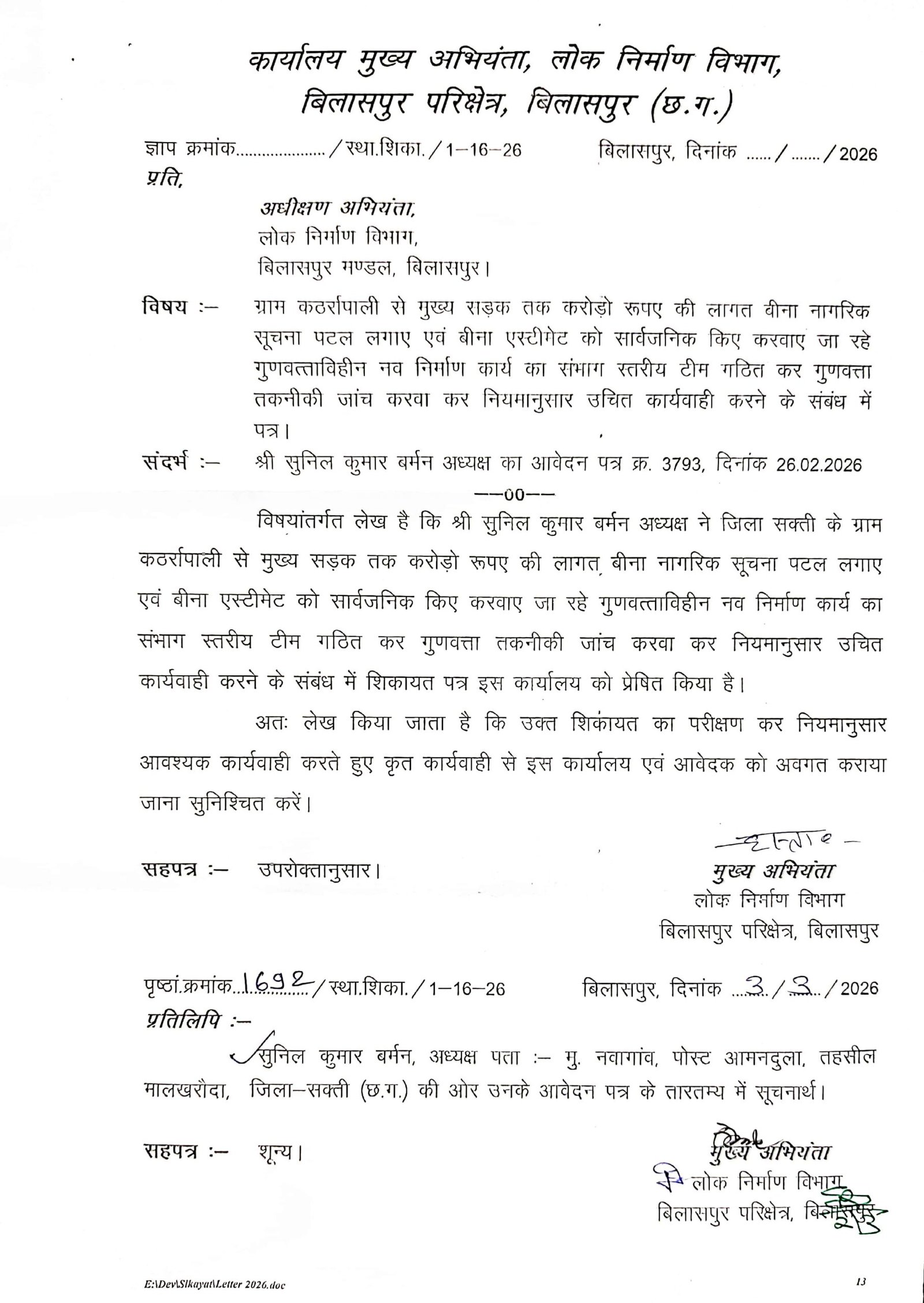 डभरा-सक्ती(एचकेपी 24 न्यूज)।ग्राम कठर्रापाली से मुख्य सड़क तक करोड़ो रुपए की लागत से बीना नागरिक सूचना पटल लगाए एवं बीना एस्टीमेट को सार्वजनिक किए गुणवत्ताविहीन सडक नव निर्माण कार्य करवाया जा रहा है। तय एस्टीमेट का अनदेखी कर मनमानी ढंग से सडक नव निर्माण कार्य की जा रही है।निर्माणाधीन सड़क की गुणवत्ता तकनीकी जांच करवा कर सडक नव निर्माण कार्य गुणवत्तायुक्त करवाने नियमानुसार उचित कार्यवाही करने हिन्देश एजुकेशन हेल्थ एण्ड वेलफेयर फाउण्डेशन के अध्यक्ष सुनिल कुमार बर्मन के व्दारा पत्र लिखे जाने के पश्चात् मुख्य अभियंता पीडब्लूडी बिलासपुर परिक्षेत्र ने मामला का जांच कर नियमानुसार उचित कार्यवाही करने अधीक्षण अभियंता पीडब्लूडी बिलासपुर मण्डल को जांच अधिकारी नियुक्त किया है।