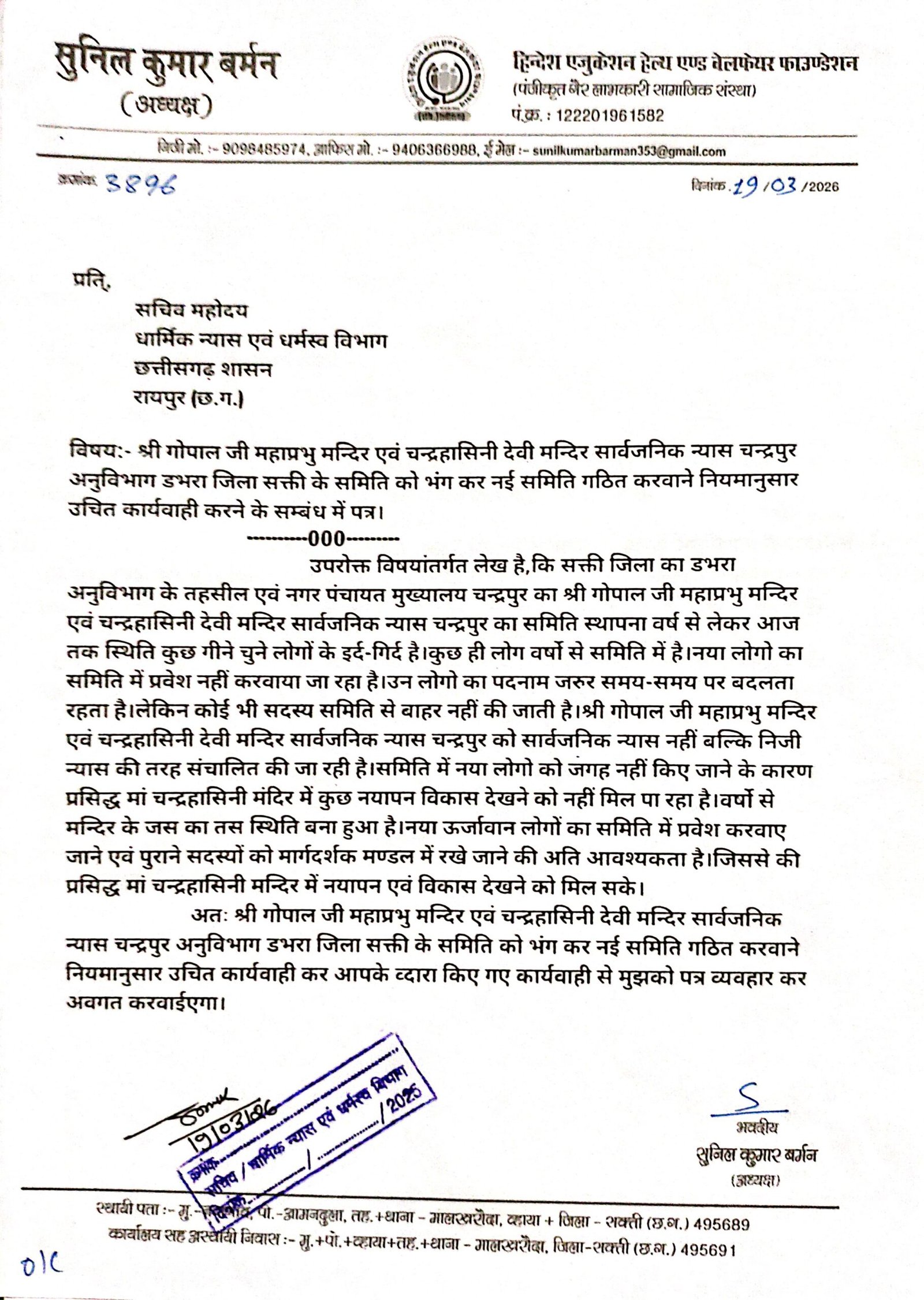 डभरा-सक्ती(एचकेपी 24 न्यूज)।श्री गोपाल जी महाप्रभु मन्दिर एवं प्रसिद्ध मां चन्द्रहासिनी देवी मन्दिर सार्वजनिक न्यास चन्द्रपुर के पुराने 11 सदस्यीय समिति को भंग कर 20-22 सदस्यीय नई समिति का गठन करवाने महानदी भवन मंत्रालय स्तर से नियमानुसार उचित कार्यवाही करने हिन्देश एजुकेशन हेल्थ एण्ड वेलफेयर फाउण्डेशन के अध्यक्ष सुनिल कुमार बर्मन ने सचिव धार्मिक न्यास एवं धर्मस्व विभाग छत्तीसगढ़ शासन को पत्र लिखा है।