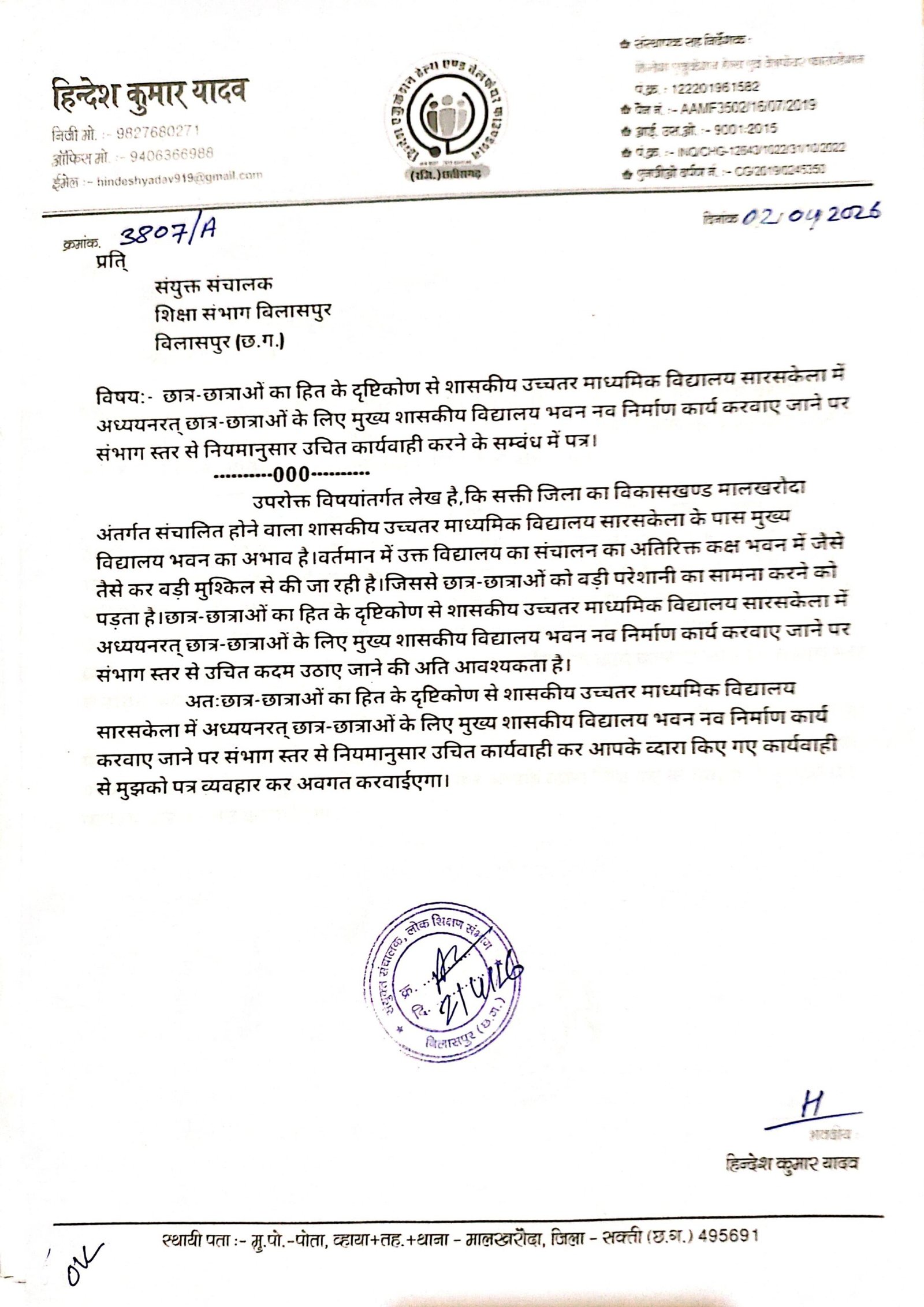 सक्ती-मालखरौदा(एचकेपी 24 न्यूज)।मुख्य शाला भवन का अभाव से शासकीय उच्चतर माध्यमिक विद्यालय सारसकेला के छात्र-छात्राए परेशान है।अतिरिक्त कक्ष भवन मे जैसे जैसे कर अध्यापन कार्य करने को सैकडो छात्र-छात्राए मजबूर है।मुख्य शाला भवन नव निर्माण करवा कर छात्र-छात्राओ के मुख्य शाला भवन सम्बंधित समस्या का निराकरण करवाने संभाग स्तर से नियमानुसार उचित करने संयुक्त संचालक शिक्षा संभाग बिलासपुर को हिन्देश एजुकेशन हेल्थ एण्ड वेलफेयर फाउण्डेशन के संस्थापक सह निर्देशक हिन्देश कुमार यादव ने पत्र लिखा है।
