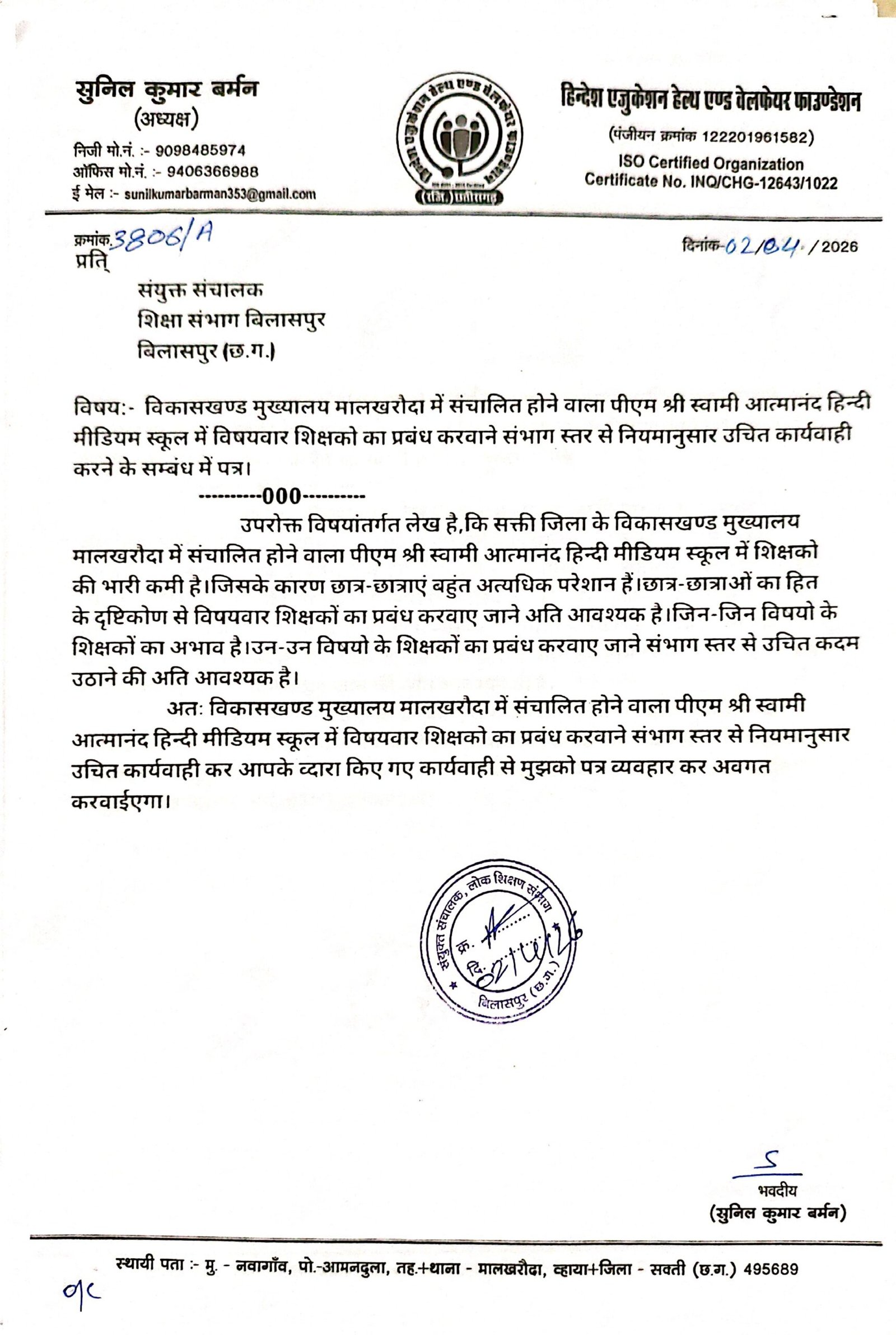 मालखरौदा-सक्ती(एचकेपी 24 न्यूज)।पीएमश्री स्कूल स्वामी आत्मानंद हिन्दी मीडियम स्कूल मालखरौदा मे व्याप्त विषयवार शिक्षको की अभाव से परेशान छात्र-छात्राओ का समस्या के निराकरण करवाने संभाग स्तर से नियमानुसार उचित कार्यवाही करने हिन्देश एजुकेशन हेल्थ एण्ड वेलफेयर फाउण्डेशन के अध्यक्ष सुनिल कुमार बर्मन ने संयुक्त संचालक शिक्षा संभाग बिलासपुर को पत्र लिखा है।