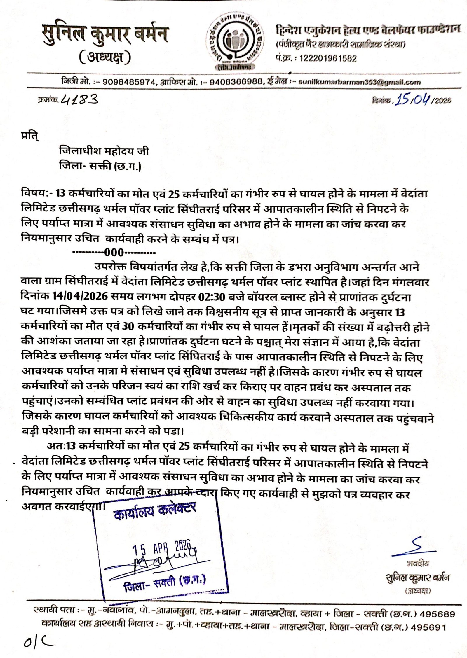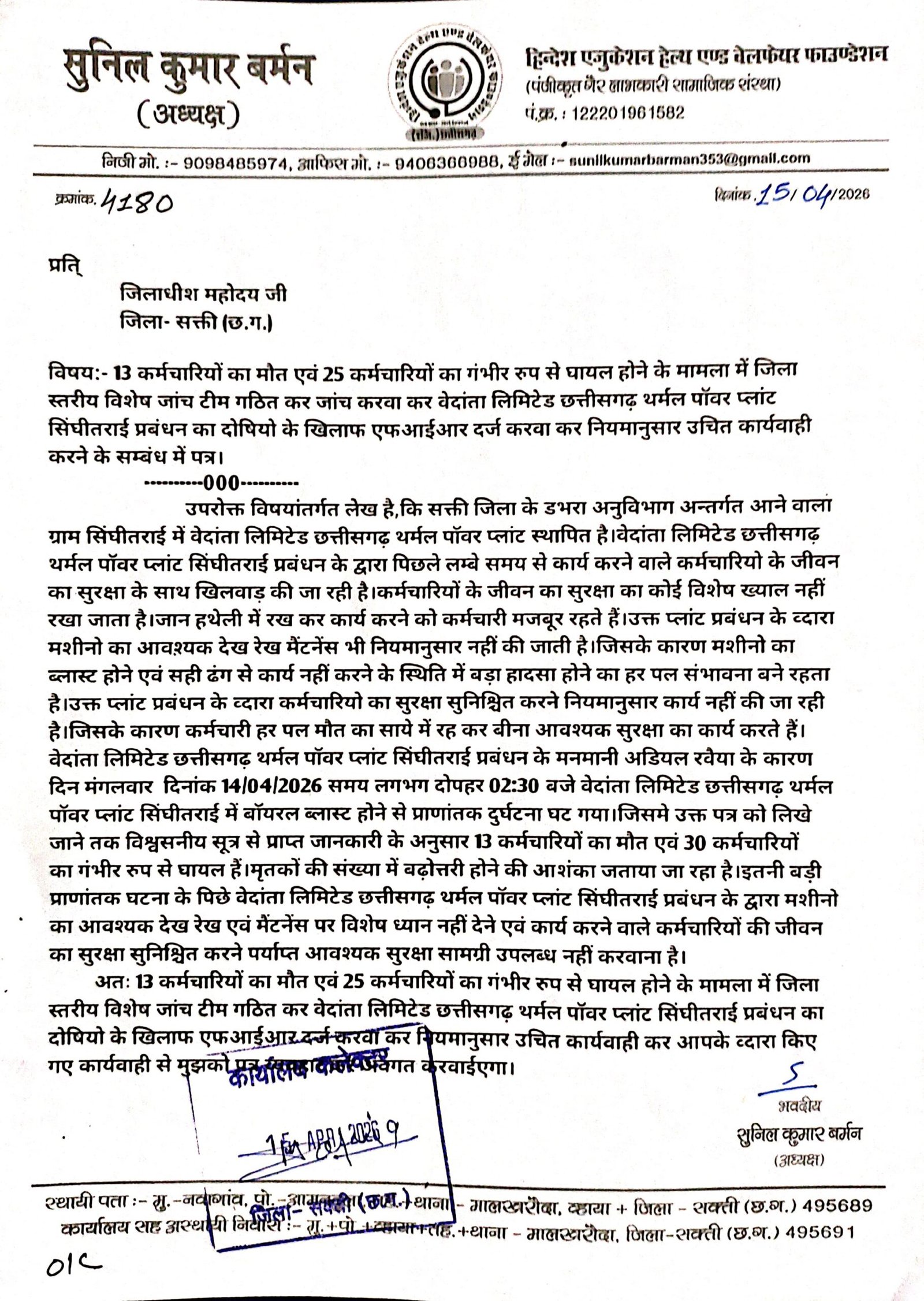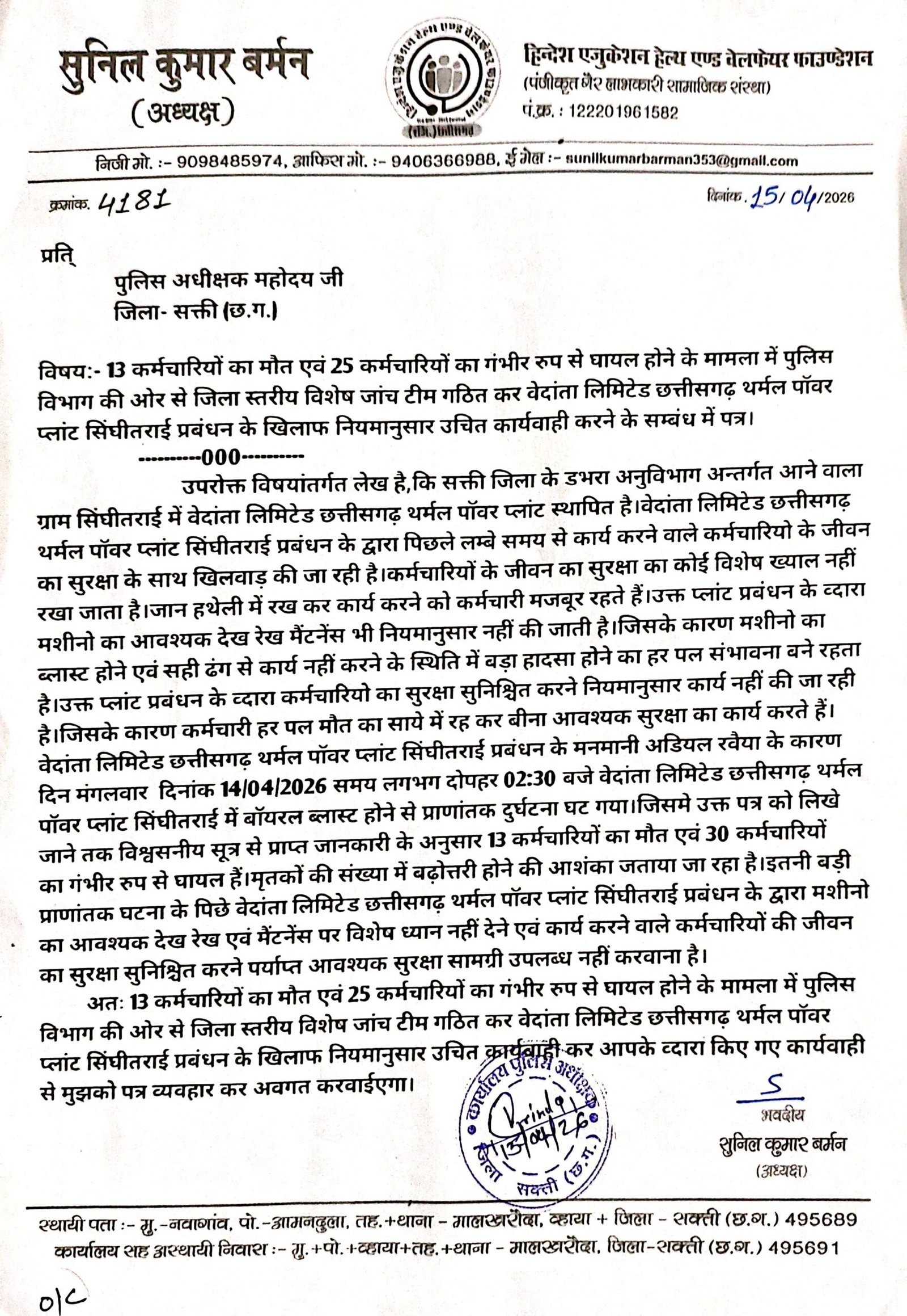 डभरा-सक्ती(एचकेपी 24 न्यूज)।वेदांता लिमिटेड छत्तीसगढ़ थर्मल पॉवर प्लांट सिंघीतराई मे कर्मचारियों का मौत एवं करीब दो दर्जन से भी अधिक कर्मचारियो का गंभीर रुप से घायल होने के मामला मे दोषियो के खिलाफ एफआईआर दर्ज करवाने,सम्बंधित प्लांट प्रबंधन के खिलाफ नियमानुसार उचित कार्यवाही करने,आपतकालीन स्थिति से निपटने के लिए आवश्यक संसाधन सुविधा के उपलब्धता का जांच करवाने,कर्मचारियों का जीवन सुरक्षा सुनिश्चित करने उपलब्ध सामग्रियों का जांच करवाने एवं प्राणातांक दुर्घटना घटित ड्यूटीरत् समस्त कर्मचारियों का हाल चाल लेने सत्यापन करने हिन्देश एजुकेशन हेल्थ एण्ड वेलफेयर फाउण्डेशन के अध्यक्ष सुनिल कुमार बर्मन ने कलेक्टर एवं एसपी को पत्र लिखा है।
