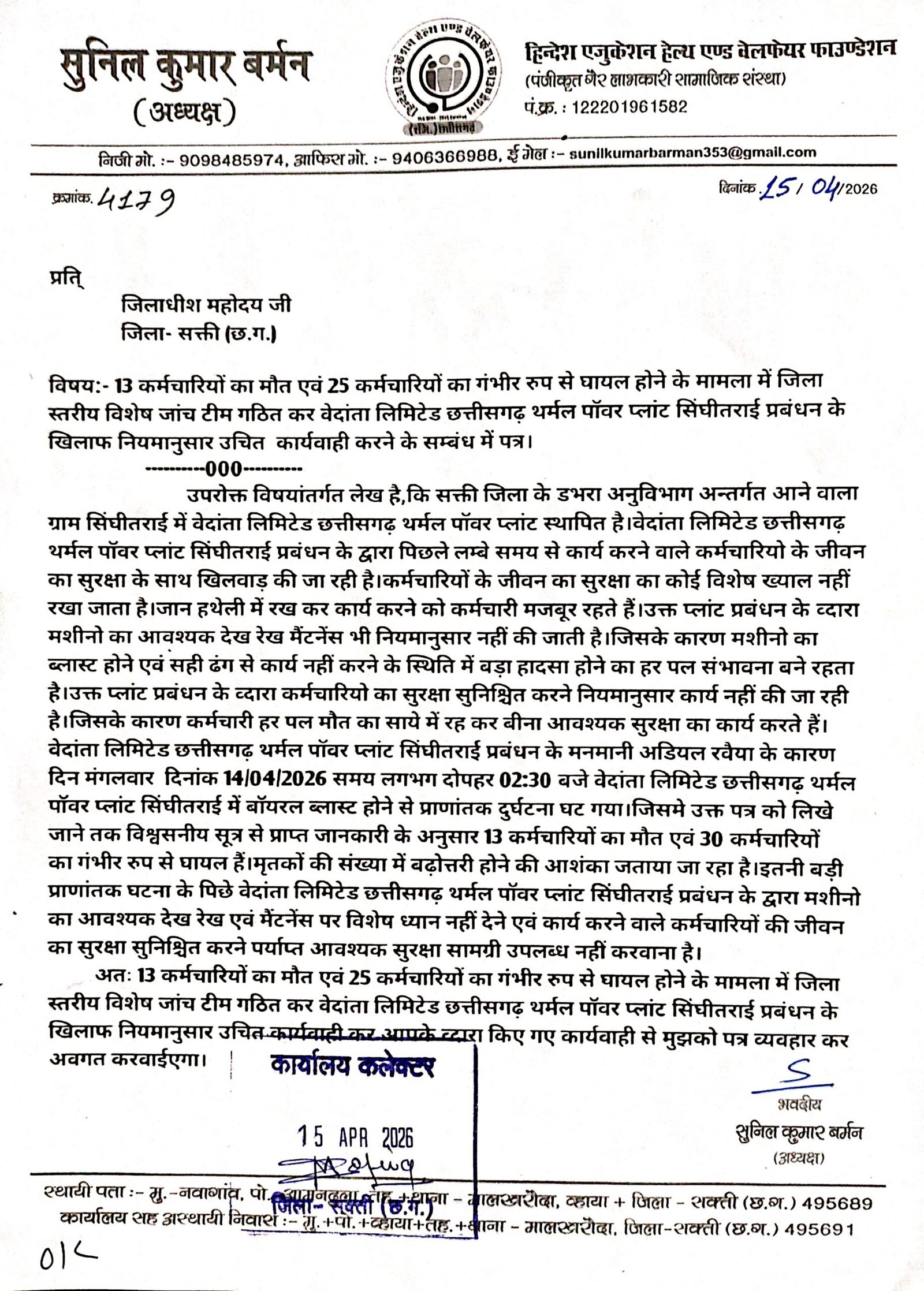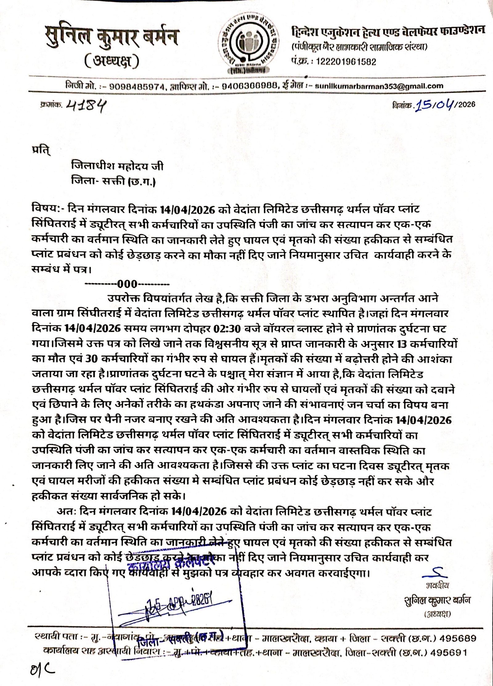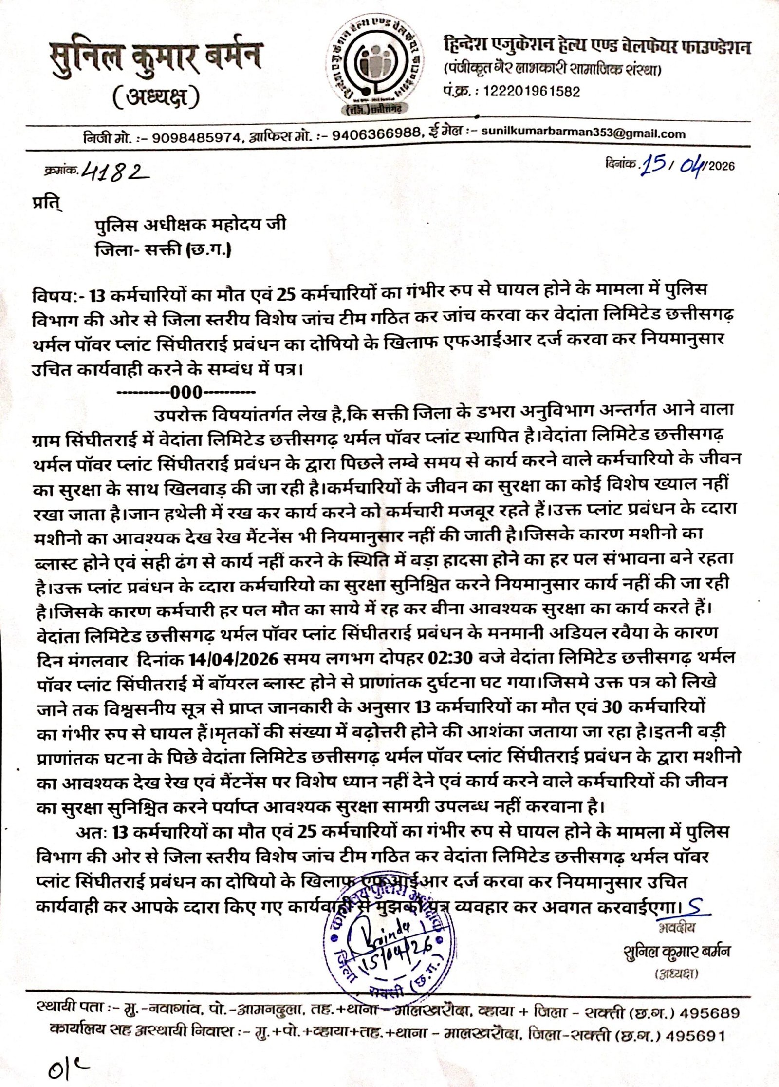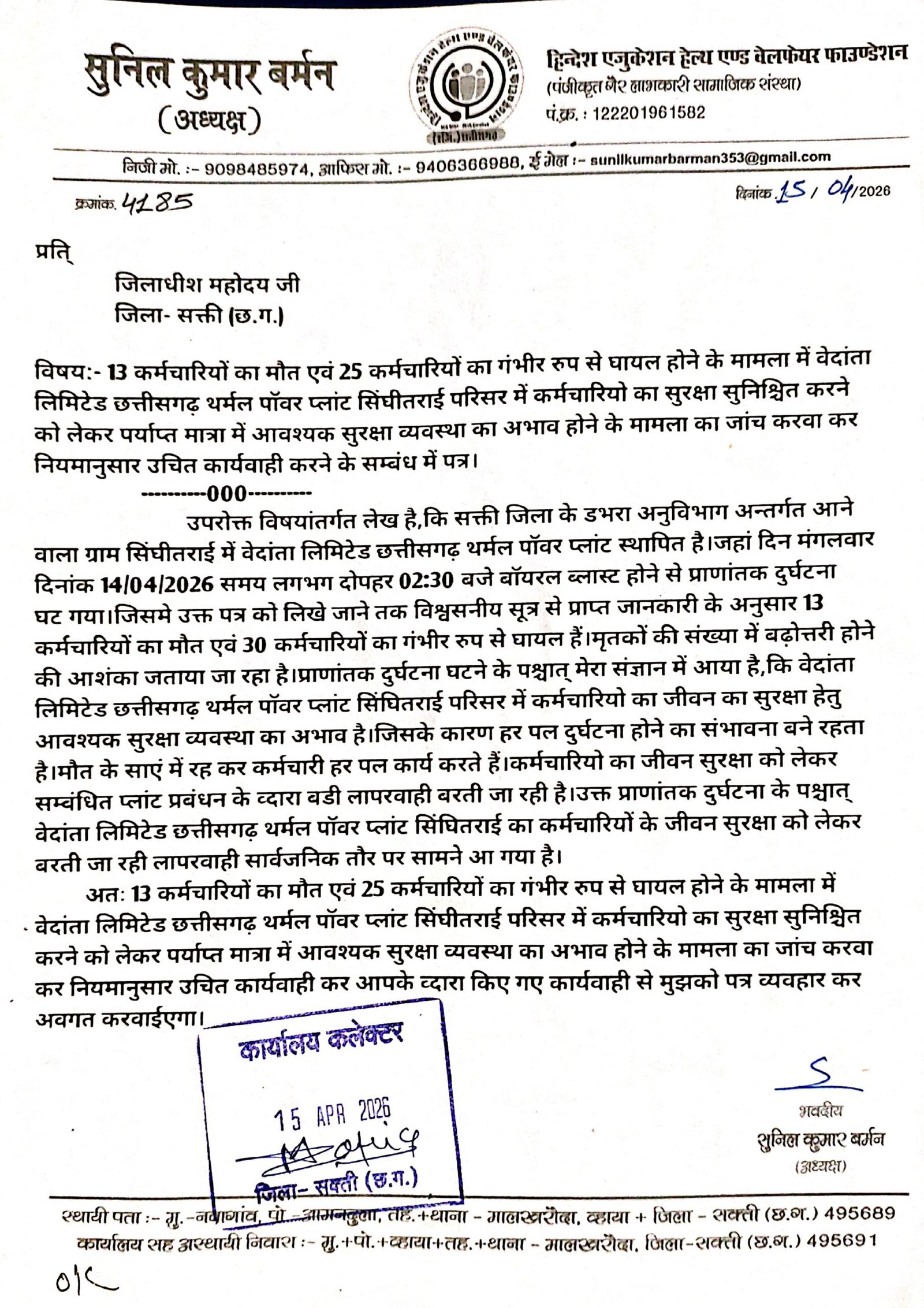डभरा-सक्ती(एचकेपी 24 न्यूज)।वेदांता लिमिटेड छत्तीसगढ़ थर्मल पॉवर प्लांट सिंघीतराई मे कर्मचारियों का मौत एवं करीब दो दर्जन से भी अधिक कर्मचारियो का गंभीर रुप से घायल होने के मामला मे दोषियो के खिलाफ एफआईआर दर्ज करवाने,सम्बंधित प्लांट प्रबंधन के खिलाफ नियमानुसार उचित कार्यवाही करने,आपतकालीन स्थिति से निपटने के लिए आवश्यक संसाधन सुविधा के उपलब्धता का जांच करवाने,कर्मचारियों का जीवन सुरक्षा सुनिश्चित करने उपलब्ध सामग्रियों का जांच करवाने एवं प्राणातांक दुर्घटना घटित ड्यूटीरत् समस्त कर्मचारियों का हाल चाल लेने सत्यापन करने हिन्देश एजुकेशन हेल्थ एण्ड वेलफेयर फाउण्डेशन के अध्यक्ष सुनिल कुमार बर्मन ने कलेक्टर एवं एसपी को पत्र लिखा है।