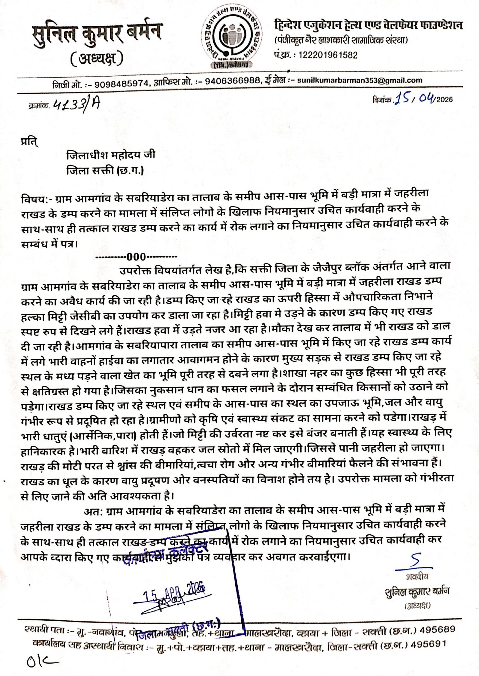 जैजैपुर-सक्ती(एचकेपी 24 न्यूज)।आमगांव का सबरियाडेरा के तालाब समीप आस-पास का भूमि मे जहरीला राखड डम्प की जा रही है।जहरीला राखड डम्प किए जाने का कार्य मे संलिप्त लोगो के खिलाफ नियमानुसार उचित कार्यवाही करने एवं राखड डम्पिंग कार्य पर रोक लगाने नियमानुसार उचित कार्यवाही करने हिन्देश एजुकेशन हेल्थ एण्ड वेलफेयर फाउण्डेशन के अध्यक्ष सुनिल कुमार बर्मन ने कलेक्टर को पत्र लिखा है।