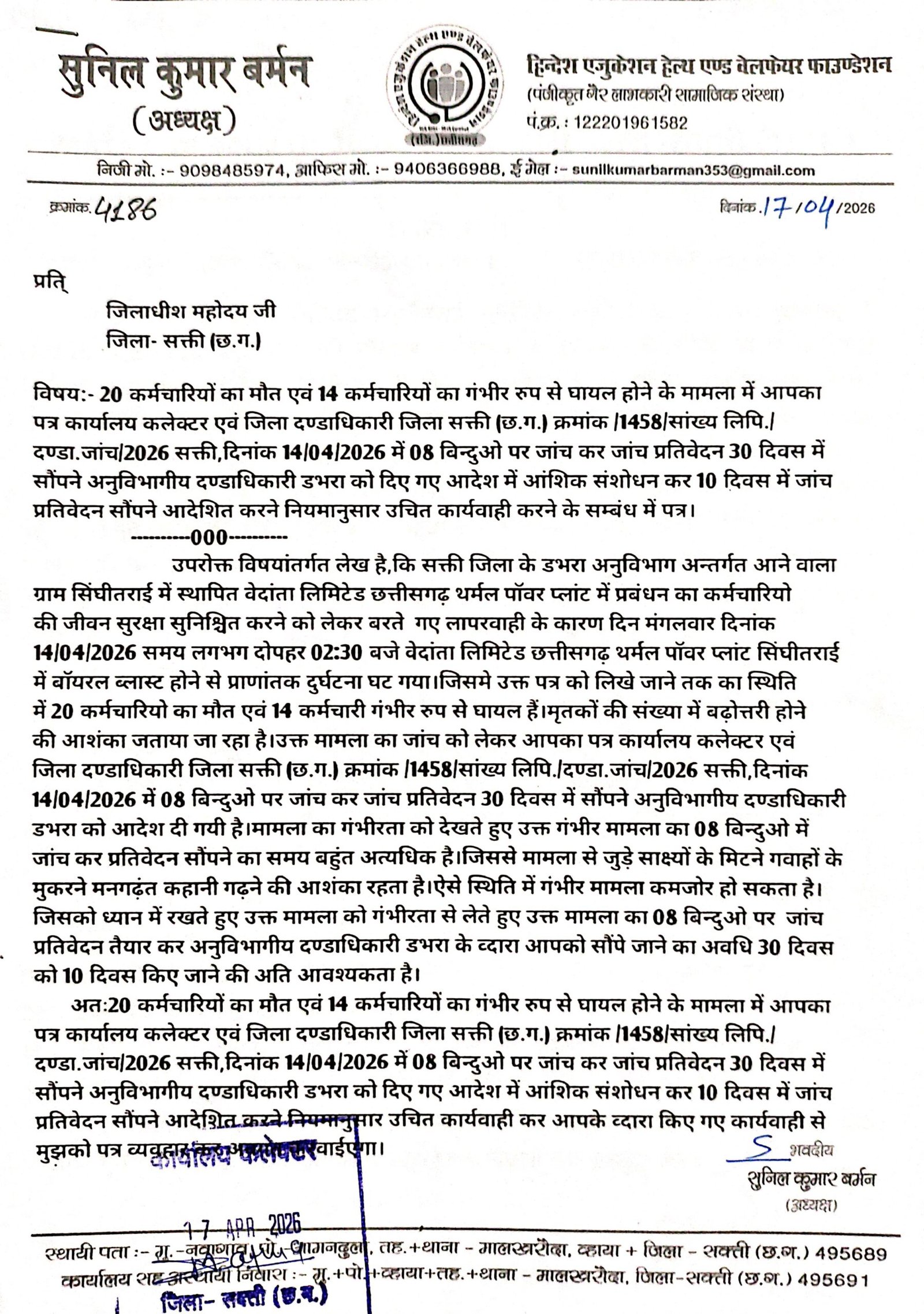 डभरा-सक्ती(एचकेपी 24 न्यूज)।20 कर्मचारियों का मौत एवं 14 कर्मचारियों का गंभीर रुप से घायल होने के मामला में कार्यालय कलेक्टर एवं जिला दण्डाधिकारी जिला सक्ती (छ.ग.) क्रमांक /1458/सांख्य लिपि./दण्डा.जांच/2026 सक्ती,दिनांक 14/04/2026 में 08 बिन्दुओ पर जांच कर जांच प्रतिवेदन 30 दिवस में सौंपने अनुविभागीय दण्डाधिकारी डभरा को दिए गए आदेश में अधिक समय तक जांच प्रक्रिया कर रिपोर्ट तैयार करने से साक्ष्य सबूत के मिटने एवं गंभीर मामला का कमजोर होने के संभावना को ध्यान मे रखते हुए आंशिक संशोधन कर 10 दिवस के भीतर में आगे का कार्यवाही करने हेतु जांच प्रतिवेदन सौंपने आदेशित कर नियमानुसार उचित कार्यवाही करने हिन्देश एजुकेशन हेल्थ एण्ड वेलफेयर फाउण्डेशन के अध्यक्ष सुनिल कुमार बर्मन ने कलेक्टर को पत्र लिखा है।
