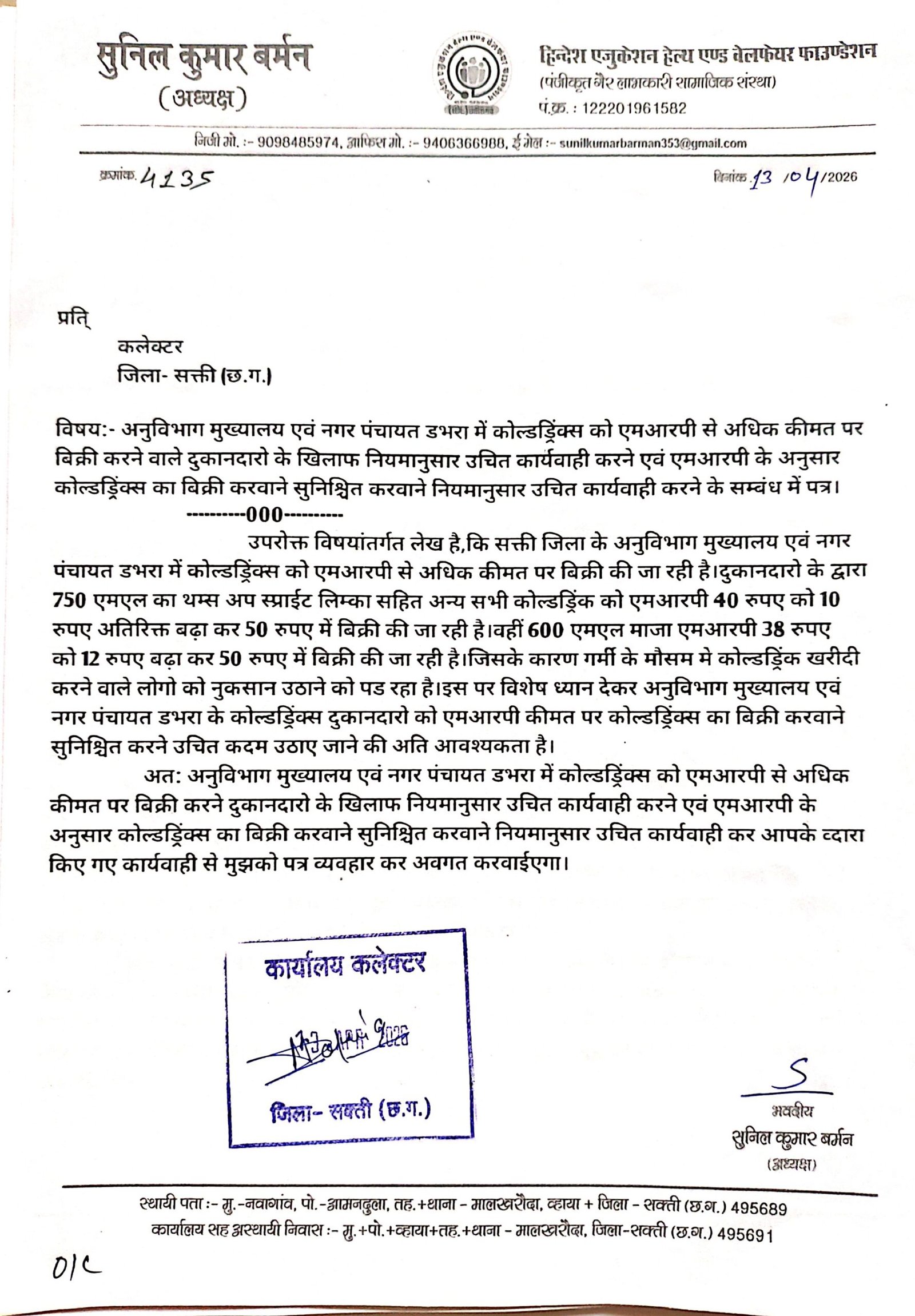 डभरा-सक्ती(एचकेपी 24 न्यूज)।एमआरपी से 10-15 रुपए अतिरिक्त रुपए मे कोल्डड्रिंक का बिक्री का बिक्री नगर पंचायत डभरा के कोल्डड्रिंक विक्रेता दुकानदार कर रहे है।कोल्डड्रिंक का बिक्री एमआरपी से अतरिक्त रुपए मे करने वाले दुकानदारो के खिलाफ नियमानुसार उचित कार्यवाही करने एवं एमआरपी पर कोल्डड्रिंक का बिक्री करने सुनिश्चित करवाने हिन्देश एजुकेशन हेल्थ एण्ड वेलफेयर फाउण्डेशन के अध्यक्ष सुनिल कुमार बर्मन ने कलेक्टर को पत्र लिखा है।